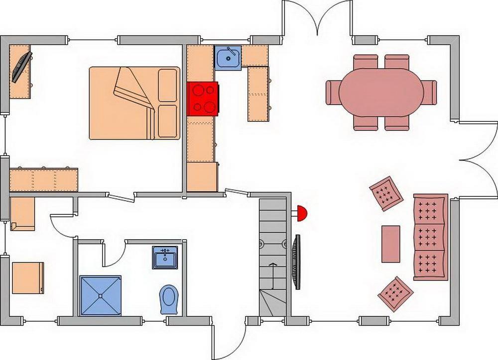 Erdgeschoss: Eingangsbereich, Wohnraum mit offener Küche, Kamin und Zugang zu den Terrassen, ein Schlafzimmer mit Doppelbett (180 x 200 cm - Einzelmatratzen), ein Duschbad / WC, ein Hauswirtschaftsraum mit Waschmaschine und Trockner