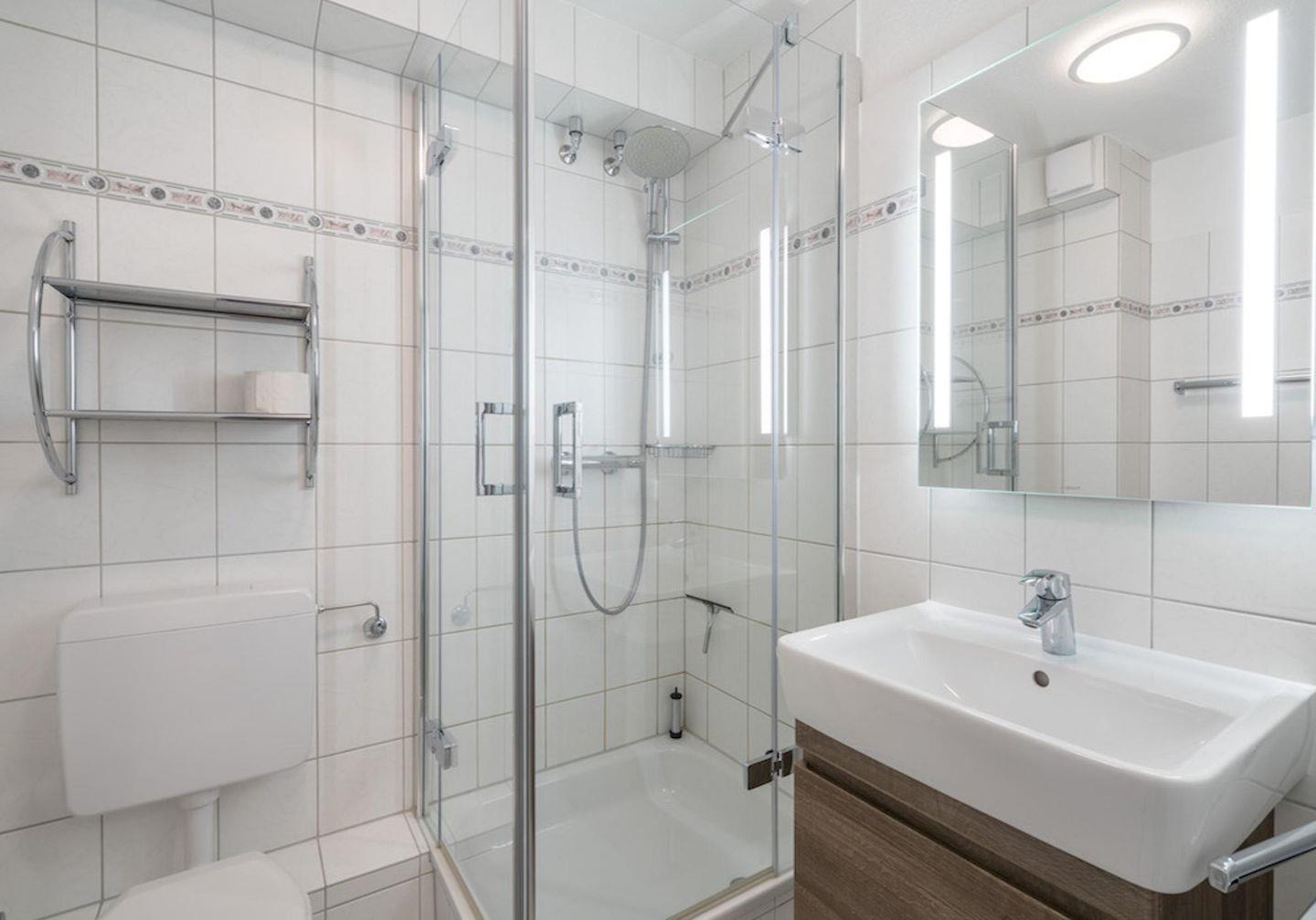 Das Badezimmer besteht aus einer Dusche, Waschbecken und WC.