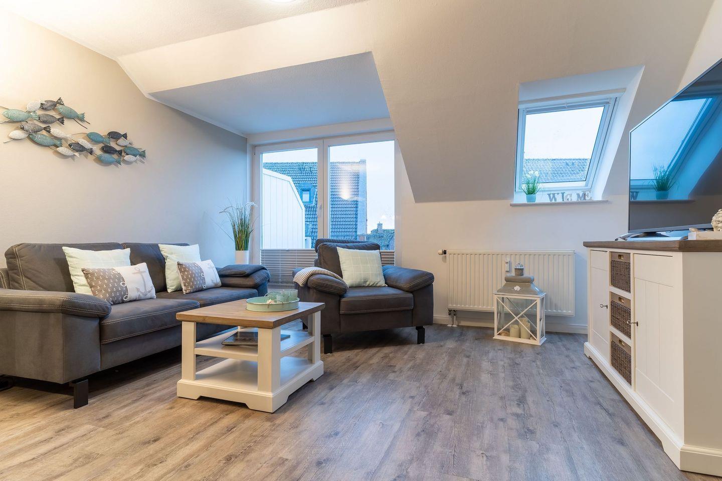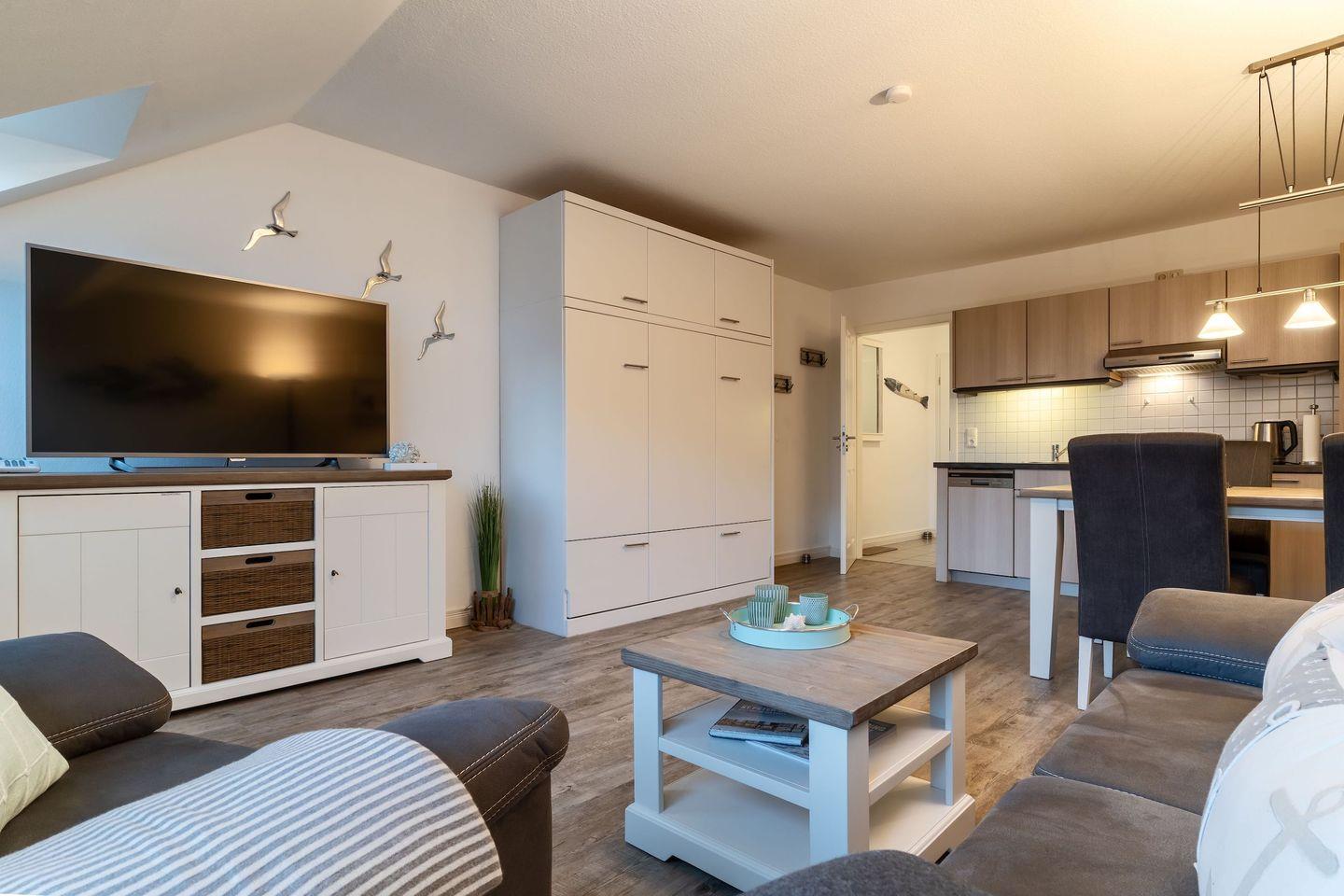 Zur Unterhaltung im Wohnzimmer dient ein 55K Sat-TV Flachbildschirm, sowie WLAN (inklusive).