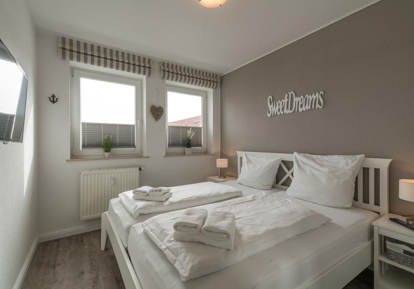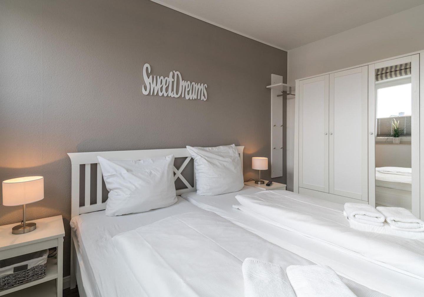 Das Schlafzimmer mit 2 Nachttischen und Kleiderschrank bietet Ihnen ein Doppelbett (2,00 x 1,80 m) und einen Sat TV Flachbildschirm.