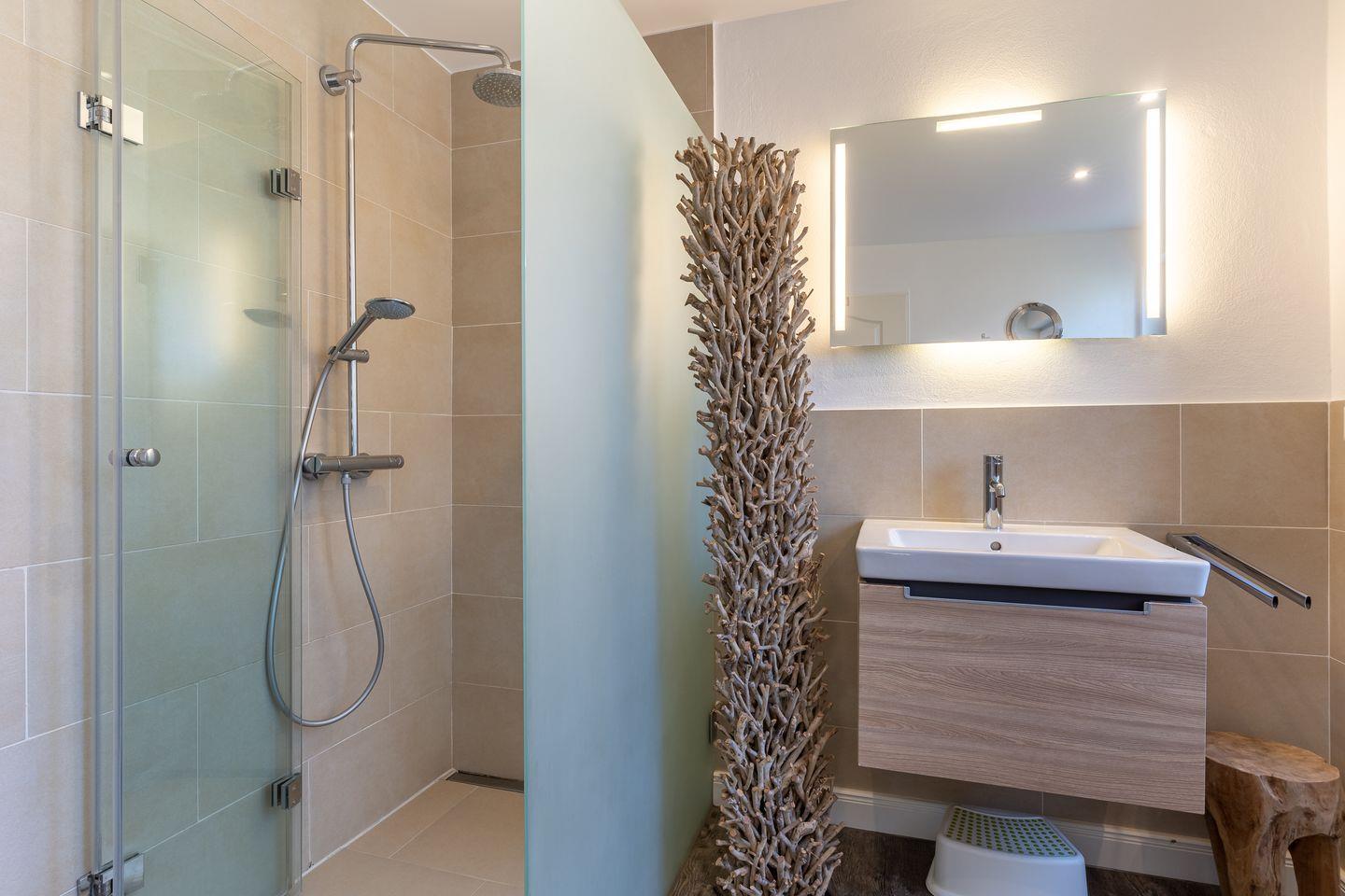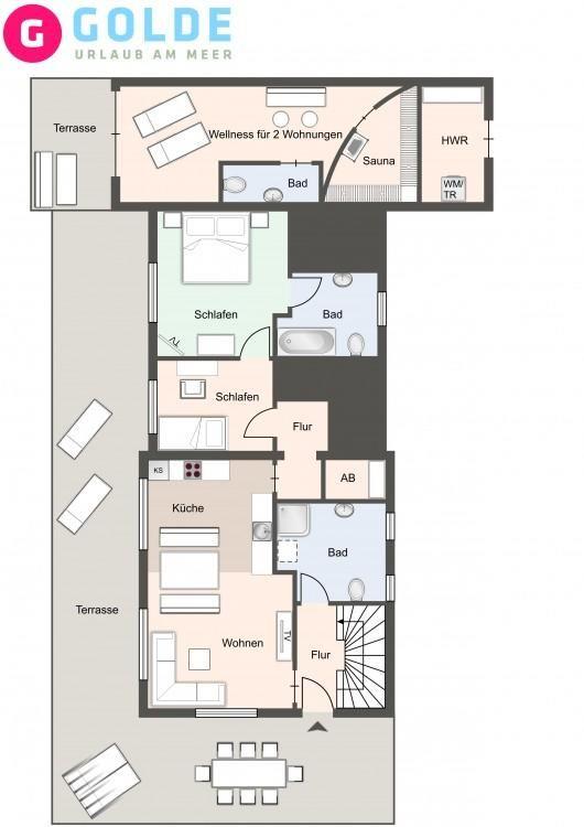 Über einen weiteren Flur gelangen Sie zu dem Doppelschlafzimmer mit Ausziehbett jeweils 2x 80er Matratzen, außerdem einem weiteren Doppelschlafzimmer mit jeweils 2x90er Matratzen und LED TV sowie einem Vollbad. Über eine wunderhübsche Holztreppe gelangt man in das Obergeschoss mit zwei weiteren Schlafzimmern. Eins verfügt über ein Doppelbett mit jeweils 2x 80er Matratzen und LED TV, das andere Schlafzimmer verfügt über 2 Einzelbetten mit je einer 90er Matratze. In einem separaten wunderschönen Anbau lädt der große Wellnessraum mit Sauna, Ruhezone, Dusche, WC und eingezäunter Terrasse zur Erholung ein. Traumhaft schön und einzigartig in SPO! (Nutzbar von 2 Appartements im Haus gegen Gebühr) Carpe Diem!