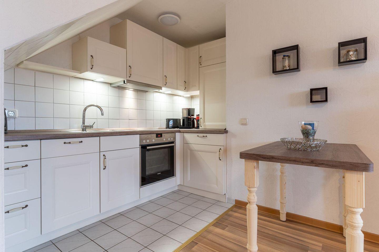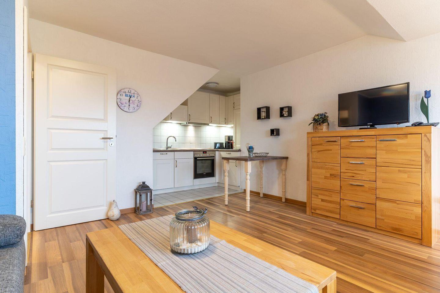 Der helle Wohnbereich der Ferienunterkunft besteht aus einer Couch und Couchtisch sowie zwei Sesseln. Des weiteren ist ein Esstisch mit 4 Stühlen vorhanden. Die Küchenzeile des Hauses ist ausgestattet mit einem Backofen mit Ceranfeld, Anrichte, Dunstabzugshaube, Geschirr, Kaffeemaschine, Kochtöpfe, Kühlschrank, Toaster und einem Wasserkocher.