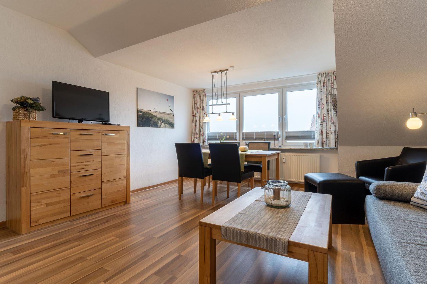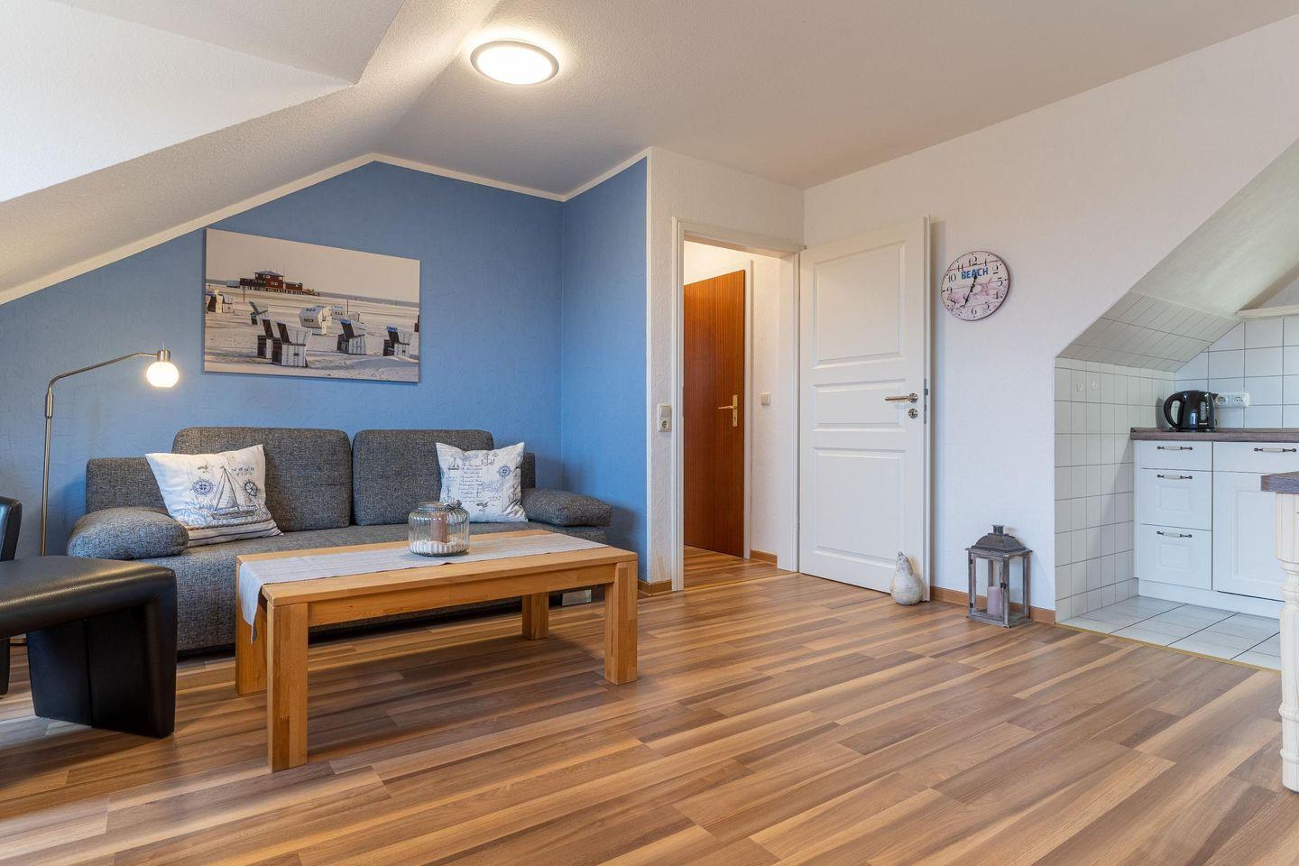 In dieser Wohnung im 2. Obergeschoss frühstücken Sie morgens schon zu viert mit einem spektakulären Blick über den Deich oder genießen den Sonnenuntergang am Abend bei einem Glas Wein. Die frisch modernisierten Wohn- und Schlafräume bieten komfortablen Platz für 2-4 Personen auf 54 qm und sind der ideale Ausgangspunkt für Ihren Urlaub.