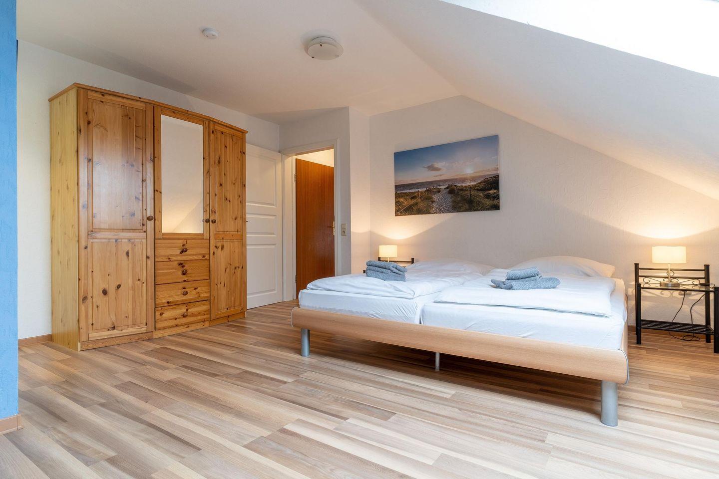 Das Schlafzimmer mit 2 Kommoden, 2 Nachttischen, Spiegel, Beistelltisch und Kleiderschrank verfügt über ein Doppelbett (2,00 x 1,80 m). Als weitere Schlafmöglichkeit dient Ihnen eine Schlafcouch. Das Badezimmer besteht aus einer Dusche, Waschbecken und WC. Zur Unterhaltung dient ein Sat-TV Flachbildschirm, Radio sowie WLAN (inklusive). Im Erdgeschoss befindet sich ein Fahrradabstellraum. Dieser kann von allen Feriengästen genutzt werden.
