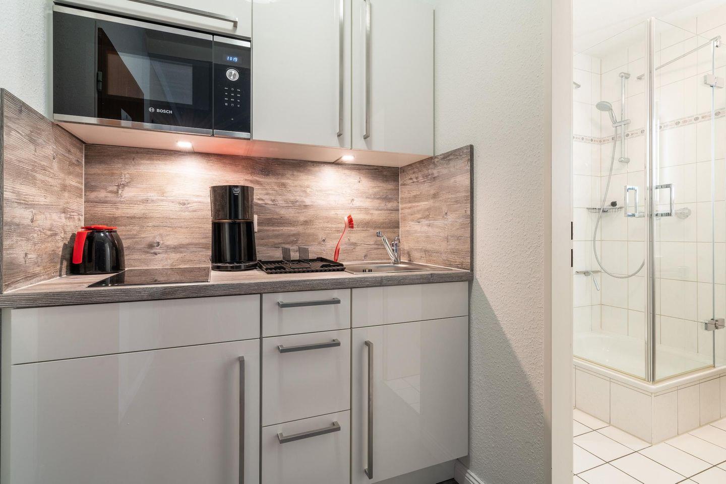 Die Ferienwohnung bietet auf 35 qm genügend Platz für 2 Personen. Das Wohnzimmer verfügt über eine Couch und Sessel des weiteren ist ein Couchtisch vorhanden. Auch ein Esstisch mit 4 Stühlen steht für Sie bereit. Die Küche ist ausgestattet mit einem Induktionsfeld, Geschirr, Kaffeemaschine, Kochtöpfe, Küchenzeile, Kühlschrank, Radio, Toaster, Minibackofen, Mikrowelle und einem Wasserkocher.