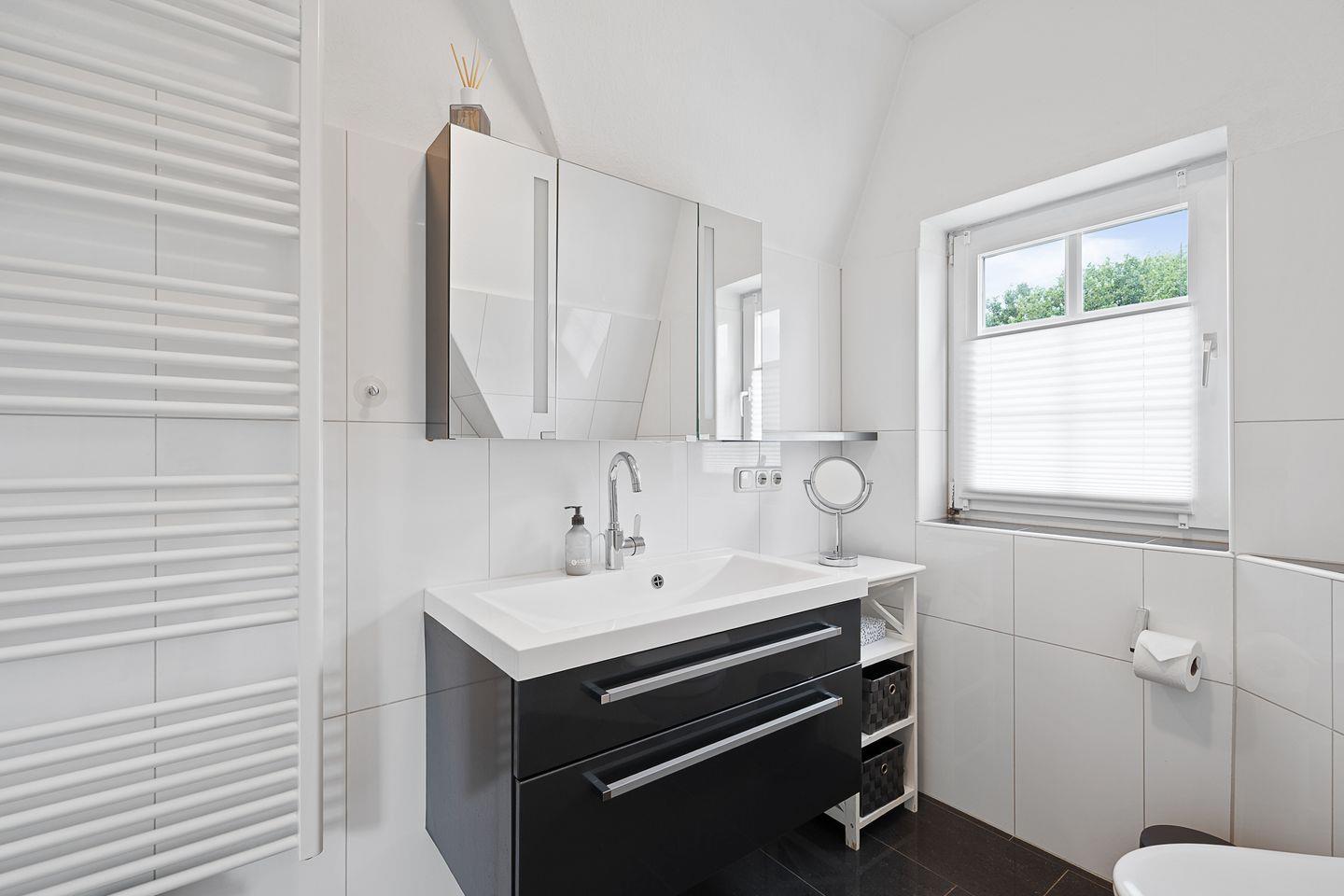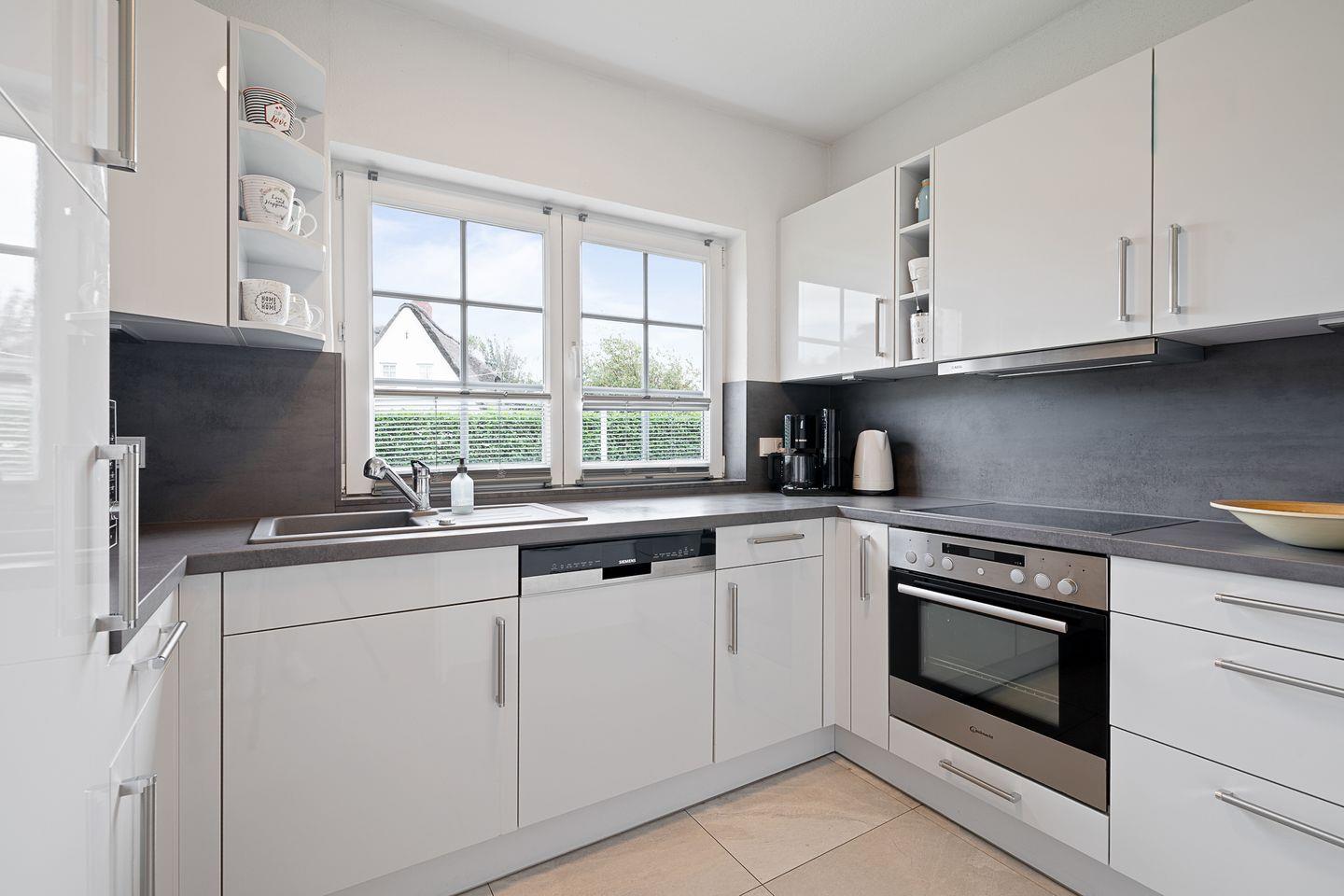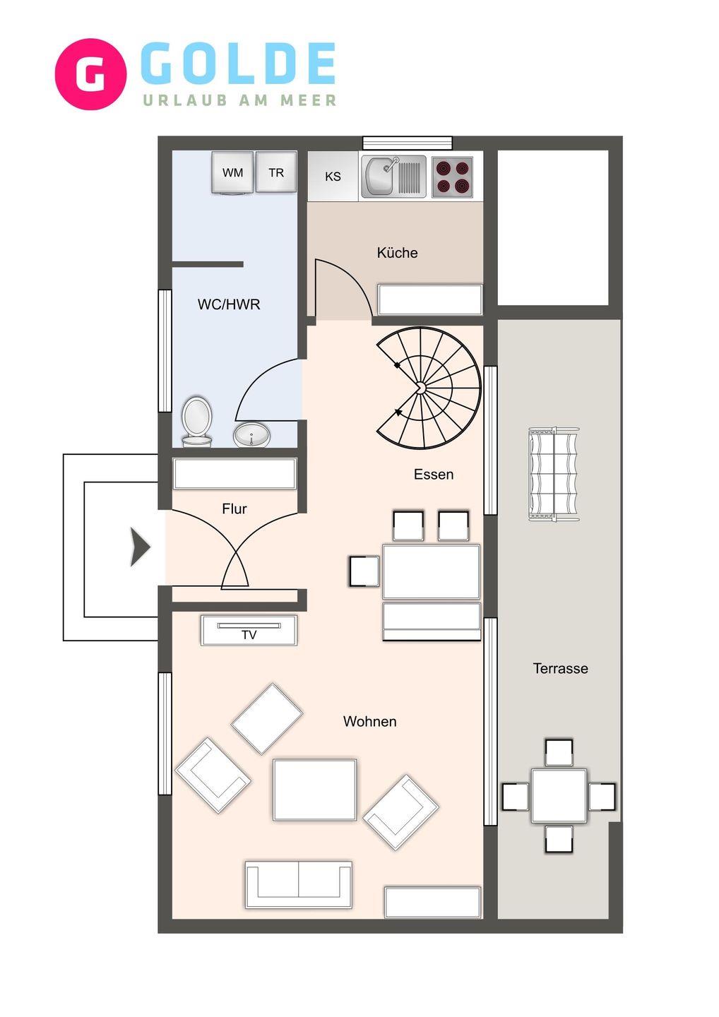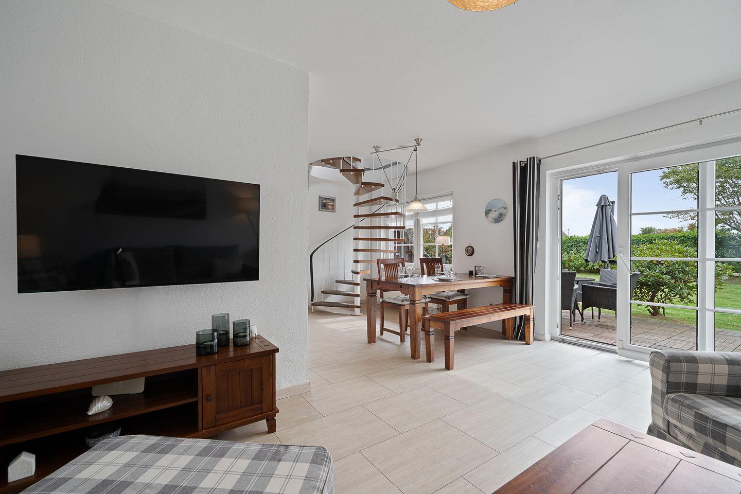 Im Erdgeschoss befindet sich der Wohnraum mit einer großzügigen Sitzecke und einem Essbereich. Vom Essbereich geht es direkt in die Küche, die voll ausgestattet ist. Im Erdgeschoss ist ebenso ein Flur mit eingebauter Garderobe, ein Hauswirtschaftsraum mit Gäste WC.