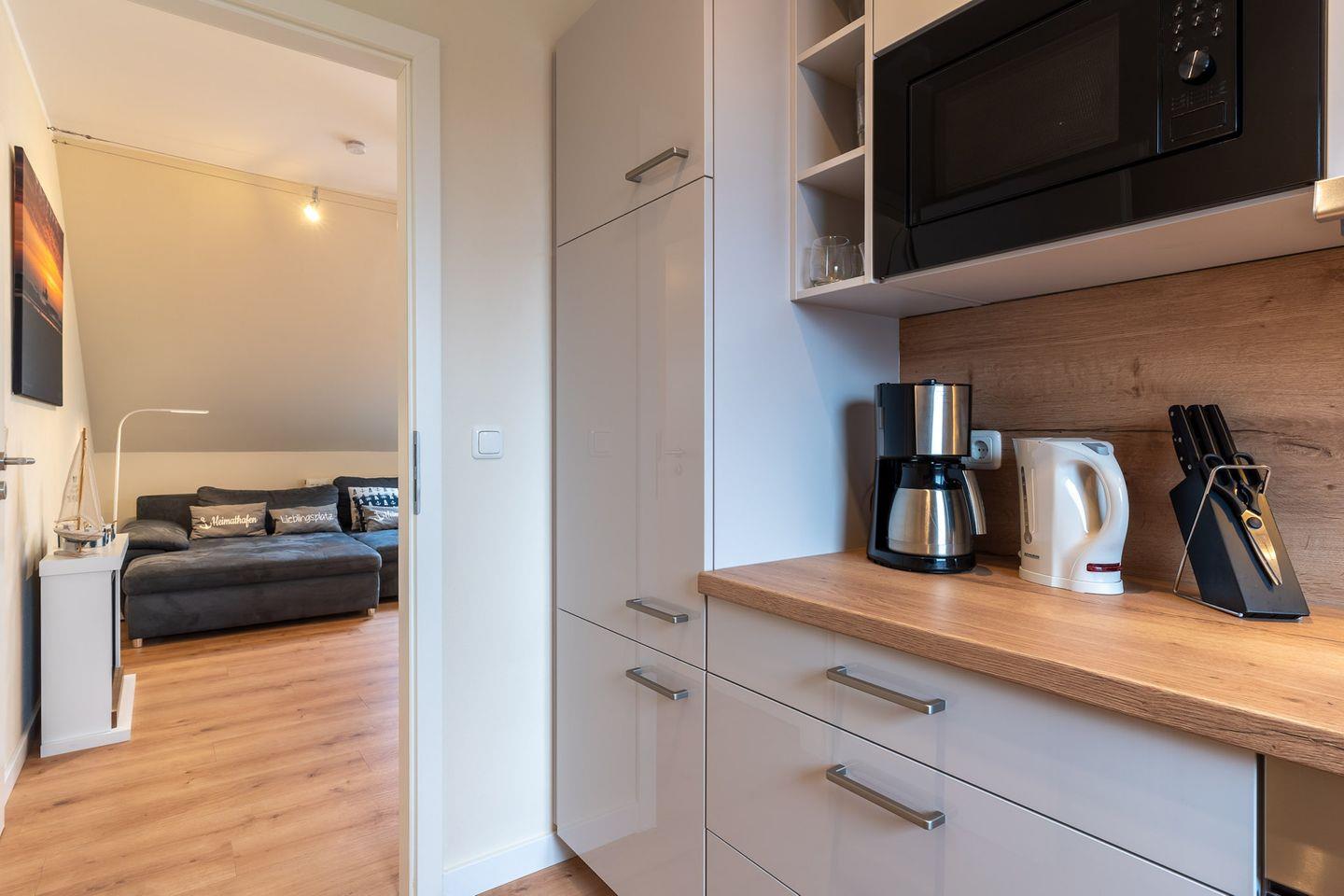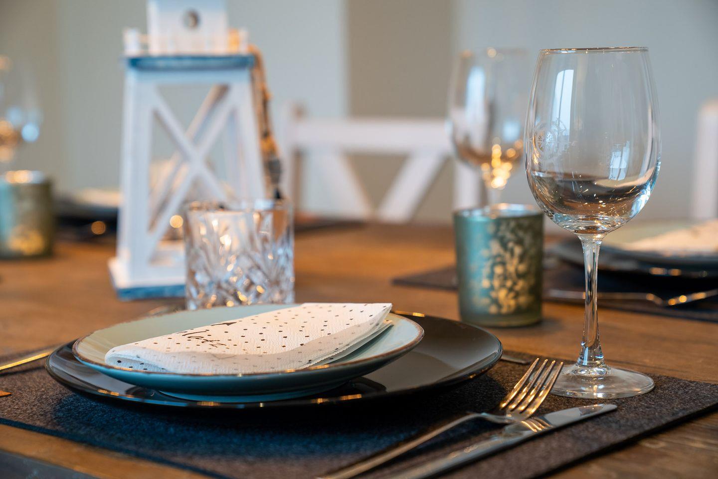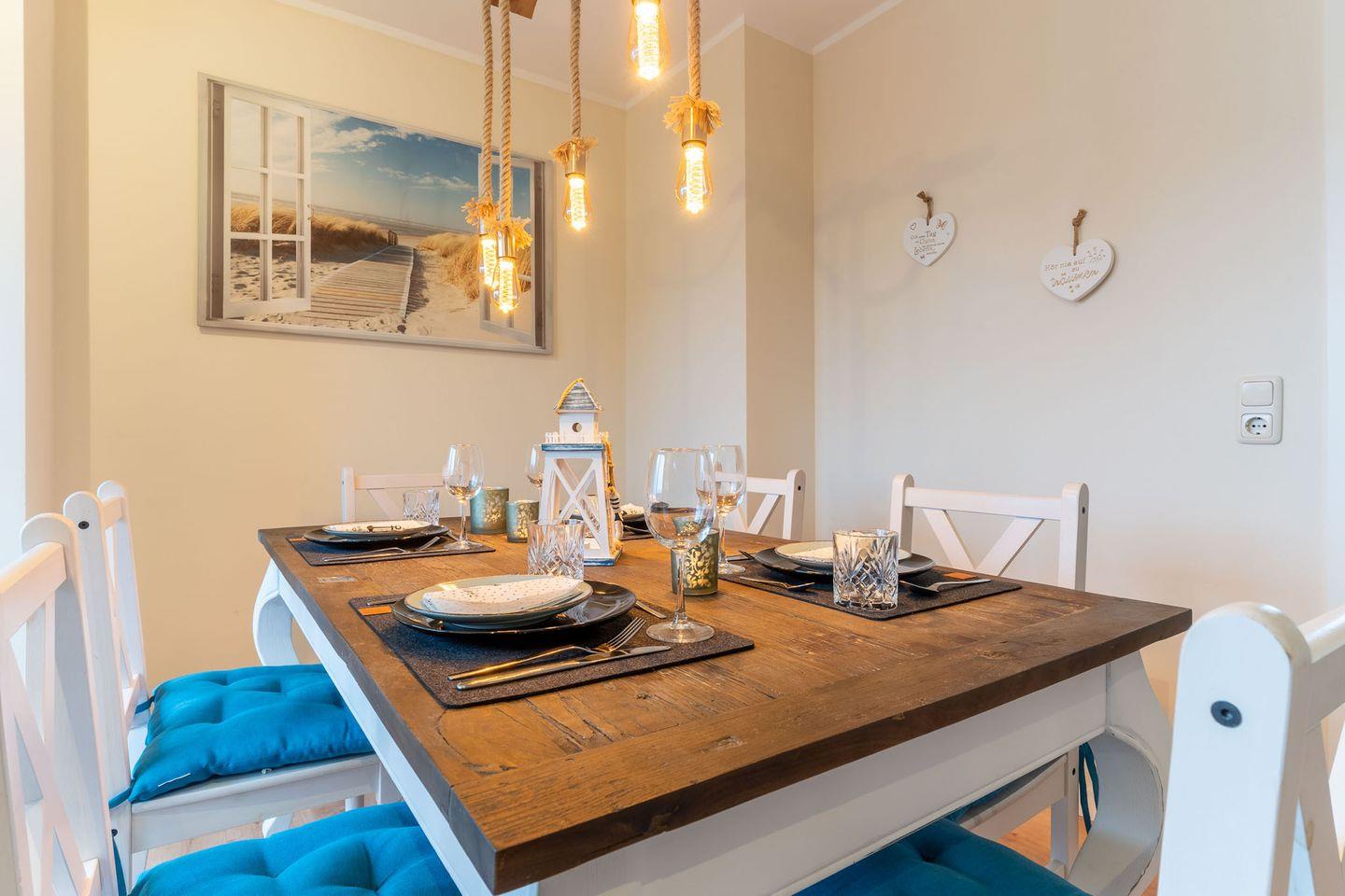 Hier erwartet Sie eine Couch mit 2 Sessel, einem Couchtisch und einem Elektrokamin. Des weiteren ist ein Esstisch mit 6 Stühlen vorhanden. Die Küche ist ausgestattet mit einem Herd mit Ceranfeld und Backofen, Dunstabzugshaube, Einbauküche, Geschirr, Kaffeemaschine, Kochtöpfe, Kühlschrank, Toaster und einem Wasserkocher.