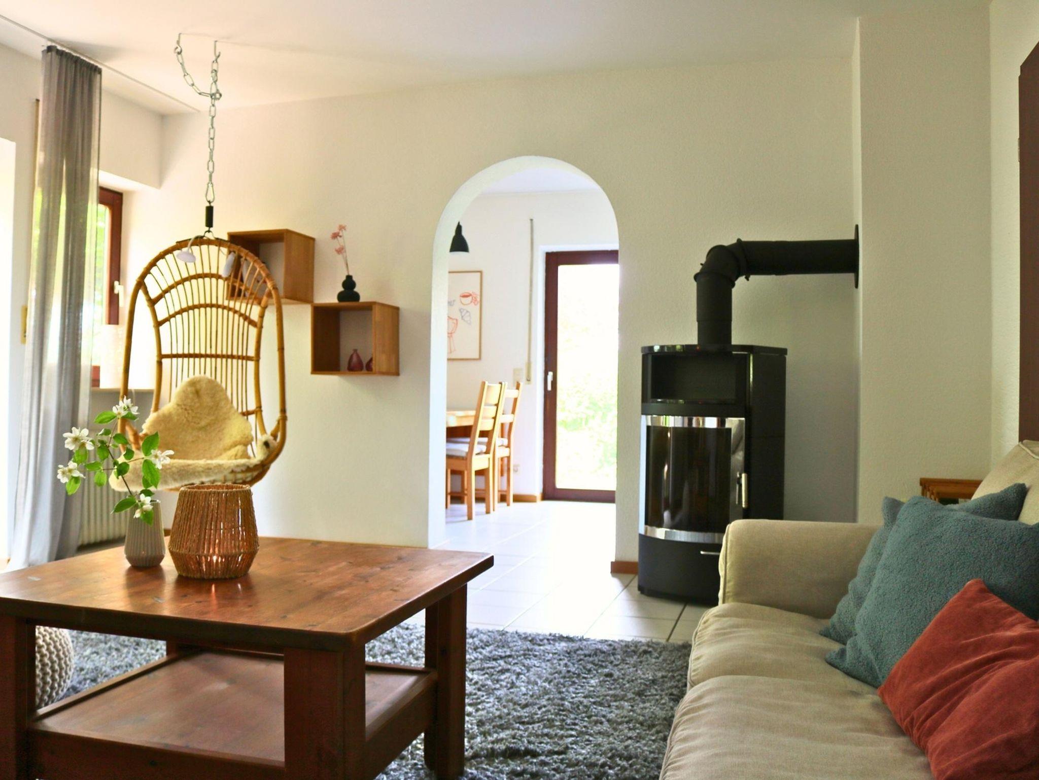 Unsere Ferienwohnung vereint natürliche Ruhe, modernen Komfort und liebevolle Details, um Ihnen sofort das Gefühl von Zuhause zu schenken. Der Wohnbereich ist gemütlich gestaltet mit Sofa, Sesseln, Hängeschaukel, Couchtisch, Fernseher, Ofen samt Brennholz sowie einer Auswahl an Büchern, Brettspielen und Magazinen. Das Schlafzimmer verfügt über ein komfortables Doppelbett, Nachttische mit Leselampen, Verdunklungsmöglichkeiten, einen geräumigen Kleiderschrank und eine Leseecke mit Schaukelstuhl. Die moderne Küche ist vollständig ausgestattet mit Herd, Backofen, Kühlschrank, Spülmaschine, Wasserkocher, Kaffeemaschine und Nespresso-Maschine, Toaster, Geschirr, Besteck, Kochutensilien, Pfannen, Töpfen und einer Basis an Gewürzen. Das Badezimmer bietet eine Badewanne mit Dusche, WC, Handtücher, Föhn, Spiegel und praktische Ablageflächen. Eine Abstellkammer im Flur enthält Staubsauger, Wäscheständer, Reinigungsmittel, Mülltrennungssystem und ein Erste-Hilfe-Set. Im Garten stehen zwei Terrassenplätze mit Sitzmöbeln, Sonnenschirm, Grill und Liegestühlen zur Verfügung. Fahrräder können sicher abgestellt werden. Die Ferienwohnung ist für zwei Personen konzipiert, großzügig geschnitten, hell und ruhig – perfekt für Paare, die Natur, Komfort und Stil zu schätzen wissen.