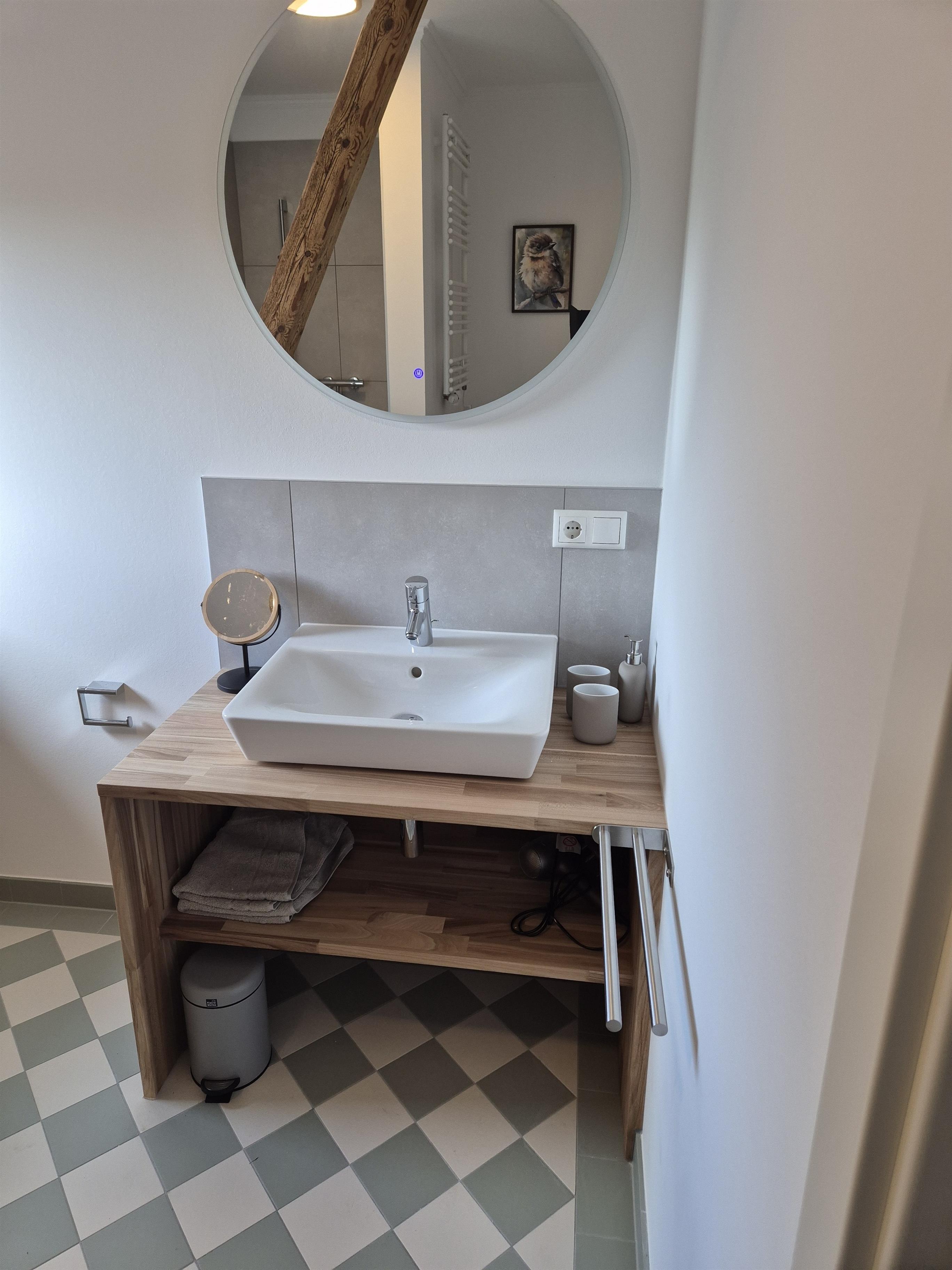 Das hochwertige Badezimmer hat eine Walk-in-Dusche, ein Waschbecken und ein WC und natürlich ein Fön.