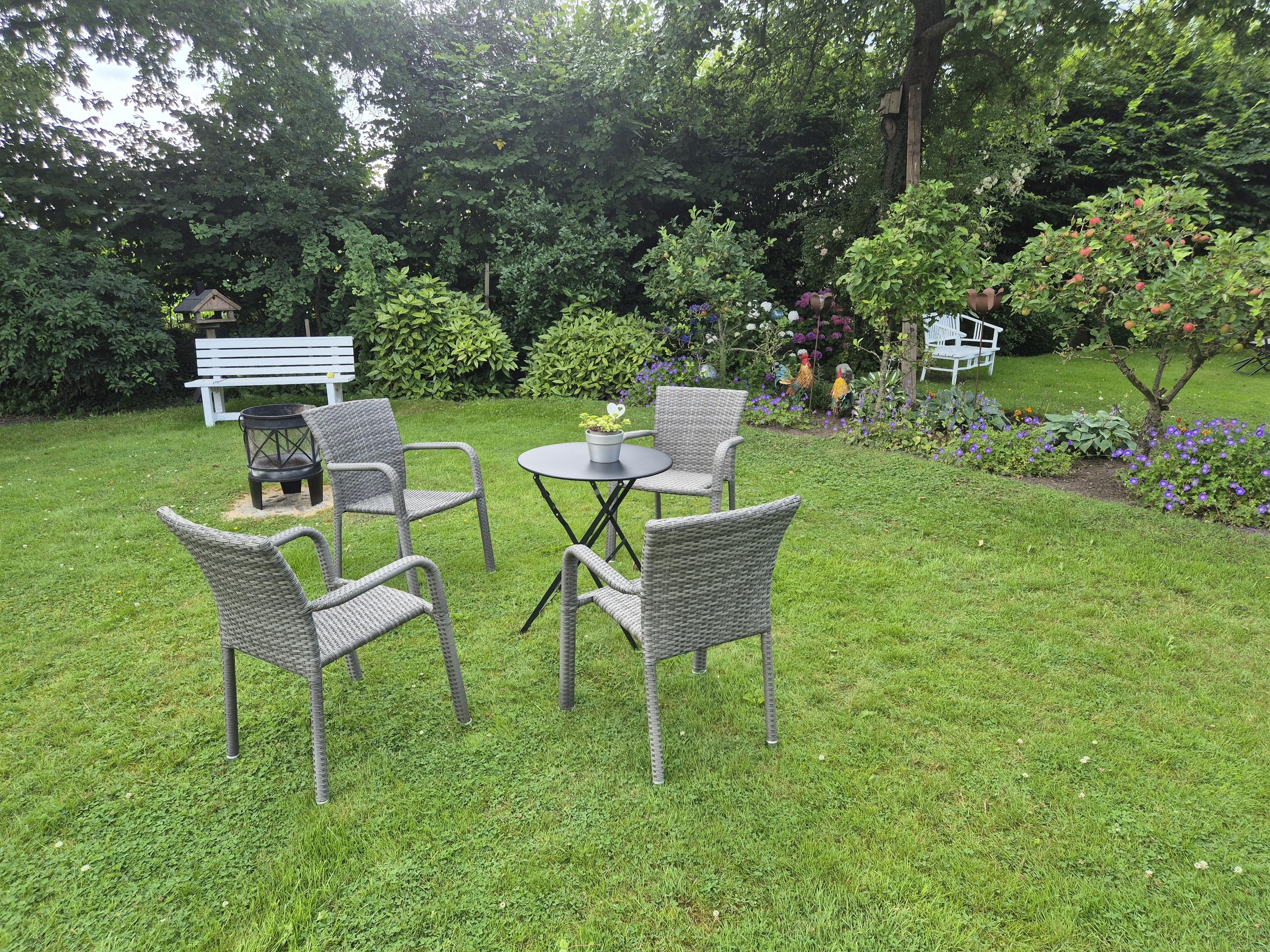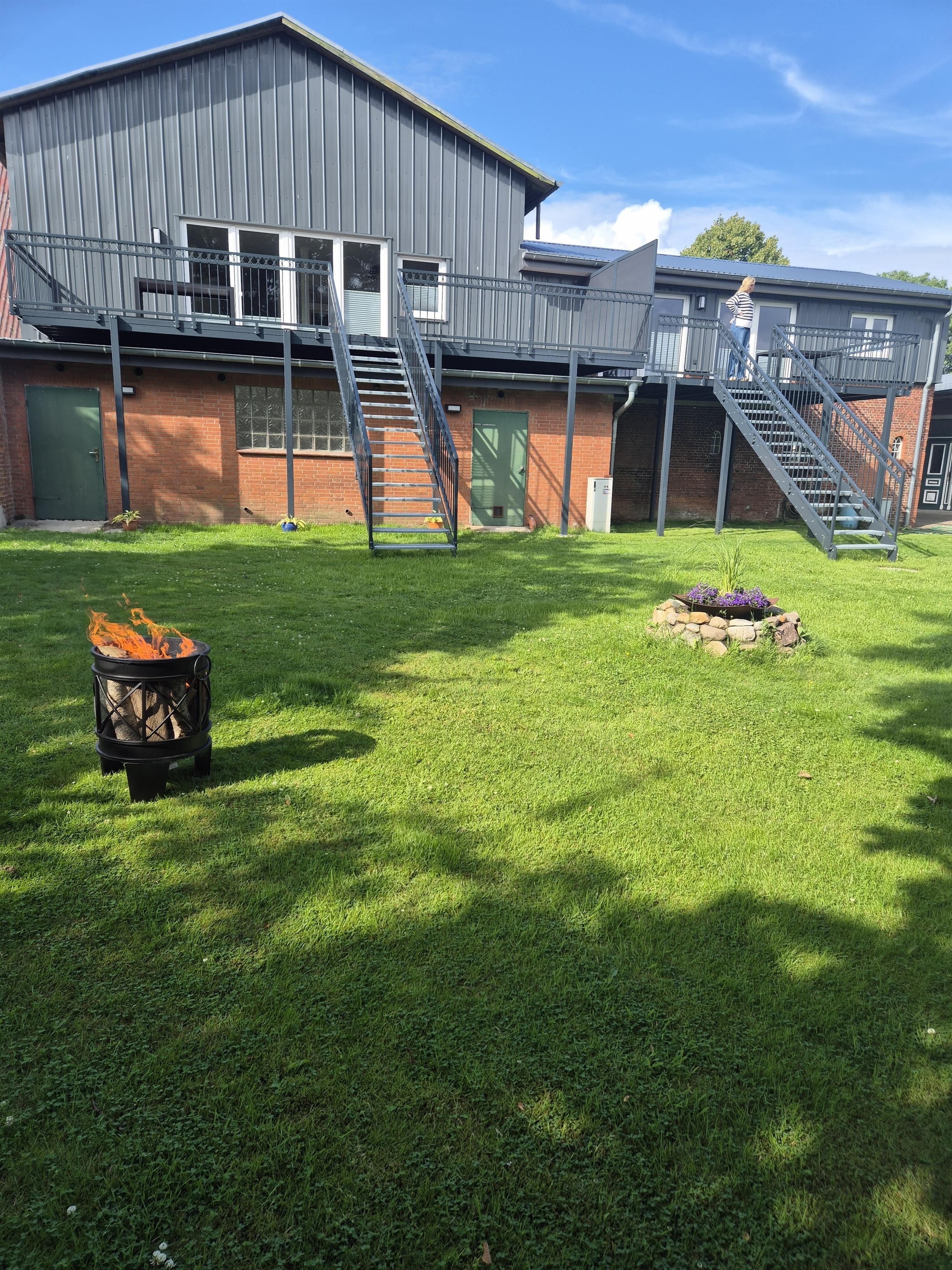 Von der Dachterrasse gelangen sie über eine eigene Treppe in den Garten, dort finden Sie eine Feuerstelle und einen Kugelgrill.