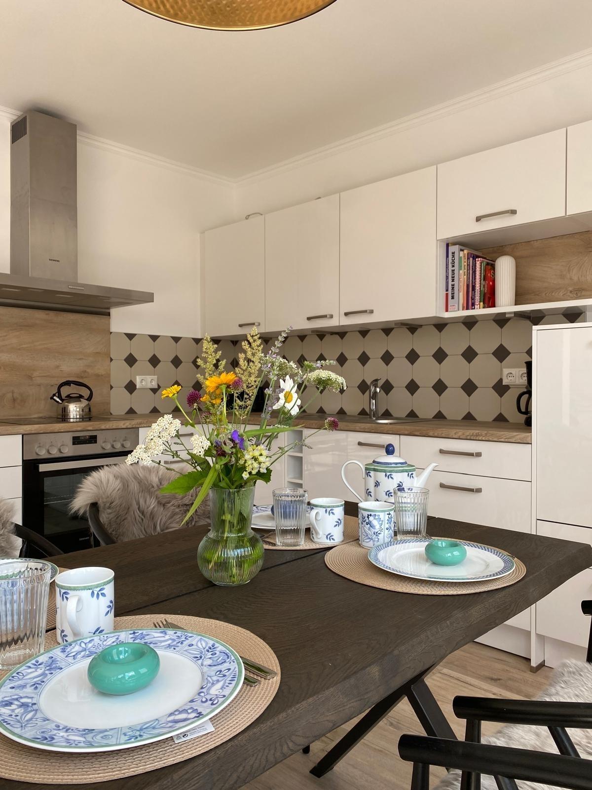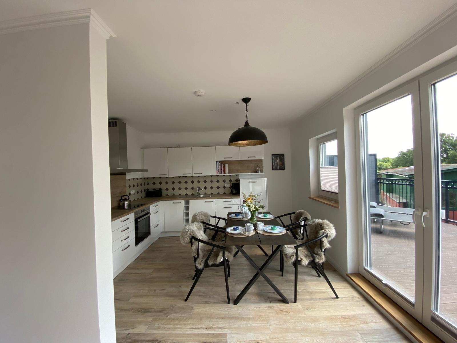 Die große brandneue Küche bietet Ihnen alle Extras wie zum Beispiel einen Weinkühlschrank, eine Brotschneidemaschine, einen großen Kühlschrank, einen Induktionsherd, eine Spülmaschine und viel Stauraum für mitgebrachte Vorräte, einen Backofen und sämtliche Küchenutensilien.