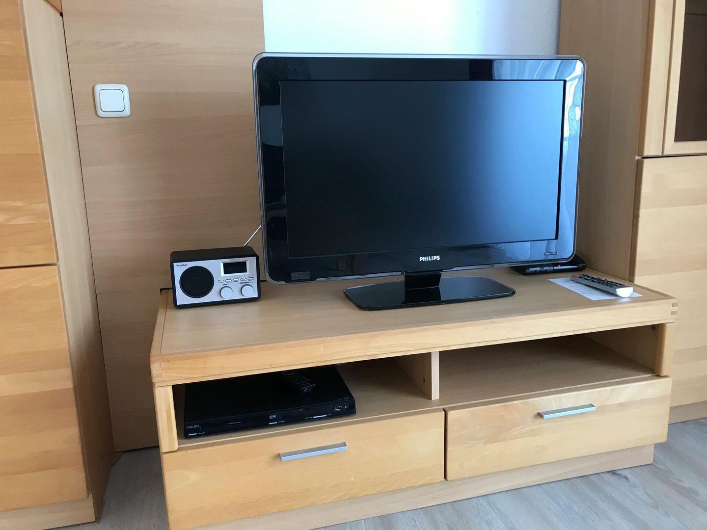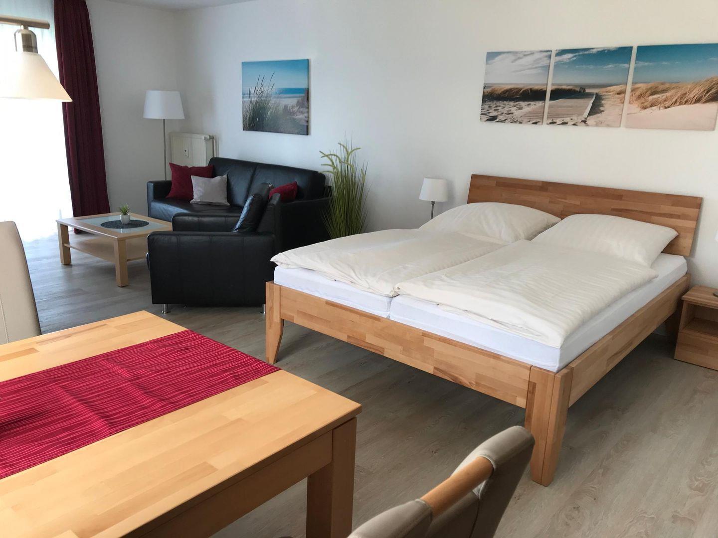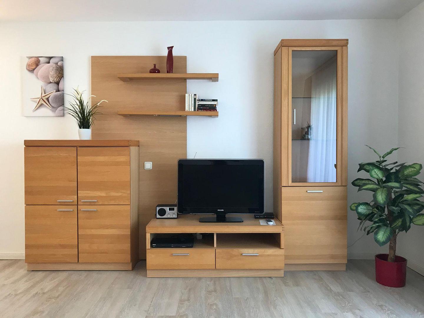 Der Wohnbereich ist komfortabel eingerichtet: Sie finden dort ein gemütliches Sofa, einen separaten Sessel, eine Kommode, einen Ganzkörperspiegel sowie eine Leseecke mit bereitgestellten Büchern. Für mediale Unterhaltung sorgen ein Flachbild-TV (25–34 Zoll) mit terrestrischem Anschluss, ein DVD-Spieler, eine HiFi-Anlage sowie ein Radio und ein Wecker. Das Appartement verfügt weiterhin über kostenfreies WLAN mit einer schnellen Internetverbindung ab 25 Mbit/s, ideal, um während des Aufenthalts zu arbeiten.