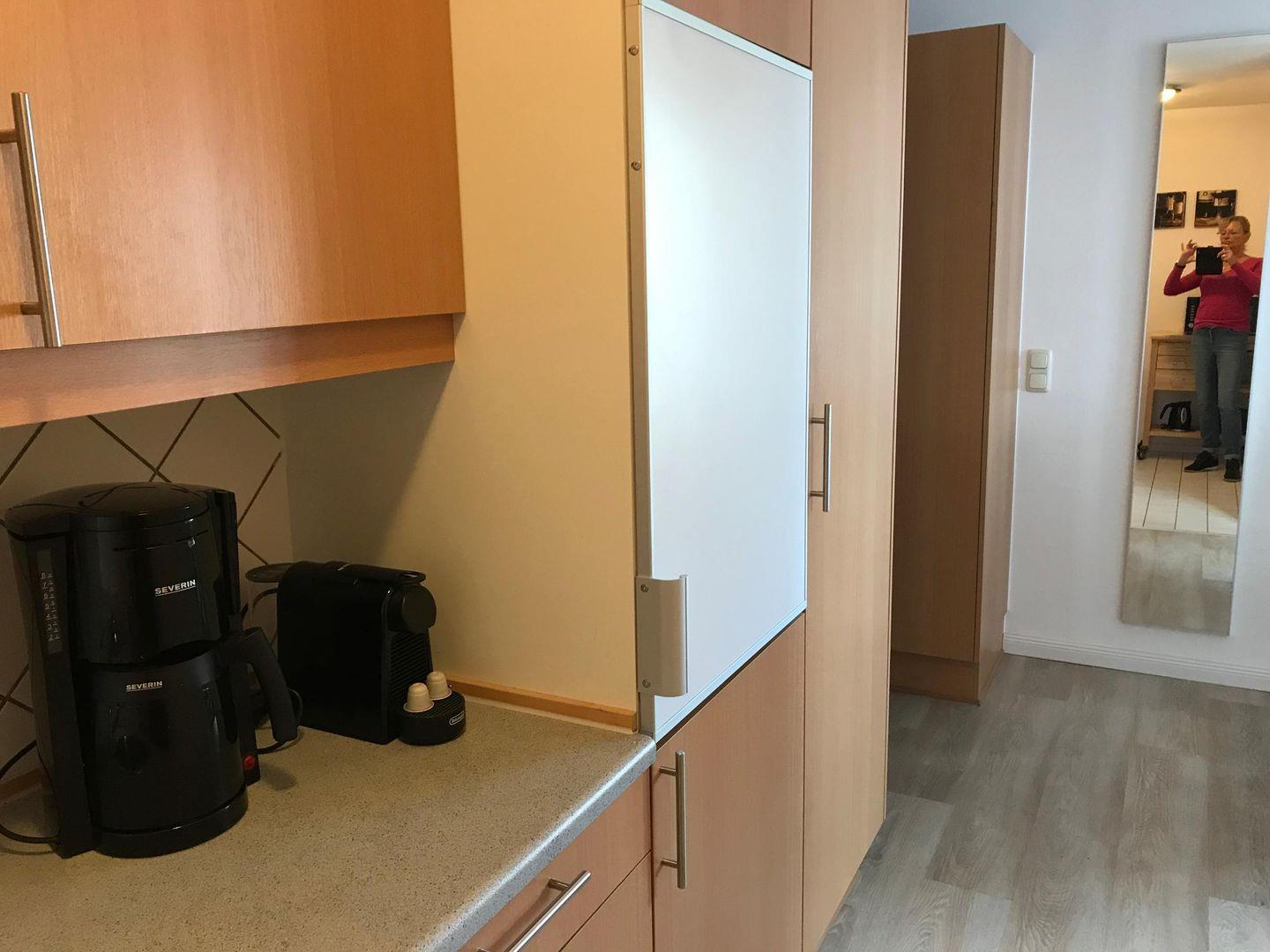Das modern ausgestattete Appartement verfügt über einen offen zum Wohnraum gestalteten Küchenbereich, der mit zahlreichen Annehmlichkeiten für einen selbstbestimmten Aufenthalt sorgt. Eine voll ausgestattete Küche mit 2-Platten-Herd, Mikrowelle, Kühlschrank inklusive Gefrierfach, Espressomaschine, Kaffeemaschine, Wasserkocher, Toaster, Mixer sowie sämtliche Küchenutensilien und Geschirr stehen zur Verfügung. Der angrenzende Essbereich mit Esstisch lädt zu gemeinsamen Mahlzeiten ein.