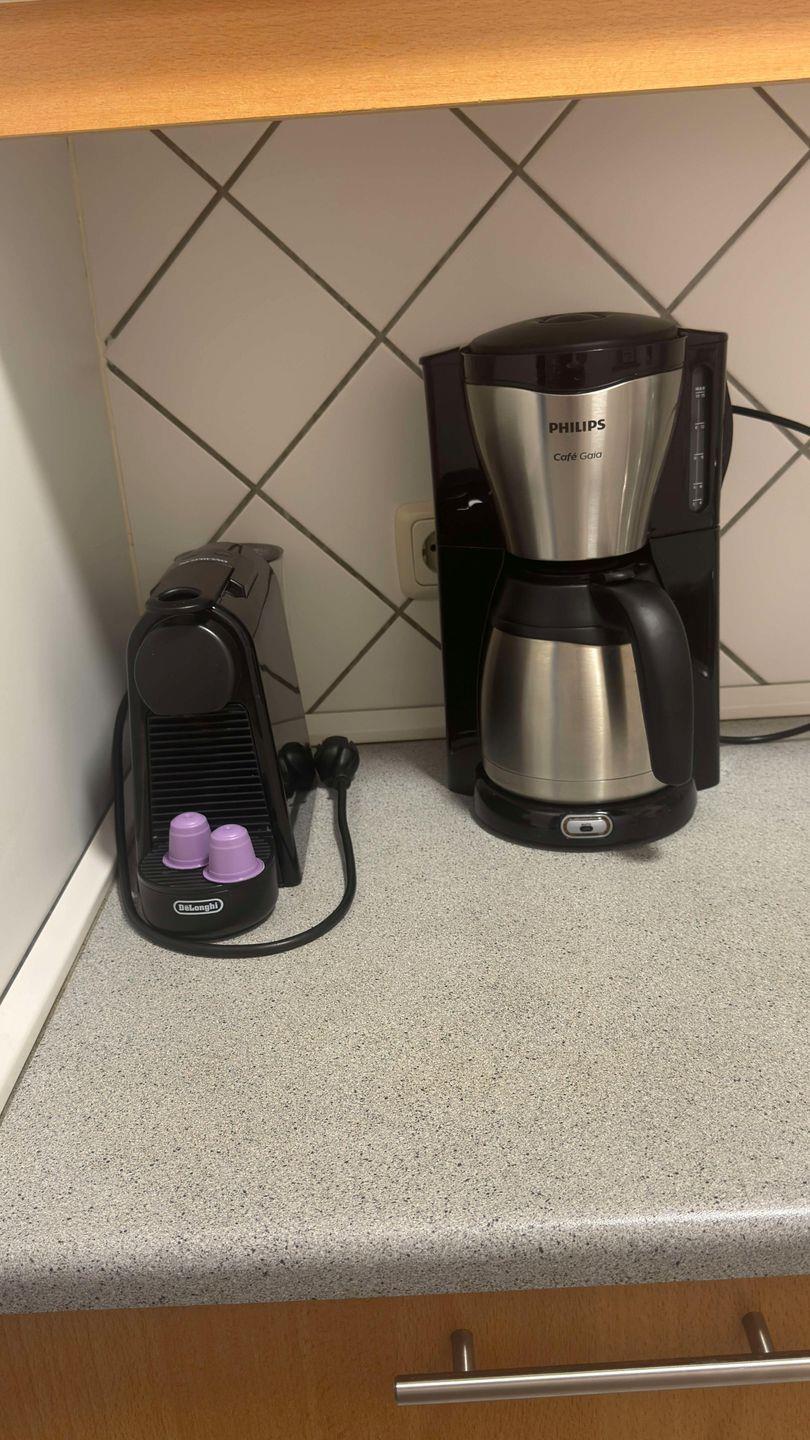 Die Küche ist vollständig auf den Ferienalltag ausgerichtet: vorhanden sind Herd (4-Platten) und Elektro-Backofen, Mikrowelle, Spülmaschine, Kühlschrank mit Gefrierfach, sowie Küchenutensilien, Geschirr und Besteck. Für Kaffee und Frühstück stehen Kaffeemaschine, Espressomaschine, Wasserkocher, Toaster und Mixer bereit. Ein Esstisch ist ebenfalls vorhanden.