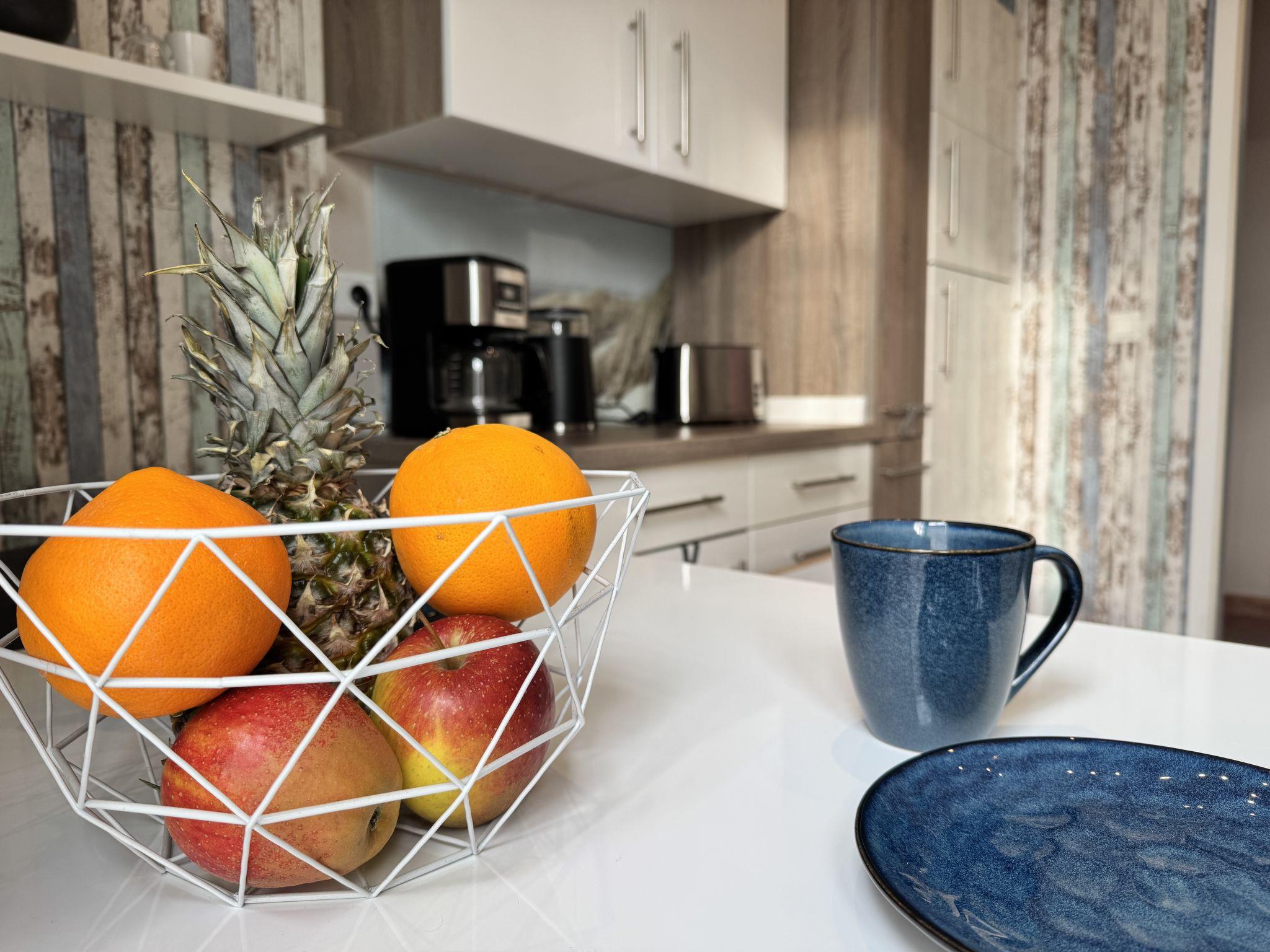 Apartment house. On the outskirts, 1.5 km from the centre, in a quiet position in the residential district. Private: property 100 m2, lawn for sunbathing, pond, parking at the house. Supermarket 200 m, restaurant 400 m, bus stop 50 m, railway station 1.5 km, outdoor swimming pool 2 km, indoor swimming pool 8 km, lake Schiedersee 9 km. Golf course (18 hole) 14 km, tennis 2 km. Please note: the owner lives in the same residence.