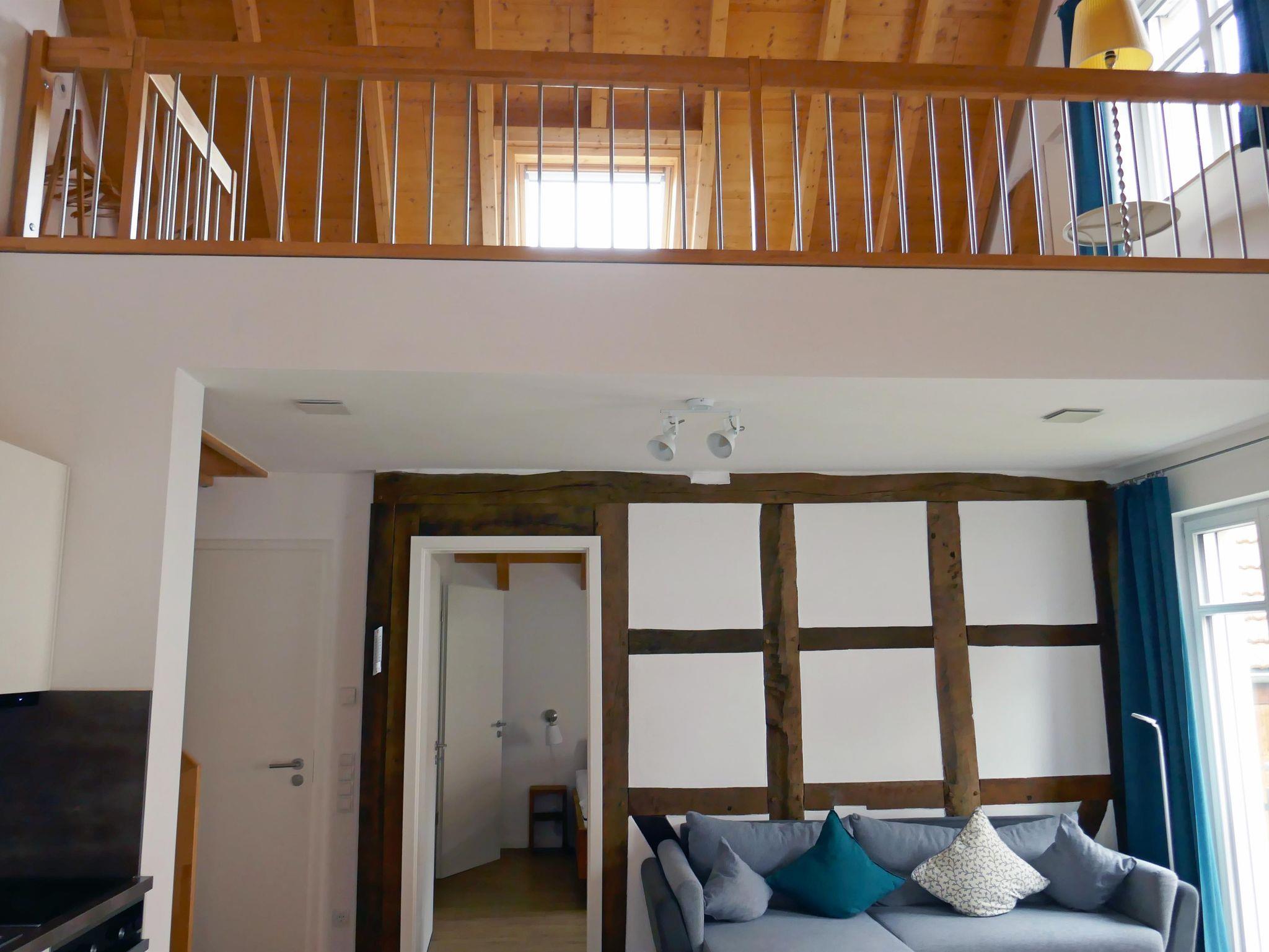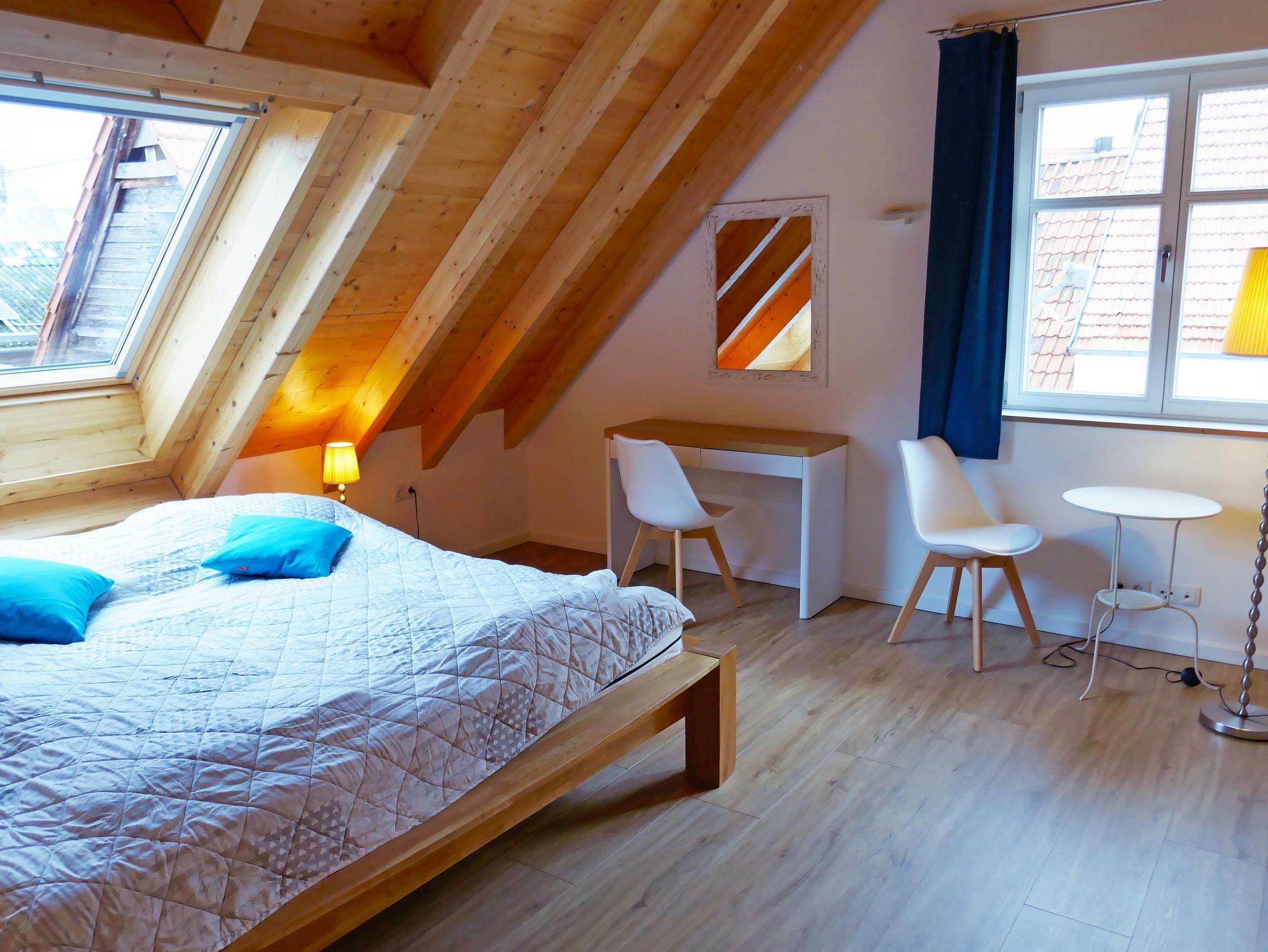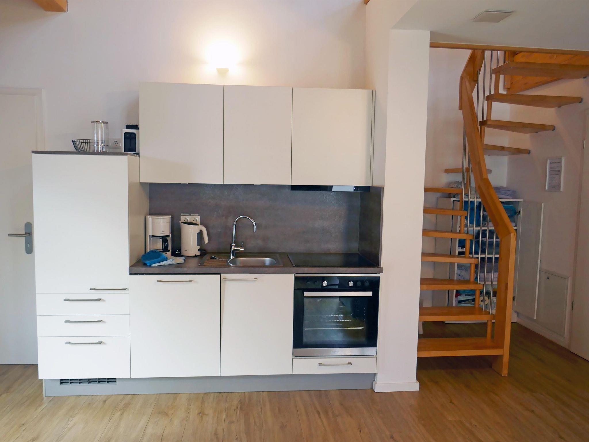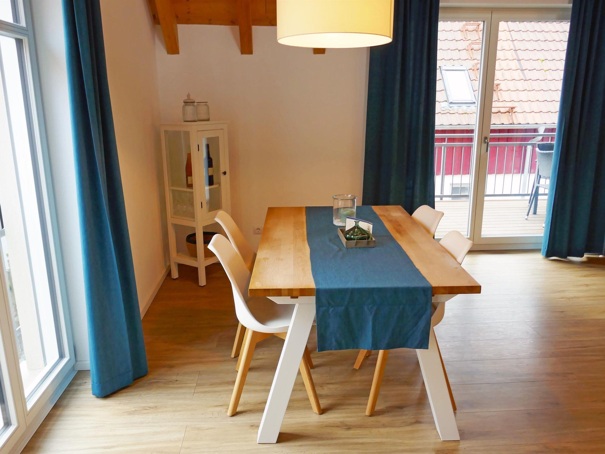 Das Appartement „Riesling“ liegt im Obergeschoss zur ruhigen Gartenseite und verfügt über einen einladenden Südalkon. Der Wohnraum mit integrierter Küche bietet einen Essplatz für 4 Personen, eine gemütliche Couch-Ecke sowie Sat-TV – perfekt für entspannte Abende. Ein separates Schlafzimmer und eine Schlafgalerie sorgen für ausreichend Platz, ergänzt durch ein modernes Bad mit Dusche und separatem WC.