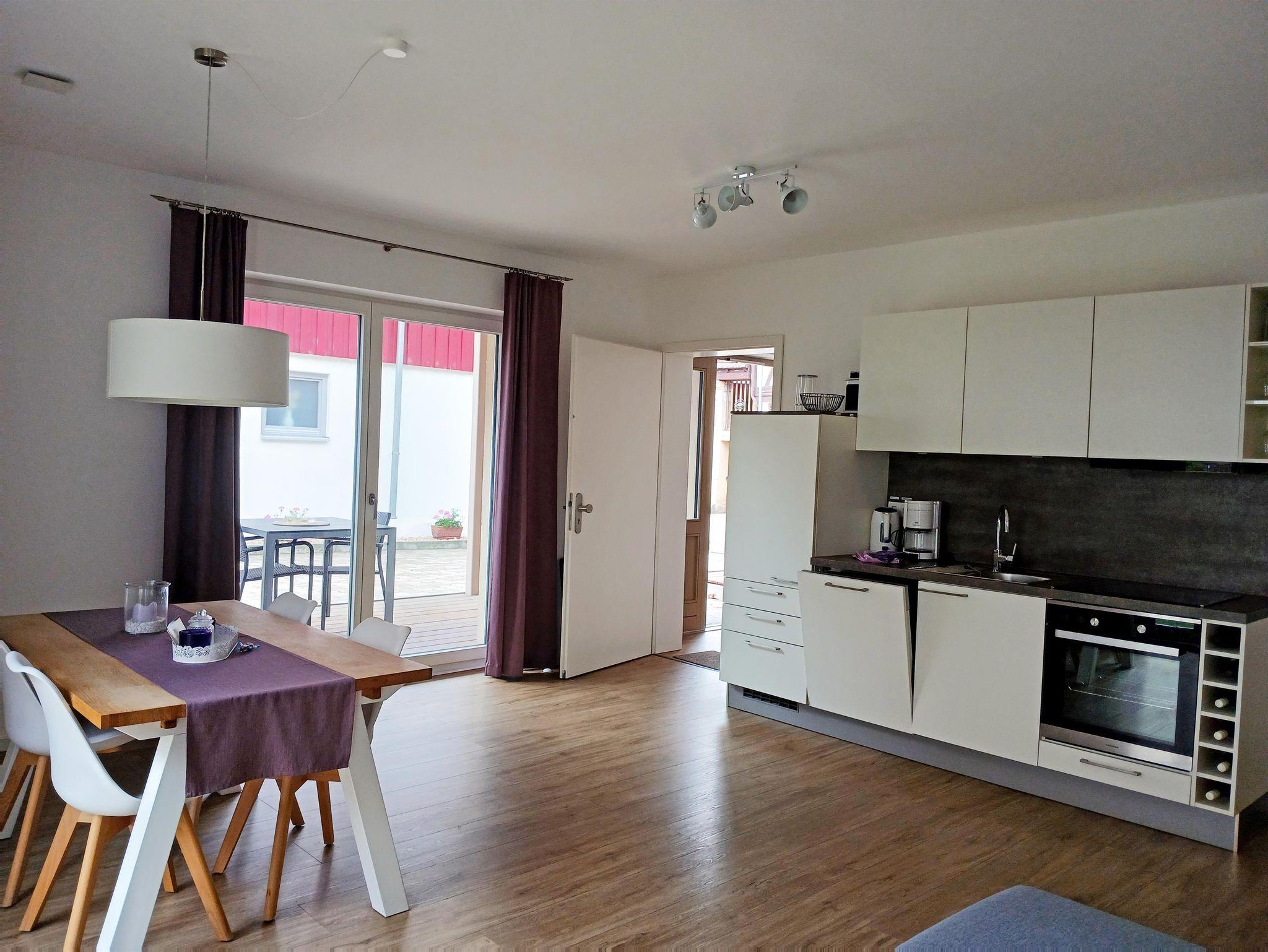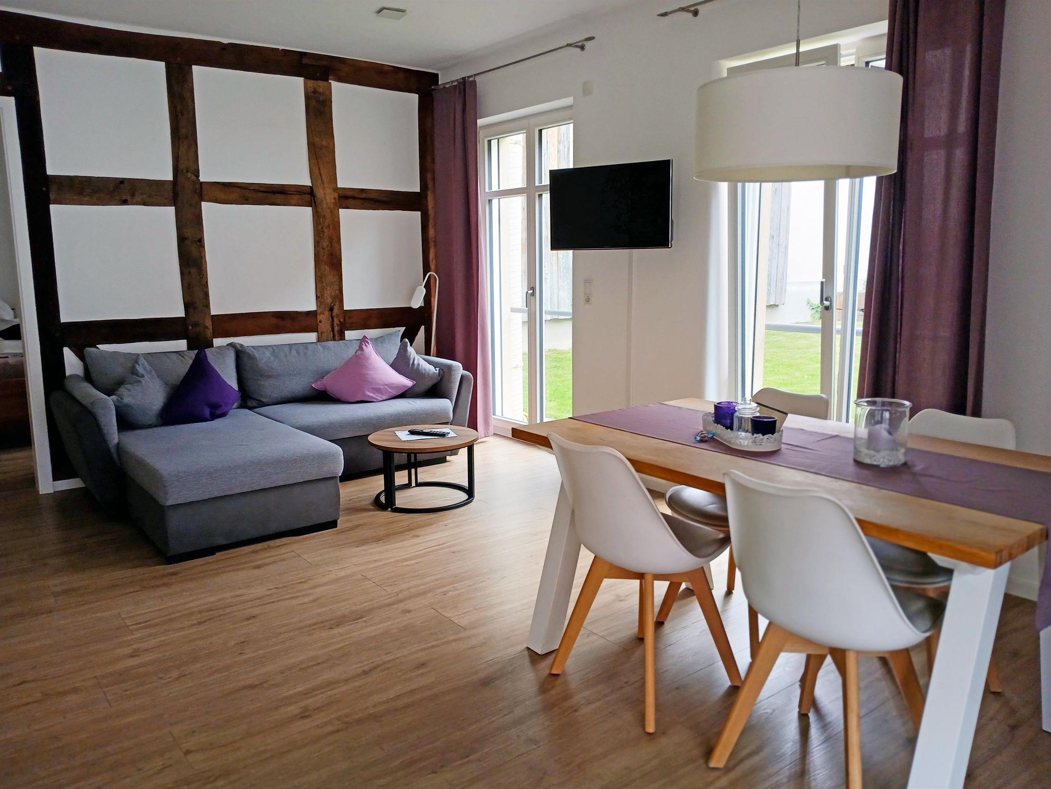 Das Appartement „Dornfelder“ liegt ruhig im Erdgeschoss mit Blick zum Garten und eigener Terrasse. Der helle Wohnraum mit Küche verfügt über einen Essplatz für 4 Personen sowie eine gemütliche Couch-Ecke und Sat-TV – ideal für entspannte Urlaubstage. Ein separates Schlafzimmer und ein modernes Bad mit Dusche und separatem WC runden das komfortable Angebot ab.