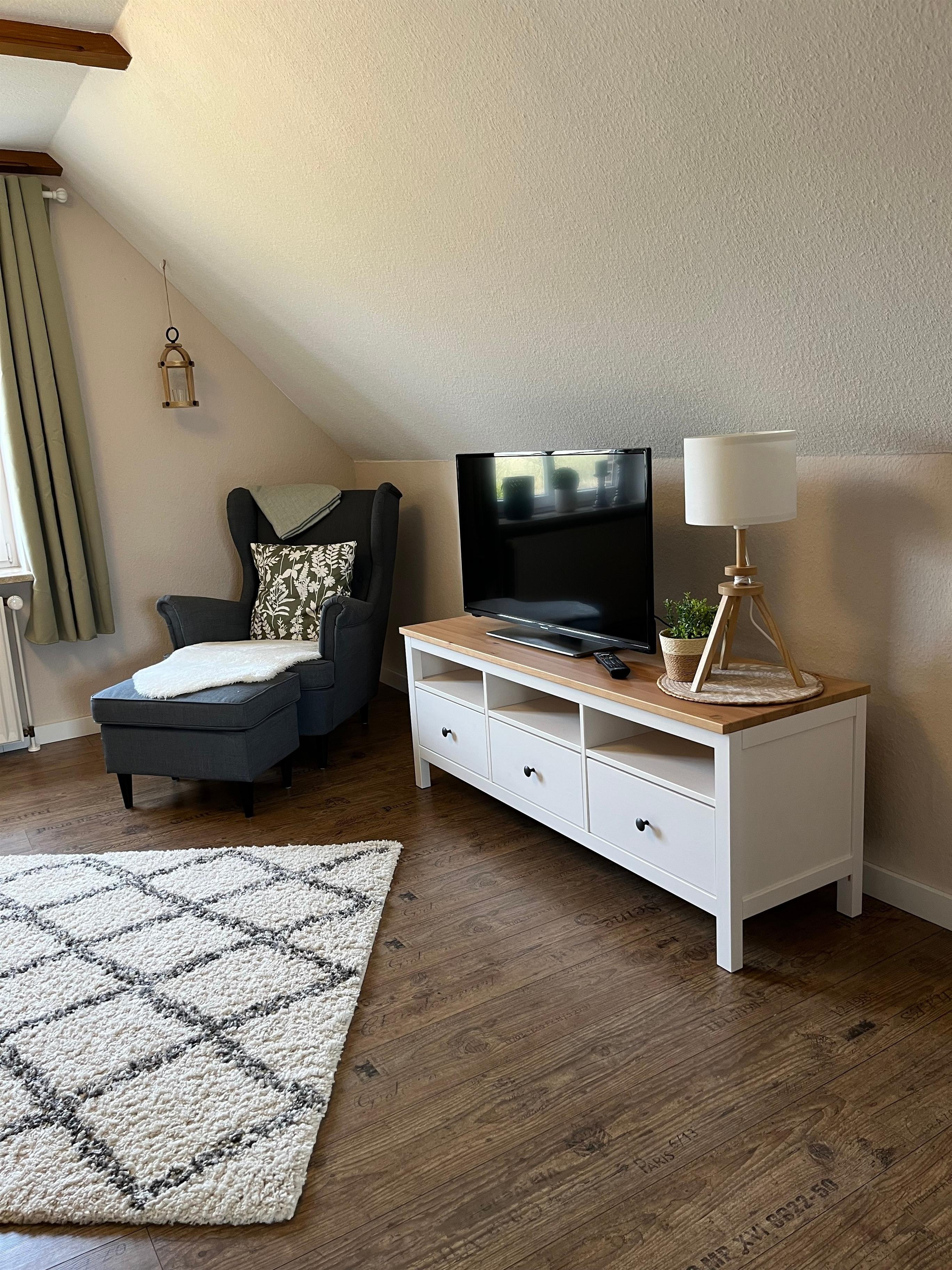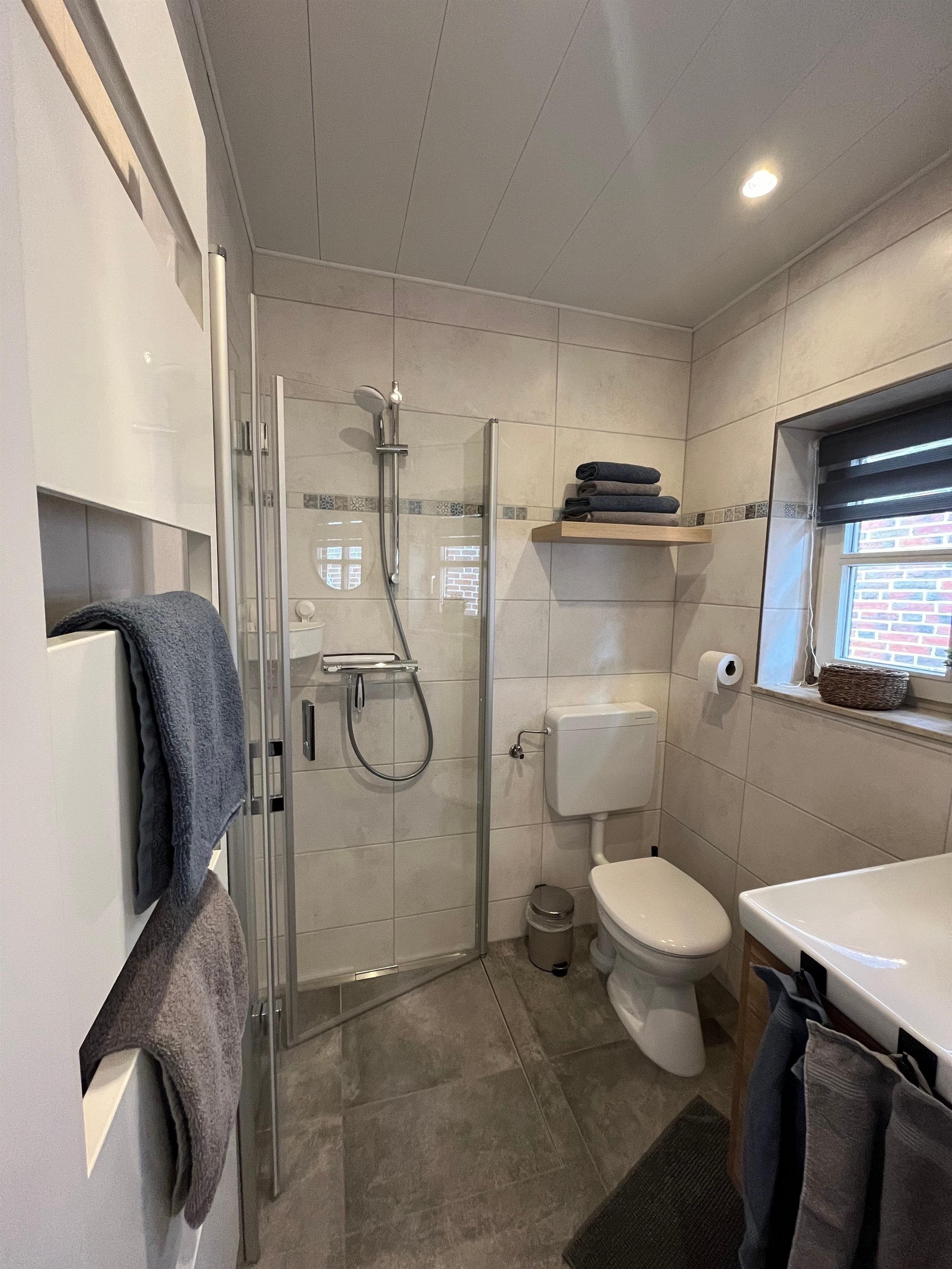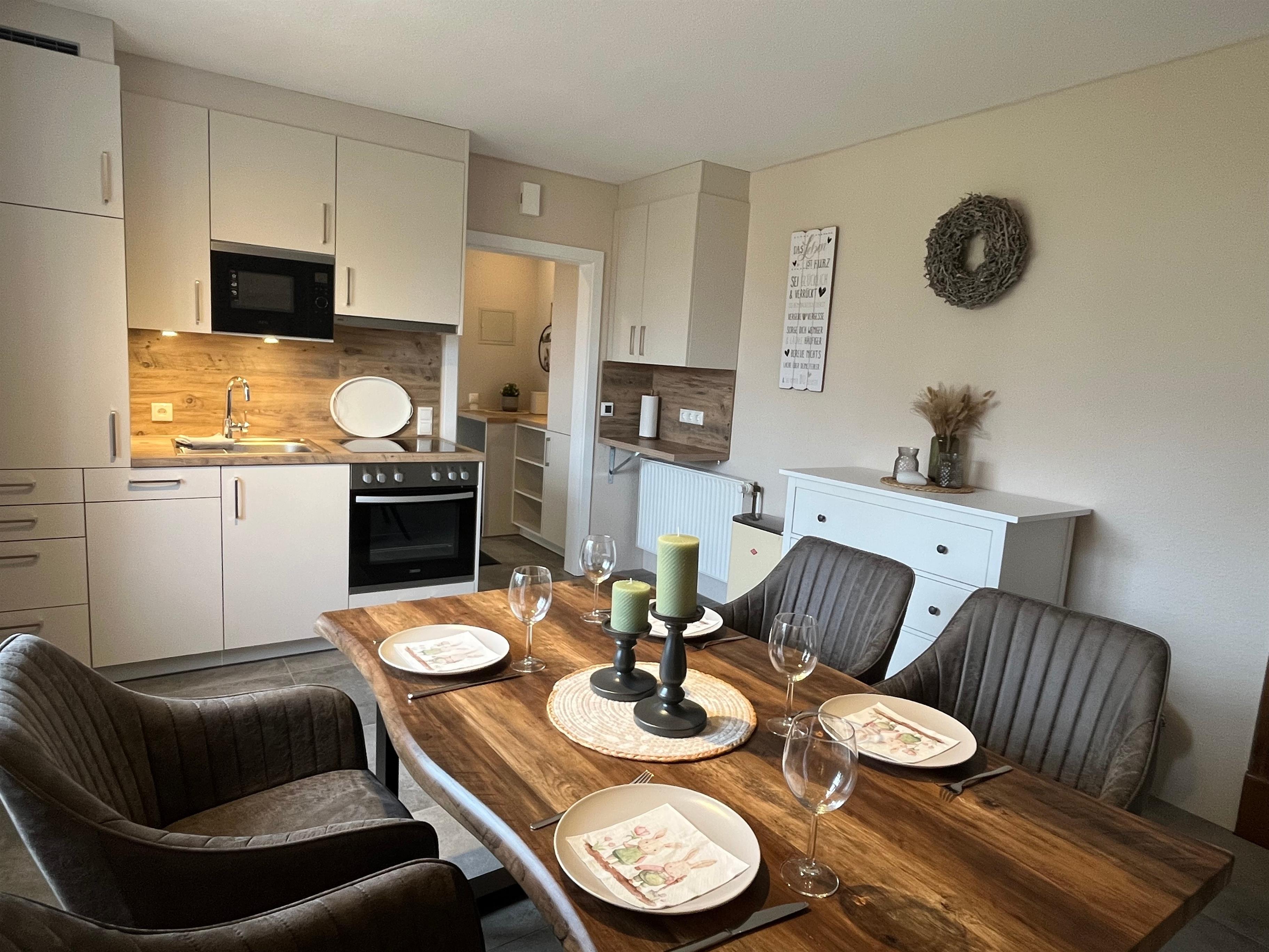 Im Erdgeschoss befindet sich das Duschbad und die Küche mit Essbereich. Die Küche ist ausgestattet mit einem Kühlschrank, Backofen, Cerankochfeld, Mikrowelle, Spülmaschine und sämtlichen Küchenkleingeräten. Über die Treppe nach oben erreichen Sie das offene Wohnzimmer. Dieses ist ausgestattet mit einem Schlafsofa.