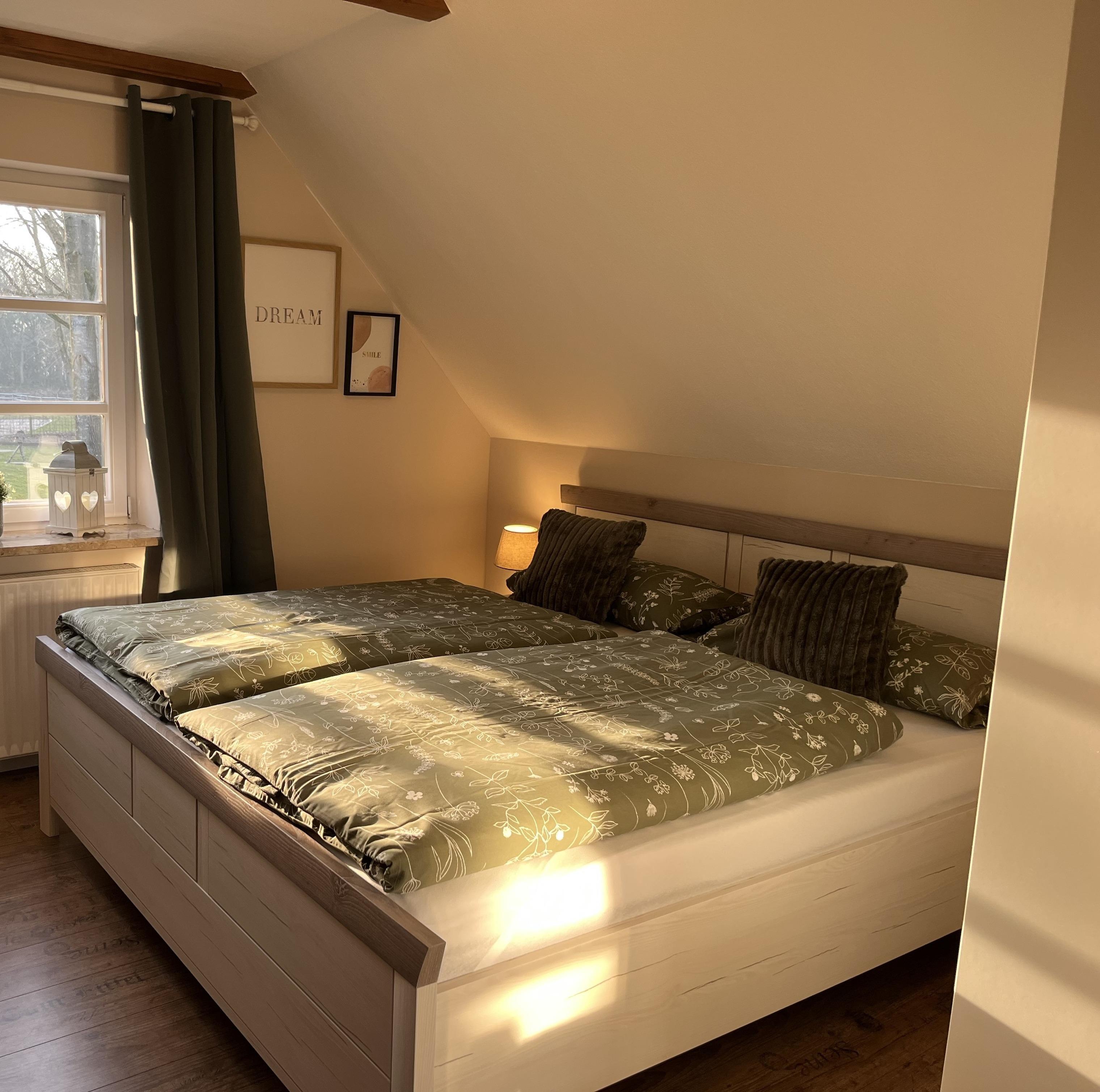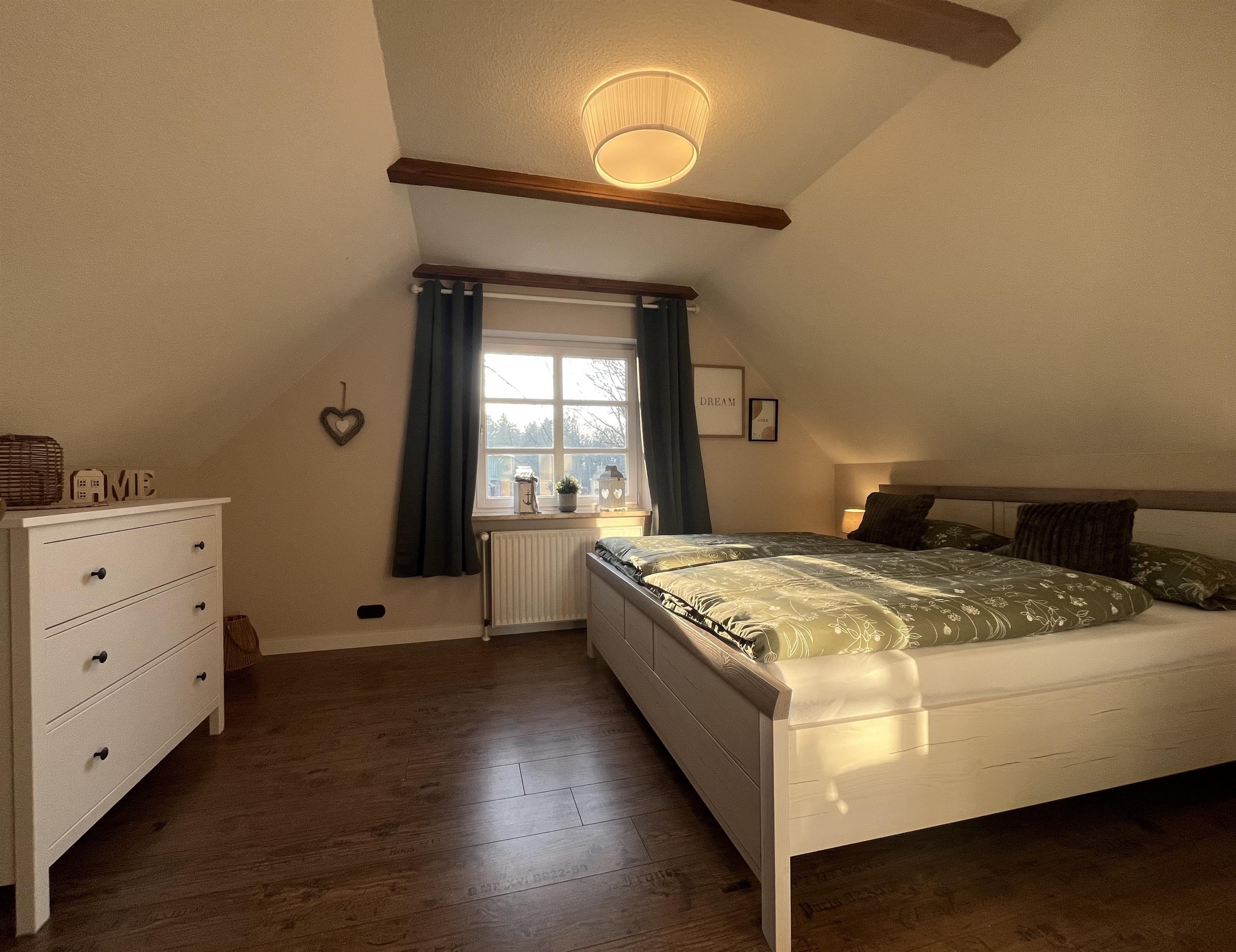 Im 1. Stock befindet sich außerdem das Schlafzimmer, ausgestattet mit einem Doppelbett (180x200cm).