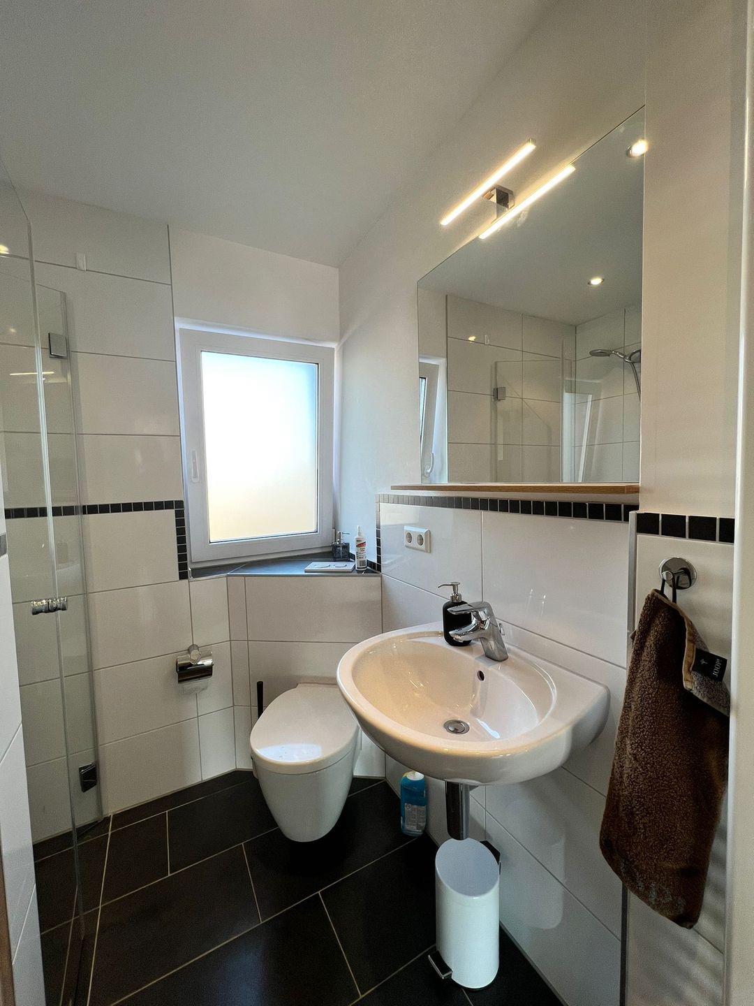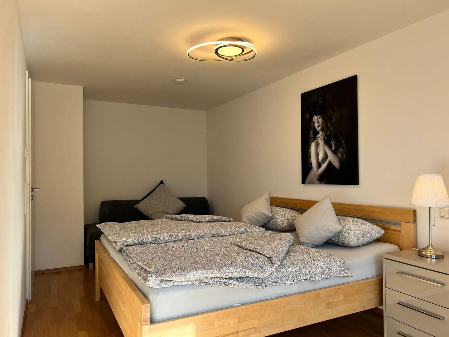 Das moderne Schlafzimmer verfügt über ein komfortables Doppelbett sowie ein Schlafsofa für zusätzlichen Schlafkomfort. Das Badezimmer bietet eine bodenebene Dusche, Waschbecken und WC. Hier erleben Sie zeitgemäßen Komfort in einer gepflegten Umgebung.
