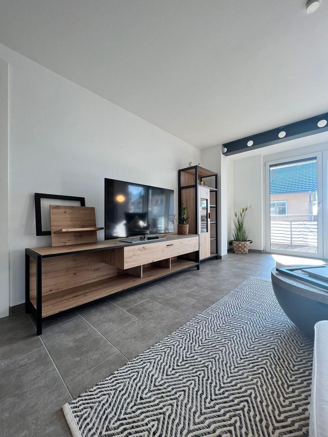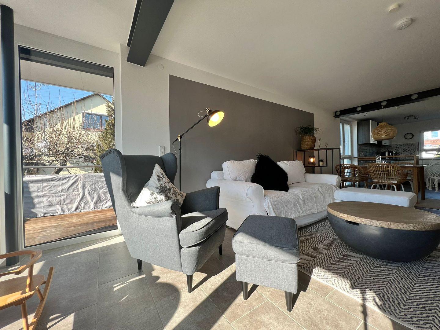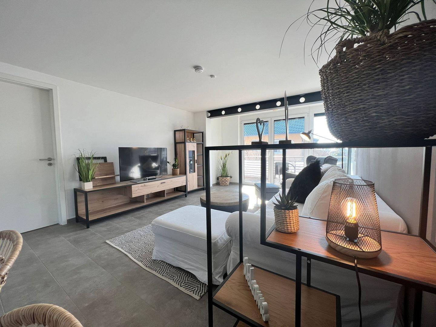 Die Ferienwohnung besteht aus einem modernen Schlafzimmer mit Doppelbett und Schlafsofa, einem offenen Wohn-Esszimmer und TV, einer großzügigen Küchenzeile und einem Duschbad. Der gemütliche Sonnenbalkon mit ca. 14 qm ist bestens geeignet für eine Auszeit unter freiem Himmel oder schöne Stunden zu Zweit. Ein harmonisches Zusammenspiel von Naturmaterialien und modernen Möbeln schaffen eine angenehme Wohnatmosphäre. Die Einrichtung besteht aus warmen Farbtönen, natürlichen Materialien und viel Liebe zum Detail.