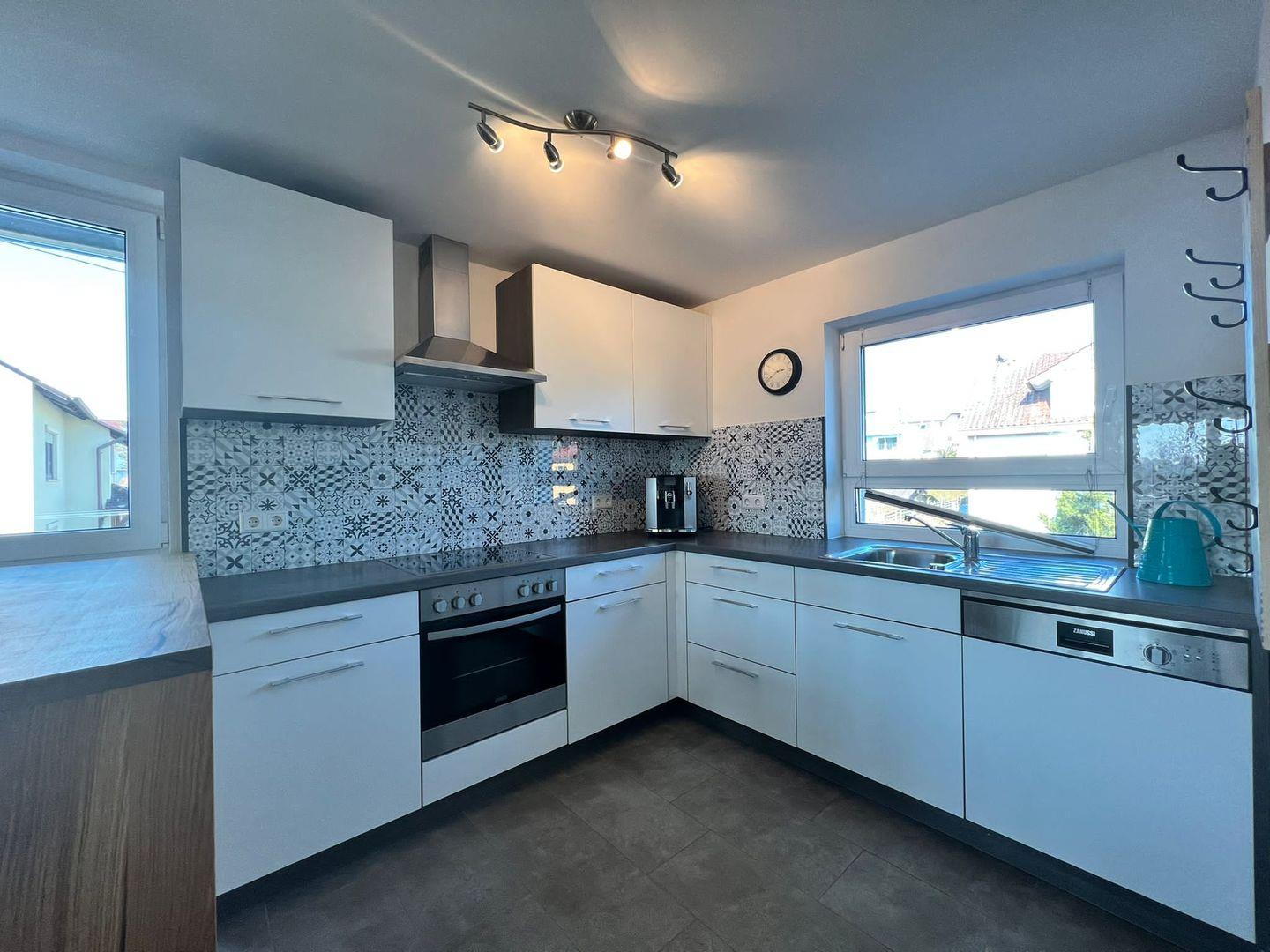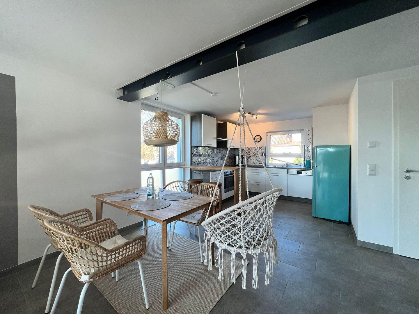 Der offene Wohn-Essbereich beeindruckt mit einer einladenden Wohnlandschaft und einem TV für entspannte Abende. Der Essplatz mit einem schwebenden Hängesessel setzt besondere Akzente und schafft einen einzigartigen Charme. Die großzügige Küche ist mit modernen Annehmlichkeiten ausgestattet, darunter Kühlschrank, Gefrierfach, eine hochwertige Jura-Kaffeemaschine, Geschirr, Wasserkocher, sowie Herd und Backofen.