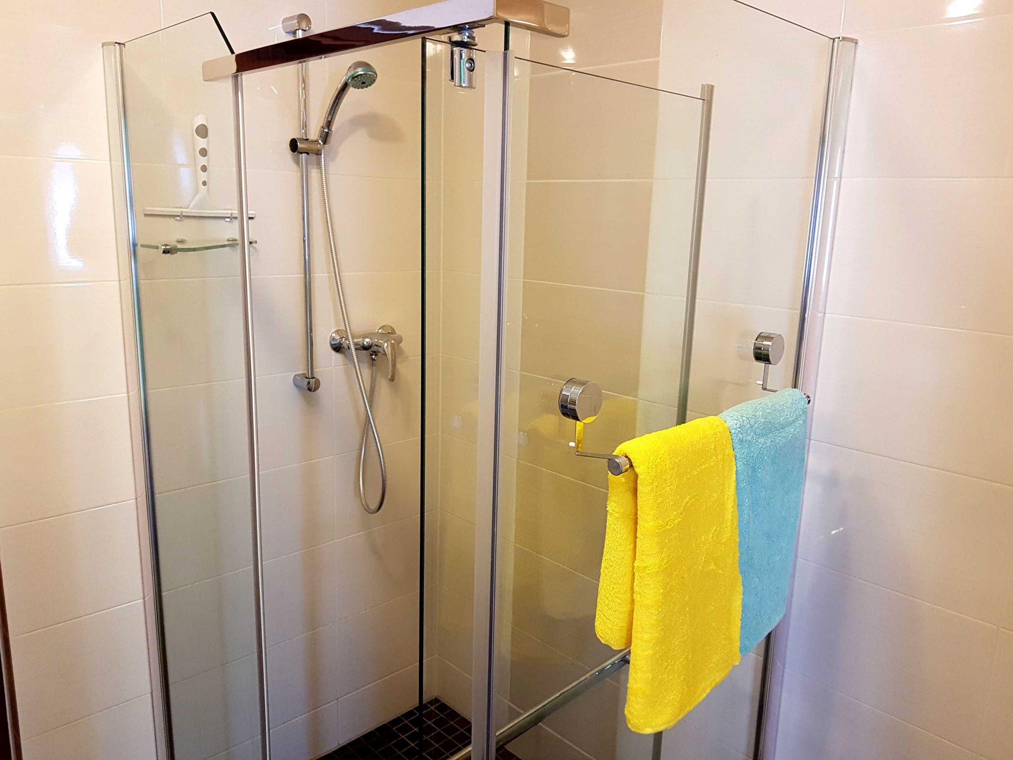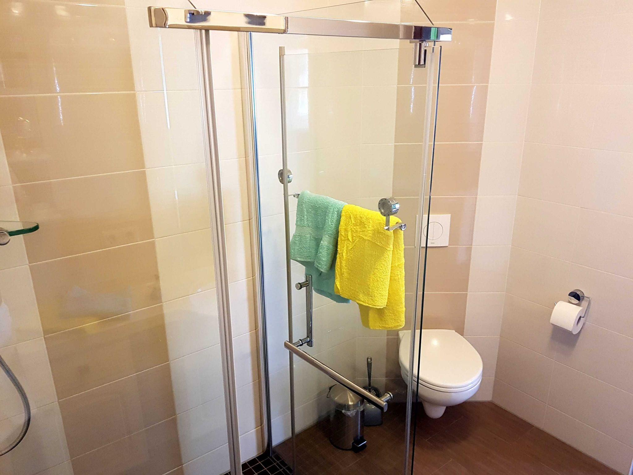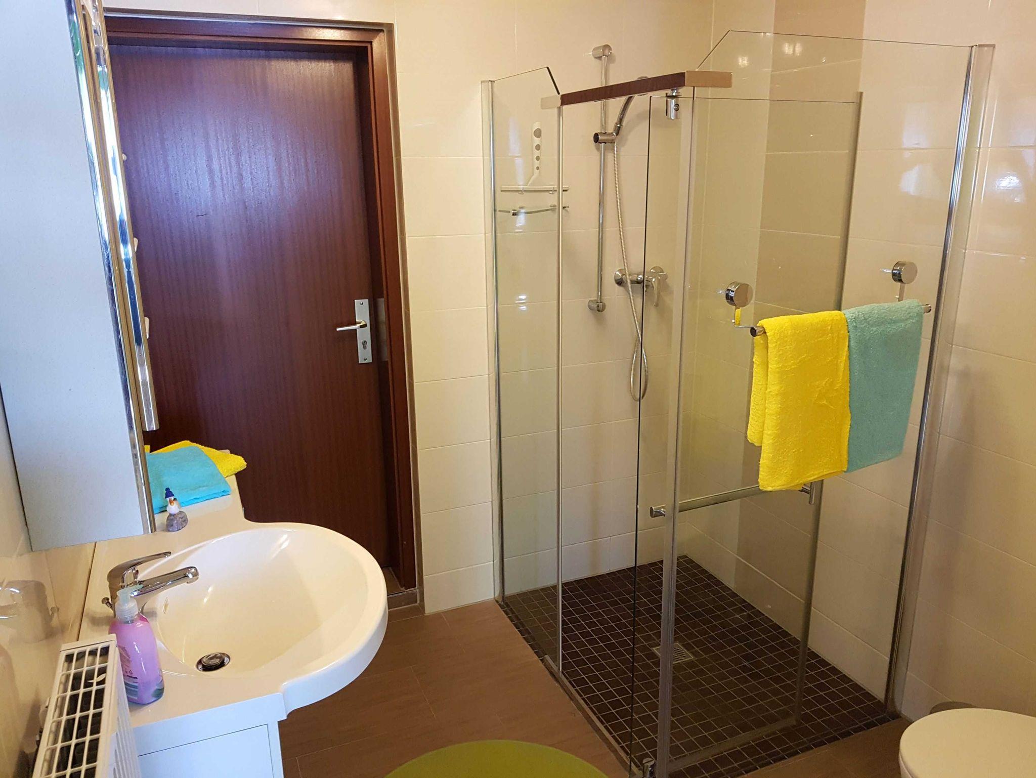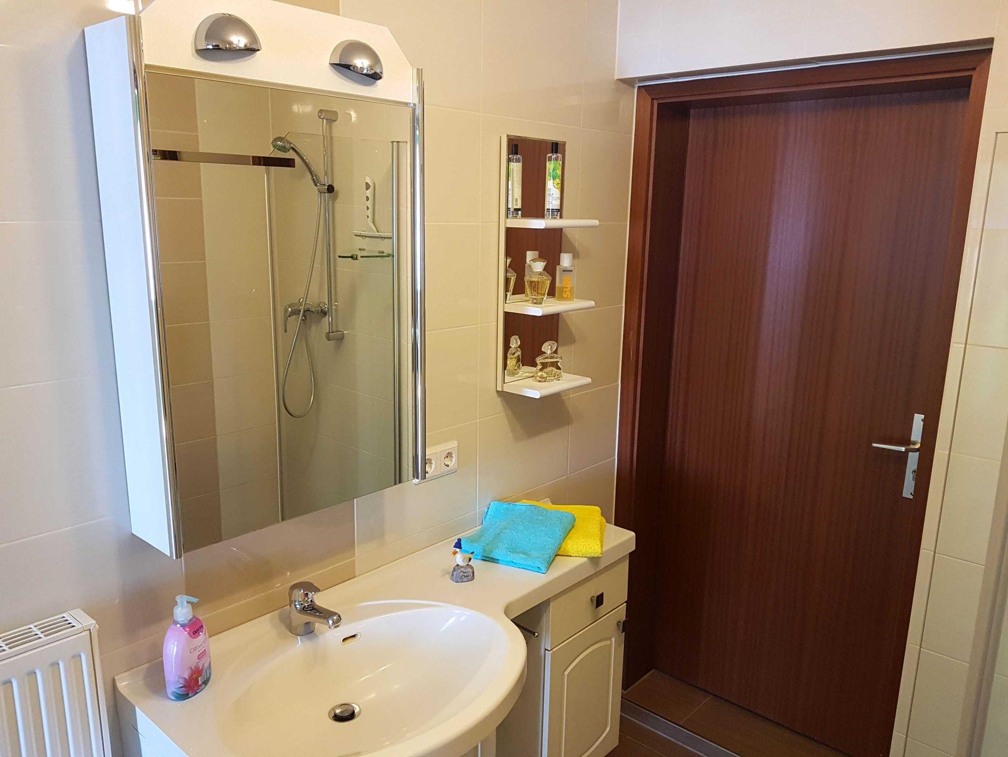 Das Bad ist komplett neu saniert und mit einer großen, modernen und ebenerdigen Dusche ausgestattet.