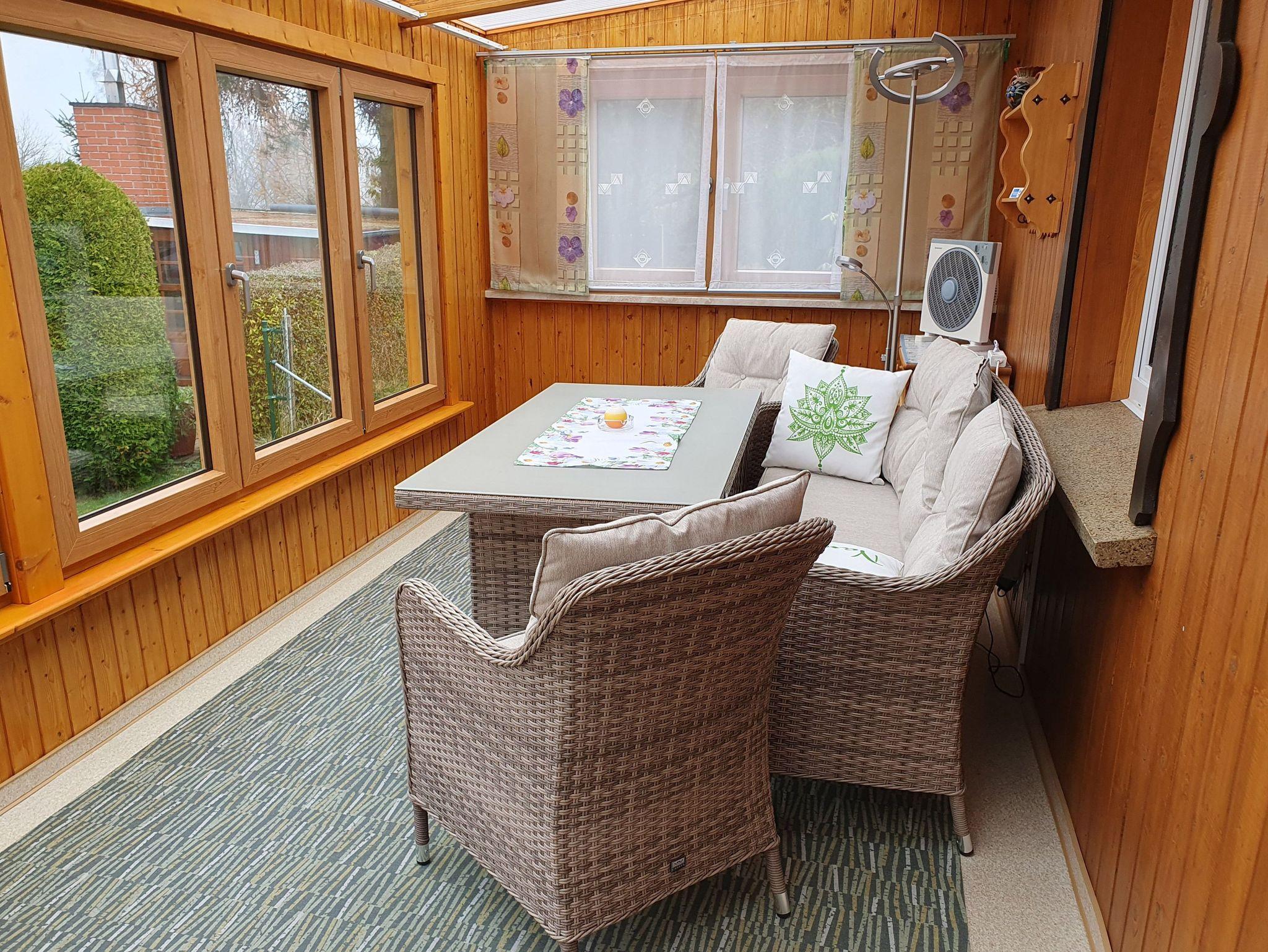 Der helle Wintergarten mit Radio und der rustikalen Sitzgruppe bietet den schönsten Ausblick auf den See und das gegenüberliegende Schloss.