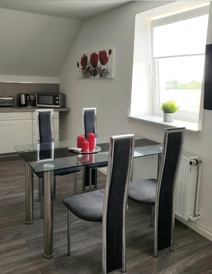 Wir Karin und Christian Buhr bieten hier unsere neu modernisierte und modern eingerichtete Ferienwohnung an. Die Wohnung ( 1 Etage ) befindet sich in Stolkerfeld , ein kleiner Ort zwischen Schleswig und Flensburg. Die Wohnung verfügt über drei Zimmer. Eine Einbauküche inkl. Herd, Backofen, Kaffeemaschine, Toaster, Wasserkocher und vieles mehr und lädt zum kochen ein. Im gemütlichen Wohnraum mit Esstisch und Sitzecke könnt ihr euch einen gemütlichen Abend mit einem Glas Wein vor dem Fernseher machen.