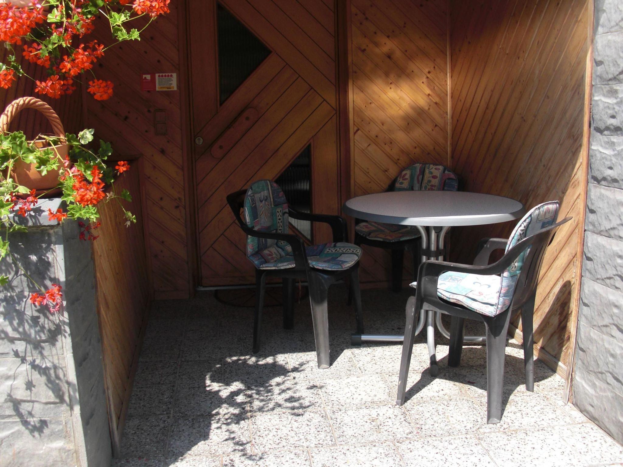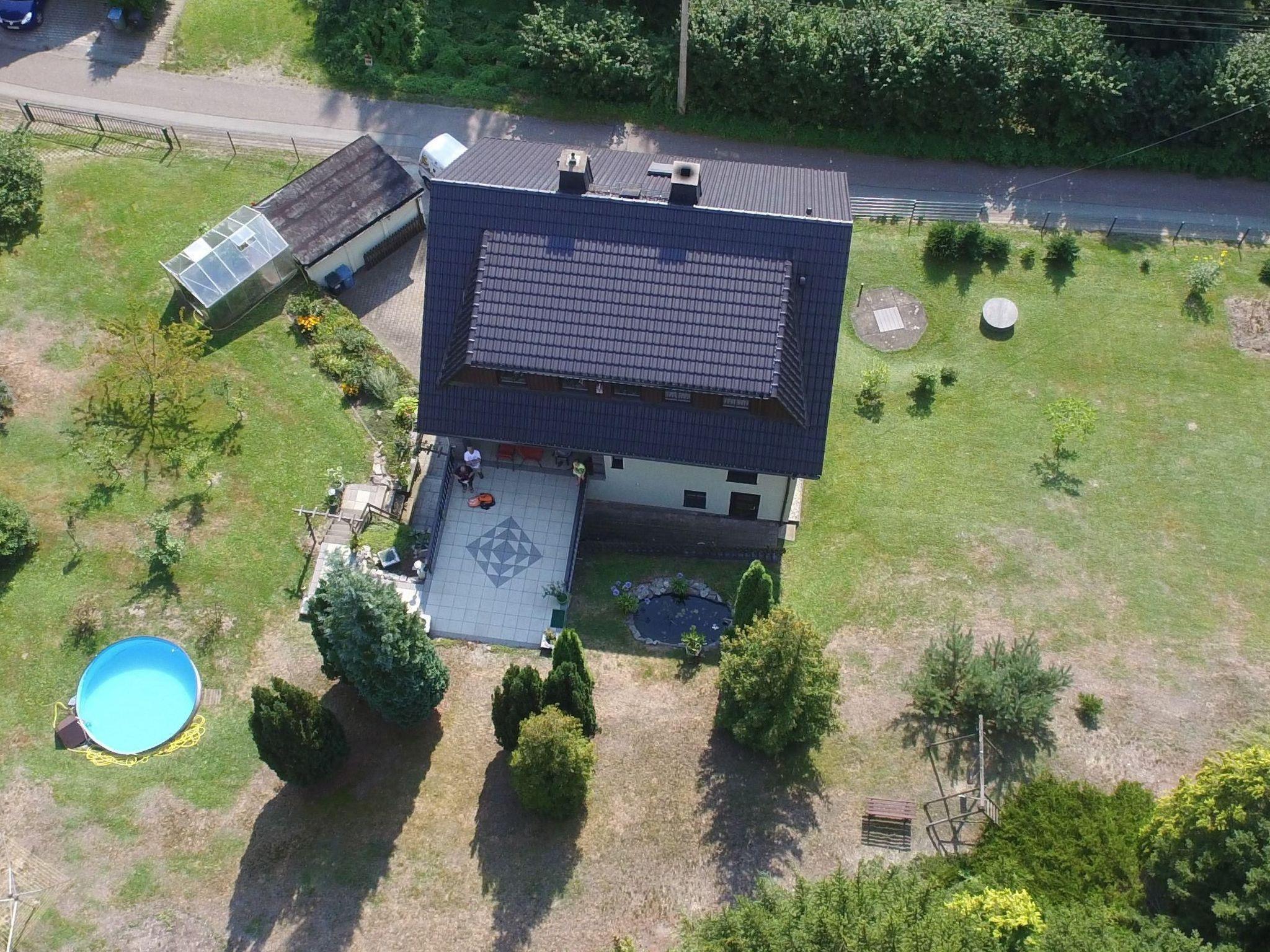 There is a car park at the house. The holiday flat has a small terrace in the entrance area. There is a large garden next to the house. The property is fenced and south-facing. In the summer months there is a pool (diameter 3.6 m and 95 cm deep) in the garden for shared use.