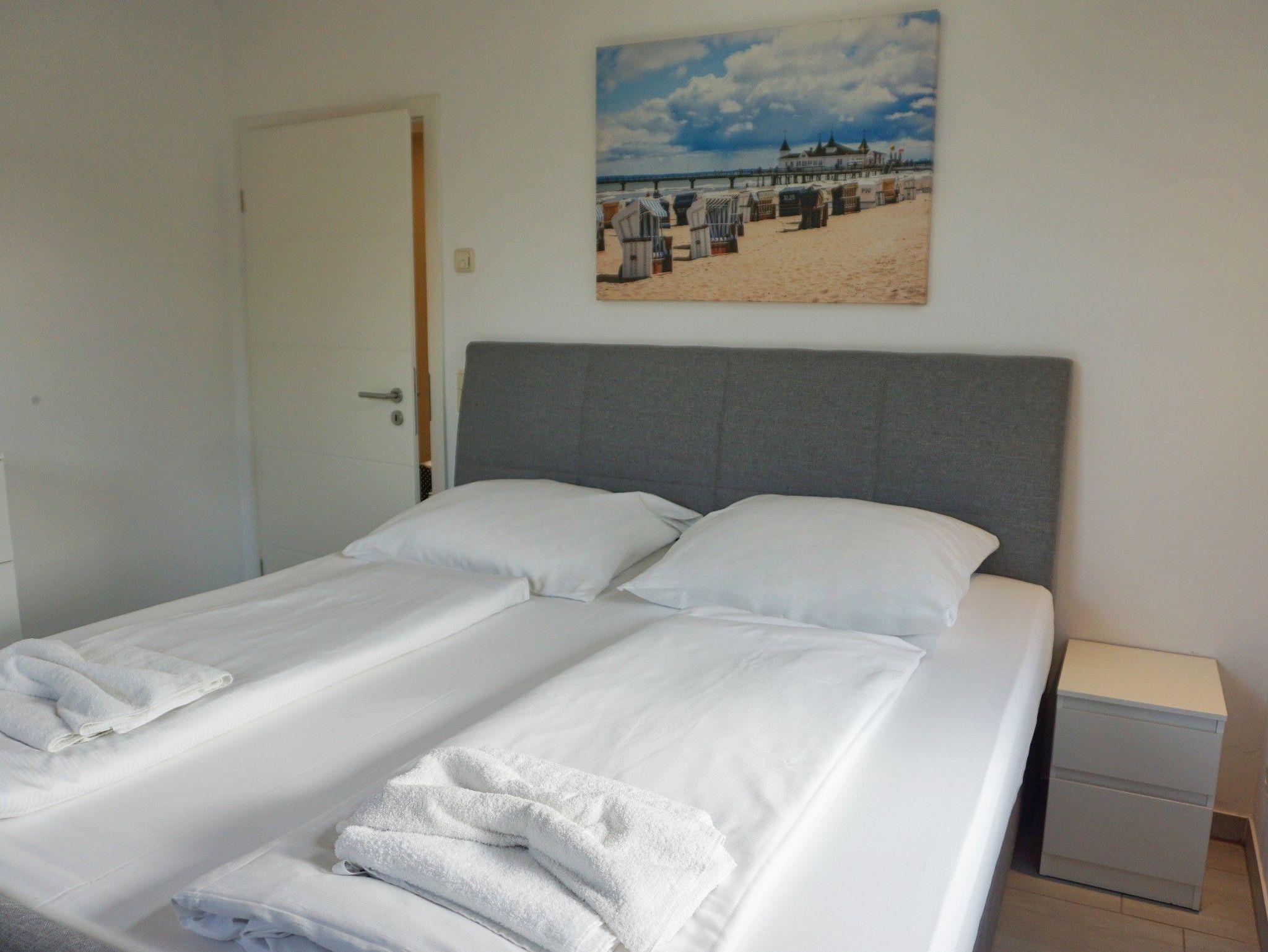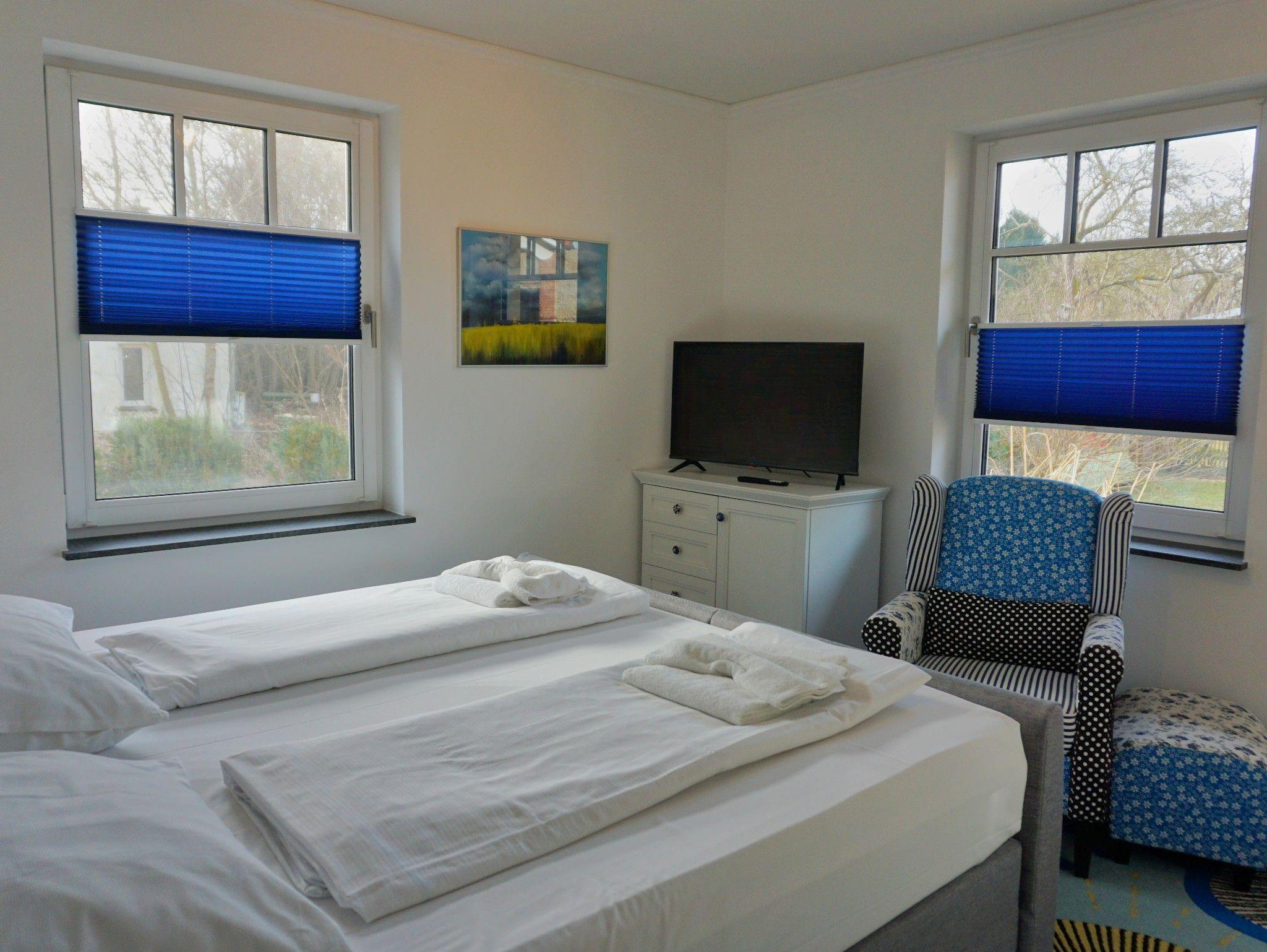 Das separate Schlafzimmer ist mit einem komfortablen Doppelbett sowie einem TV ausgestattet und bietet beste Voraussetzungen für erholsame Nächte. Abgerundet wird die Ferienwohnung durch ein modernes Tageslichtbad mit ebenerdiger Walk-In-Dusche und Rainshower-Funktion. Dank der rollstuhlfreundlichen Ausstattung ist die Wohnung auch für Gäste mit eingeschränkter Mobilität komfortabel nutzbar.