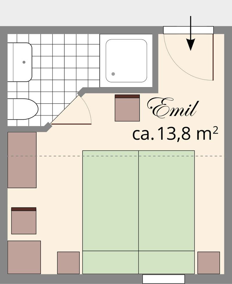 Es ist über eine massive Treppe mit 36 Stufen erreichbar, die durchgehend mit einem stabilen Metallgeländer ausgestattet ist. Das Dachfenster zeigt nach Osten und ist mit einer textilen Jalousie versehen. Das Zimmer ist im ländlichen Stil eingerichtet und verfügt über ein separates Bad mit Du/WC sowie ein Boxspringbett. Zur weiteren Ausstattung gehören ein Sat-TV, ein Beistelltisch, 2 Stühle, ein Kleiderschrank und 2 Nachttischschränkchen. Im Bad liegt ein Haartrockner bereit. WLAN steht im Zimmer sowie in der Gaststätte zur Verfügung.