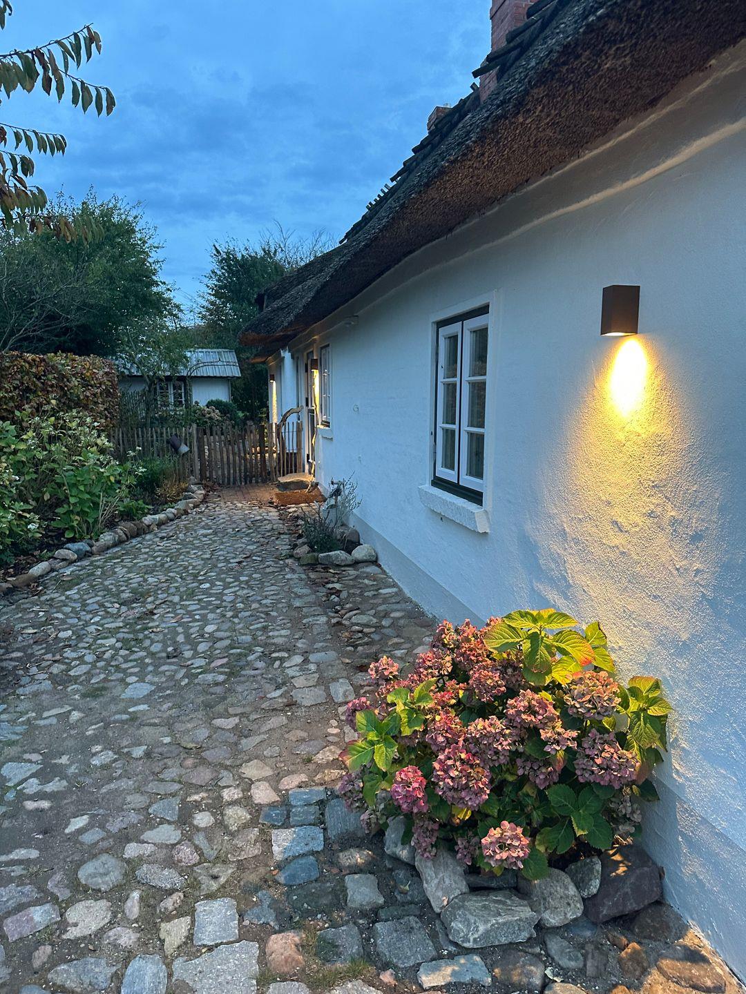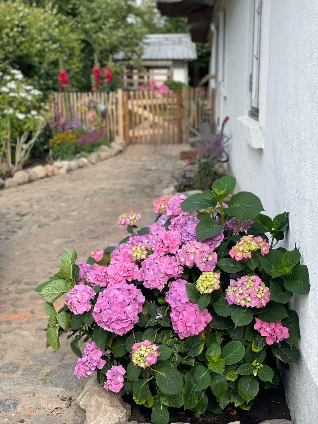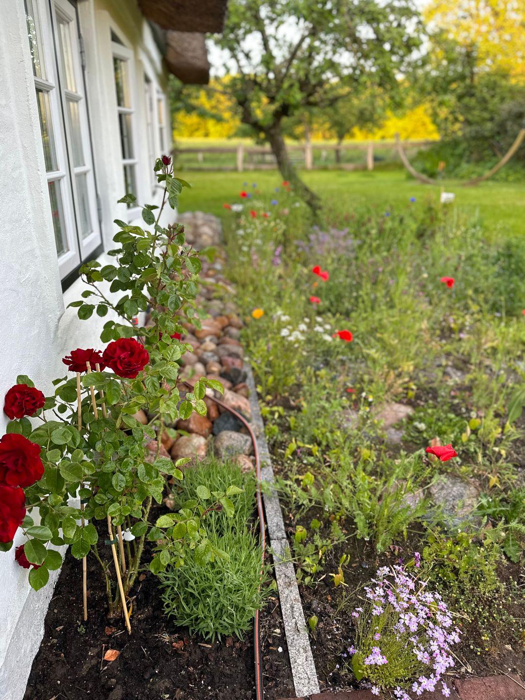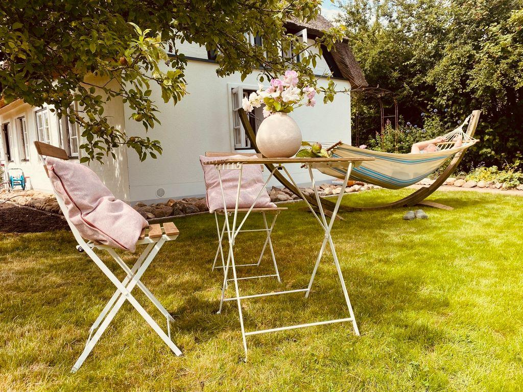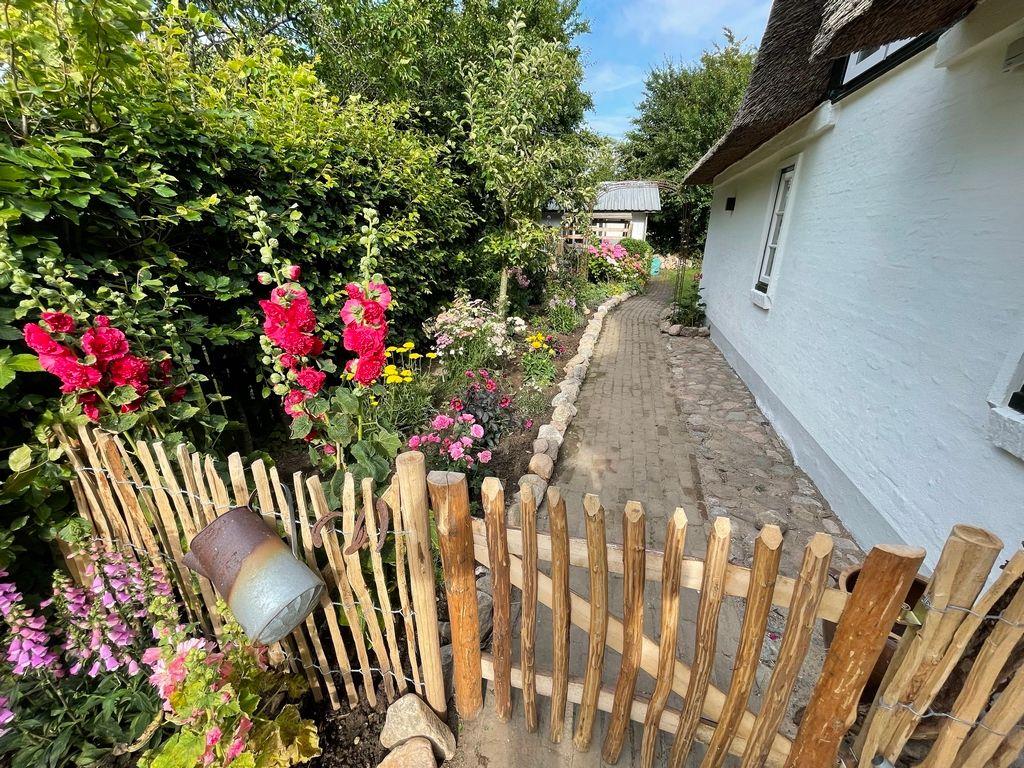 Traumhafte Reetdachkate auf dem Land mit großem Bauerngarten