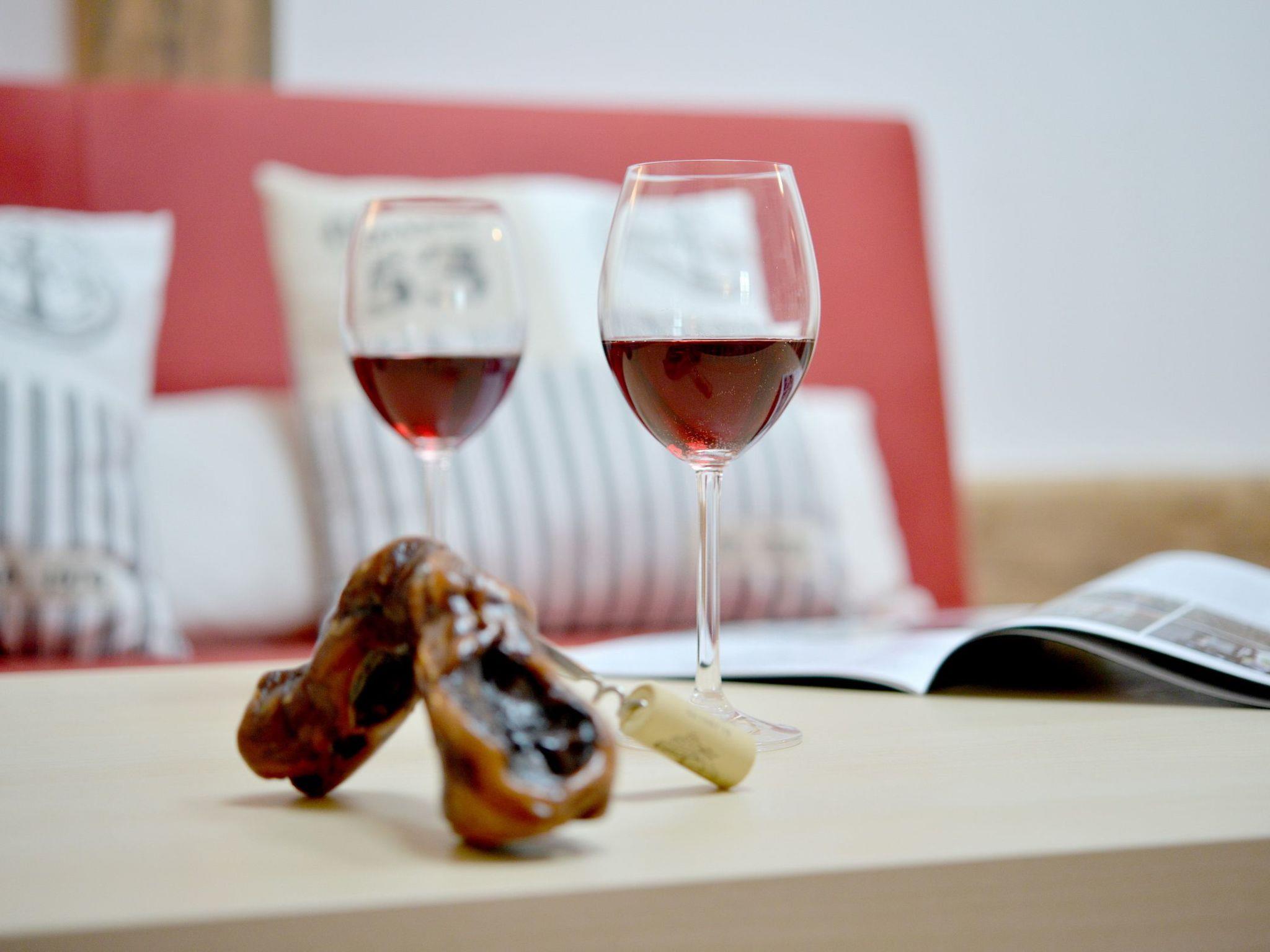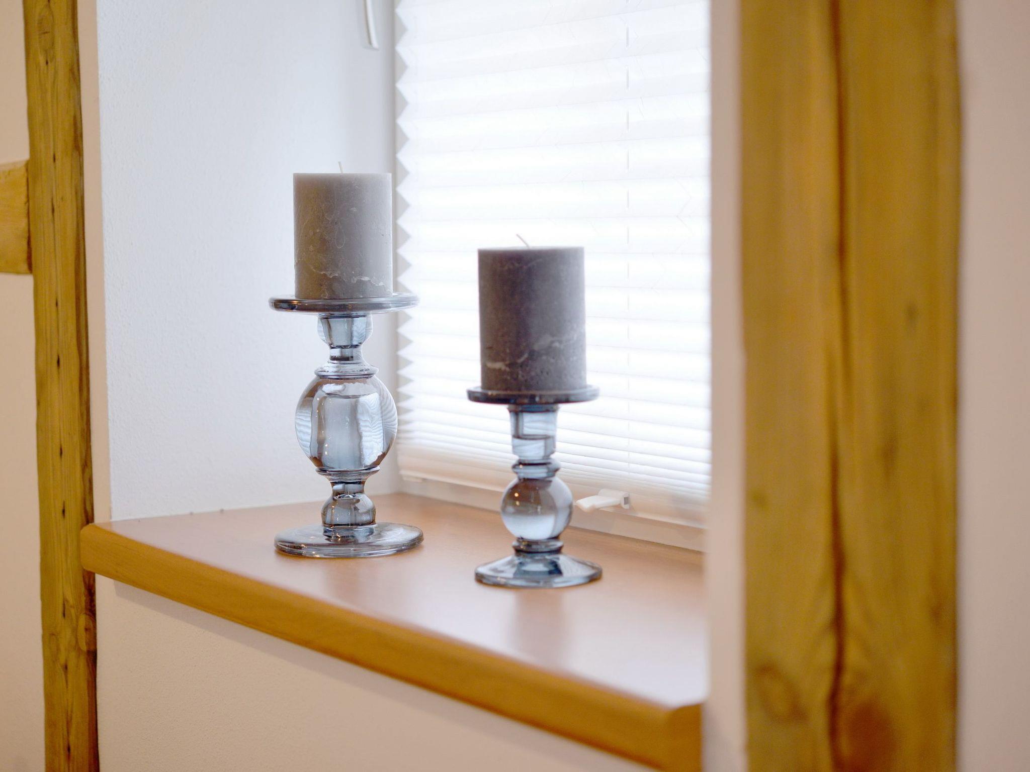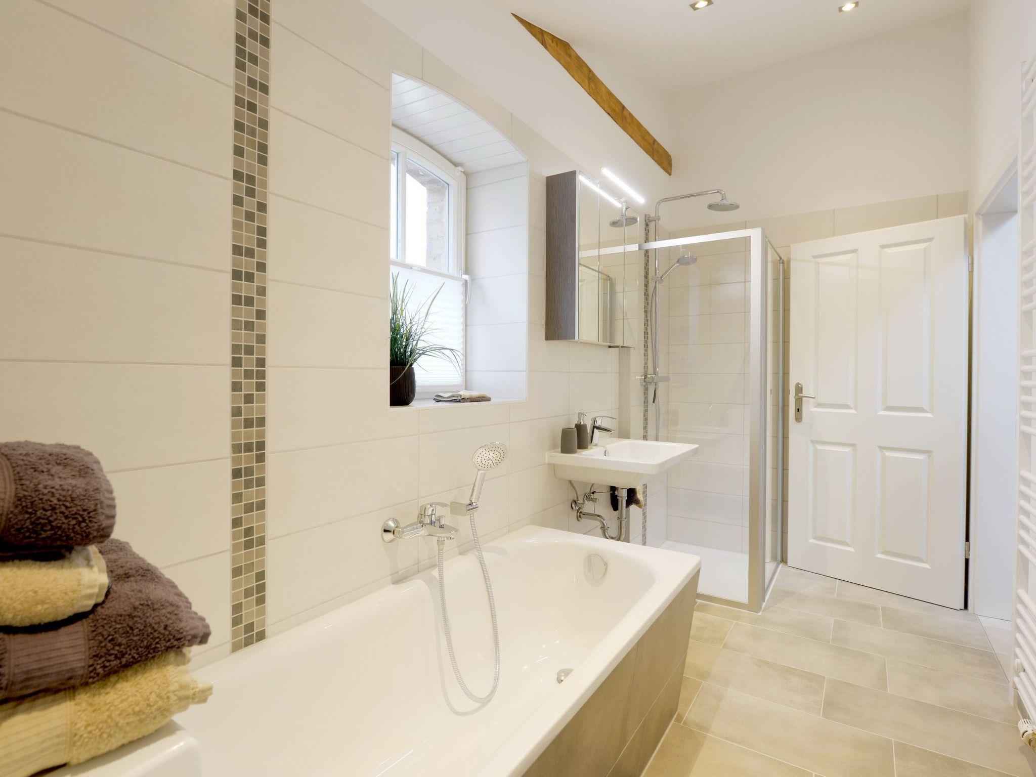 Our holiday house by the rear courtyard has a bedroom on the upper floor with a double bed and a sofa bed in the living room on the ground floor, along with the separate kitchen. There is also a lift. The upper floor also provides a bathroom with a walk-in shower, a towel radiator, a washbasin, WC and washing machine. The living room has modern furnishing and includes a dining space and a cosy sofa corner that can be converted into a bed (150cm wide). A flatscreen TV and the Wi-Fi Internet connection provide entertainment.