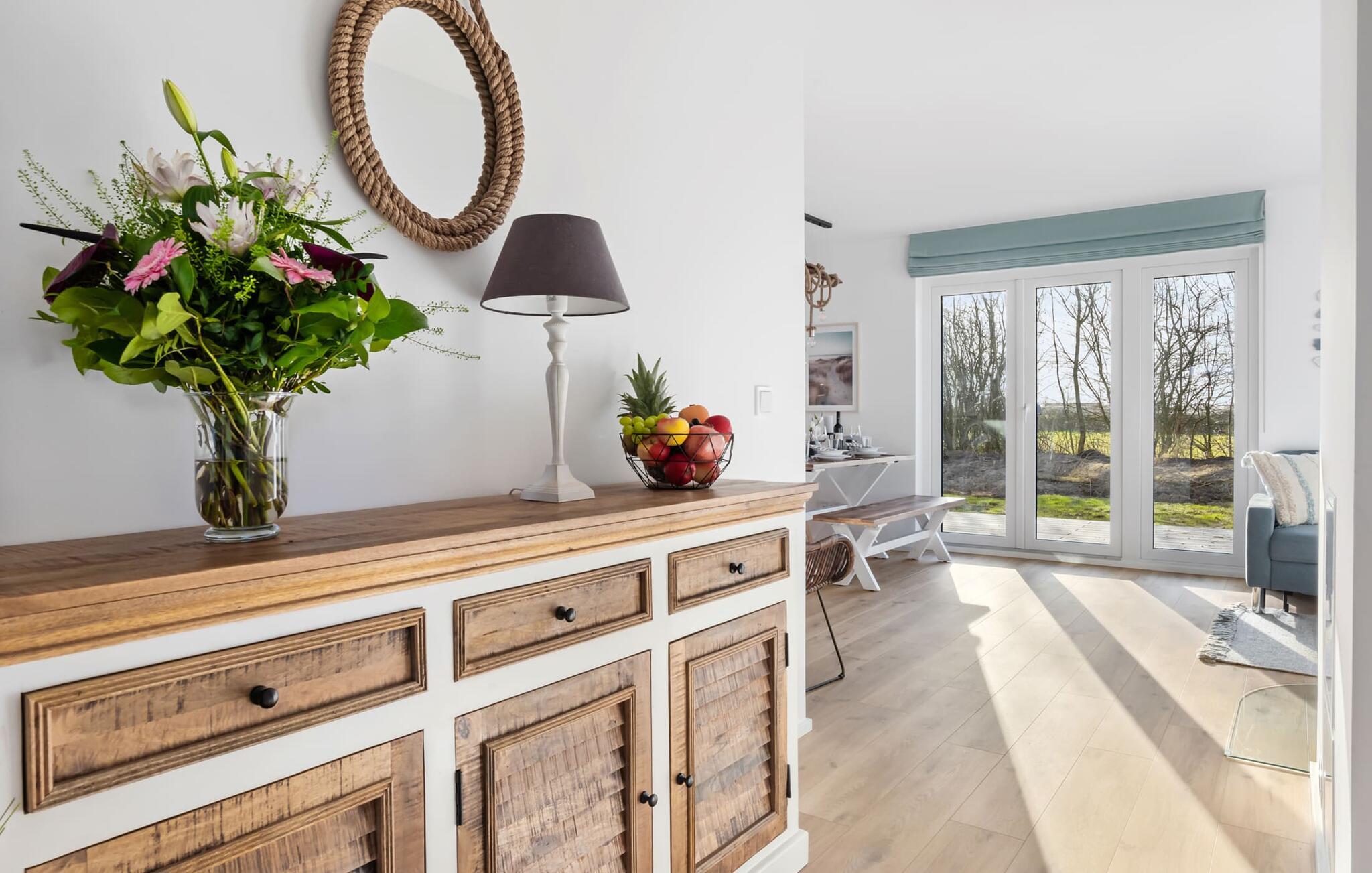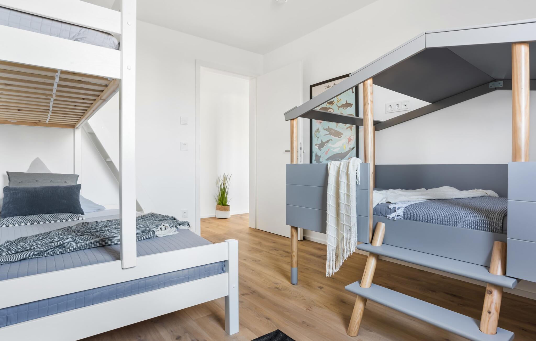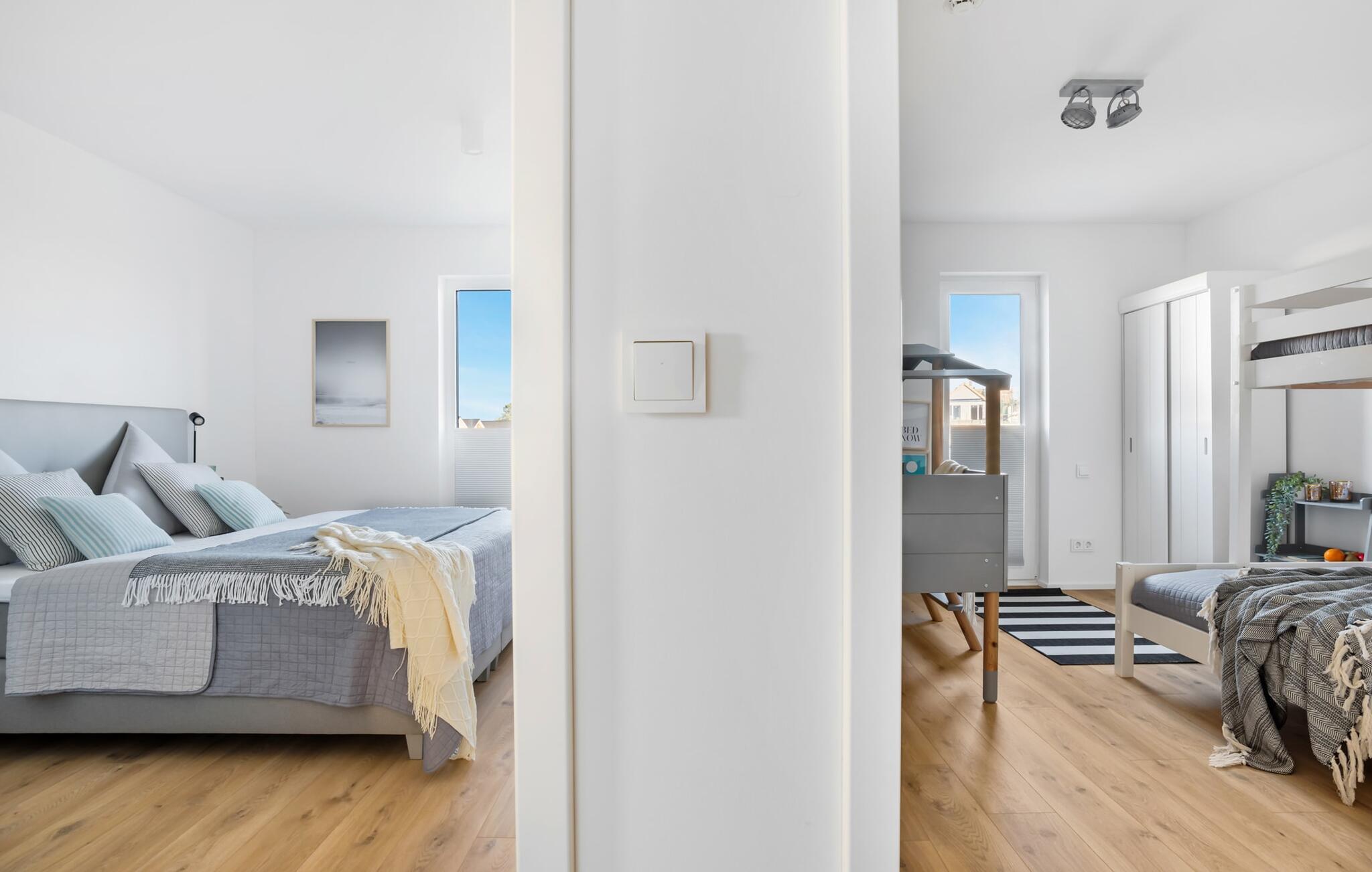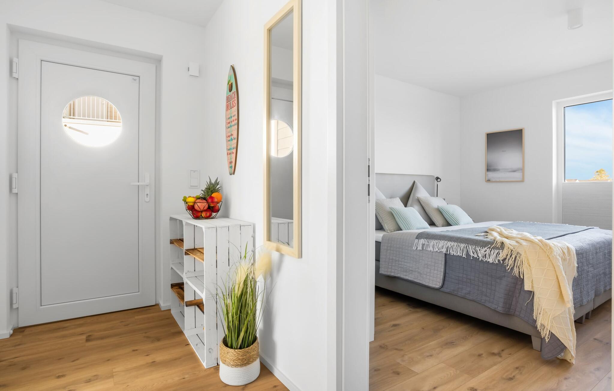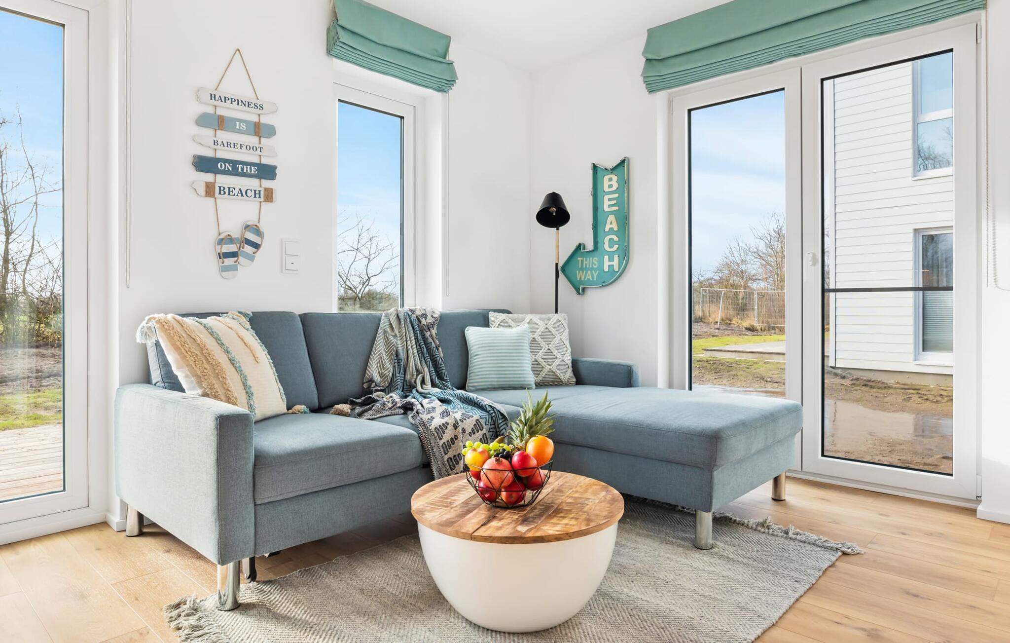 STRANDBUTZE er en rummelig, moderne og lyst indrettet ferielejlighed i hyggelig strandstil. Livet er en strand! På grund af dette og fordi det er så smukt, er der en naturlig sti direkte til stranden. Ferielejligheden ligger i stueetagen og har direkte udsigt til de naturbevarende strandenge og marker. Med en portion strandflair skaber de lyse, venlige møbler i nuancer af blå og blød beige en øjeblikkelig feriestemning. Sandstranden Weidefelder med strandstole, restaurant og kiosk ligger i gåafstand og er et attraktivt rejsemål på alle tider af året. Minigolfbanen med maritimt tema ligger også i umiddelbar nærhed og glæder både store og små. Med sin gulv-til-loft vinduesfront og den store tilstødende terrasse er den lyse åbne stue/alrum lejlighedens hjerte. Gå ind og føl med det samme, at I er på ferie med garanti! En behagelig sofa i stuen, et fjernsyn og en pejs spreder hyggelig varme og hygge selv på knap så hyggelige dage. Når man ser på naturen finder man ro.... Hverdagen bliver mere og mere fjern. På den sydvestvendte terrasse i direkte tilknytning til opholds- og spiseafdelingen, langt væk fra travlheden i resten af ferieområdet, kan I nyde den friske havbrise i fulde drag. Med den bagudvendte udsigt over de naturbeskyttede strandenge og marker inviterer de stillede havemøbler til at nyde gode grillaftener. Eller tag jer tid til kreativ madlavning under jeres ferie, det fuldt udstyrede køkken-alrum lader intet tilbage at ønske. Der er forskellige tilberedningsmuligheder tilgængelige for alle kaffefans, fra filterkaffe til cappuccino. Der er to soveværelser med komfortable senge til en afslappende søvn. Det første soveværelse er udstyret med en dobbelt boxmadrasser (180 x 200 cm), mens det andet soveværelse har en familieloftsseng (nederst 140 x 200 cm; top 90 x 200) og en cool strandhusseng til de mindste ( 90 x 200) sikrer smukke drømme. Derudover har begge soveværelser mørklægningsmuligheder, som bidrager til uforstyrret søvn. Derudover kan sofaen med få enkle trin omdannes til en ekstra soveplads (100 x x200 cm). En rejseseng og en høj stol er også tilgængelige for yngre gæster. Bruserummet med brusebad i gulvniveau og infrarød kabine sikrer uforglemmelige wellness-øjeblikke, som I kan nyde i lang tid. For at give en hel feriekomfort finder I jeres egen parkeringsplads foran ferielejligheden. Vores foretrukne sted: at nyde varmen fra den knitrende pejs fra sofaen efter en dag på stranden... Bemærk venligst: OstseeResort Olpenitz er meget populært, og der bygges fortsat i parken. Ikke desto mindre kan I se frem til en 5-stjernet standard og et førsteklasses ophold. Byggeaktiviteterne kommer ikke til at forstyrre jer på ferien, og derfor gives der ikke yderligere afslag i prisen.