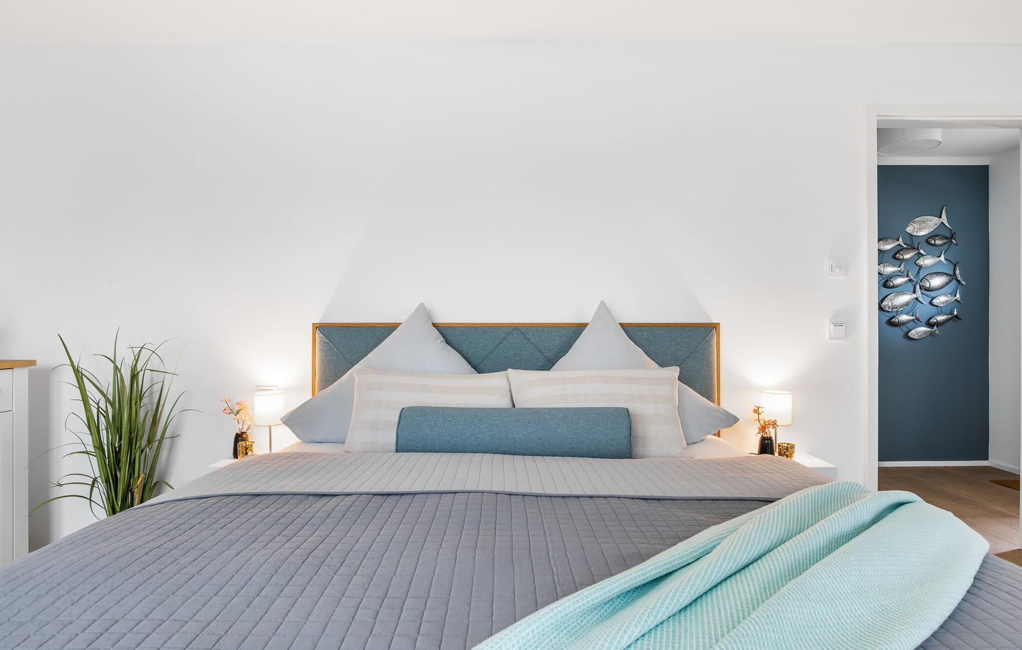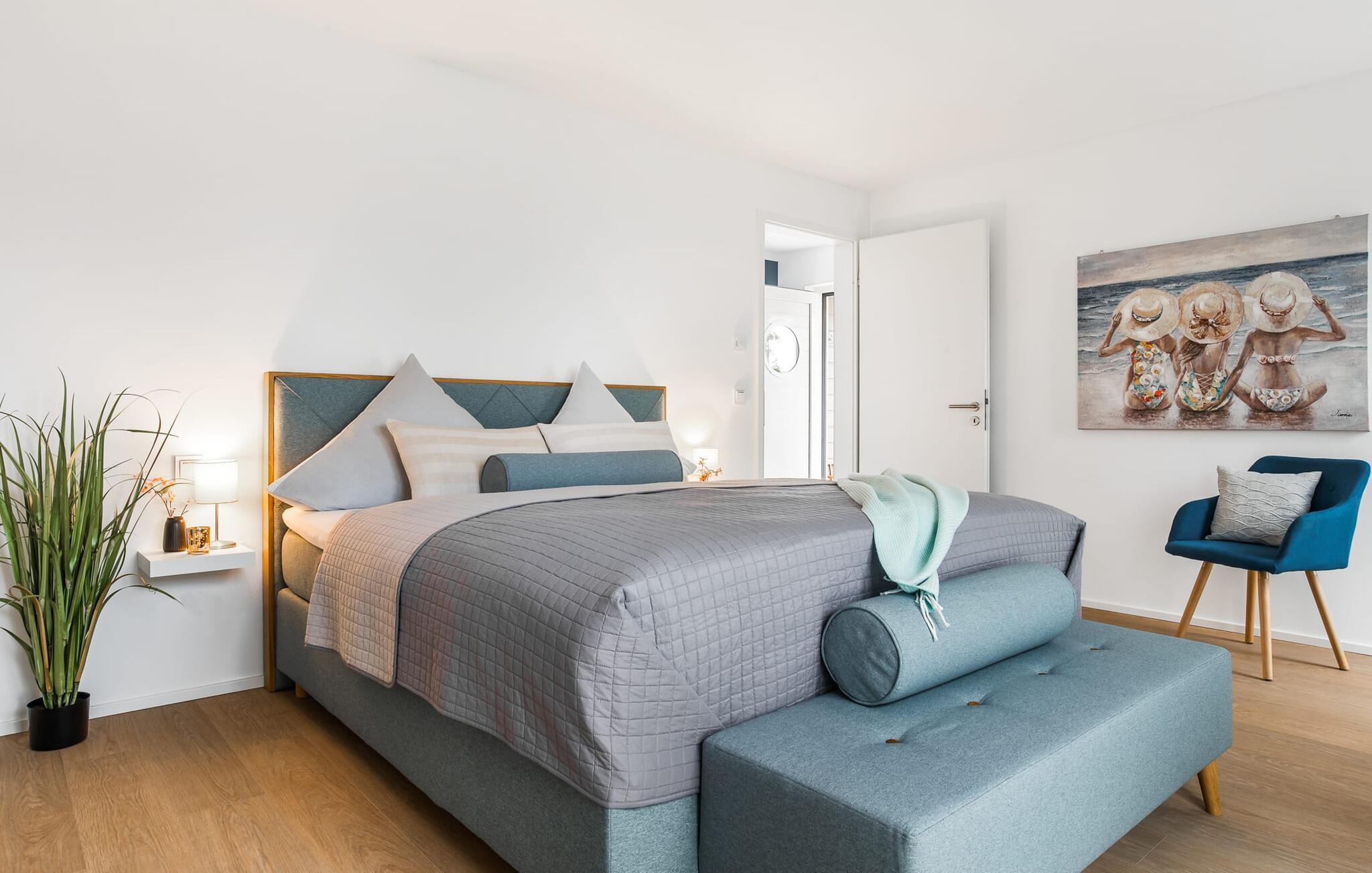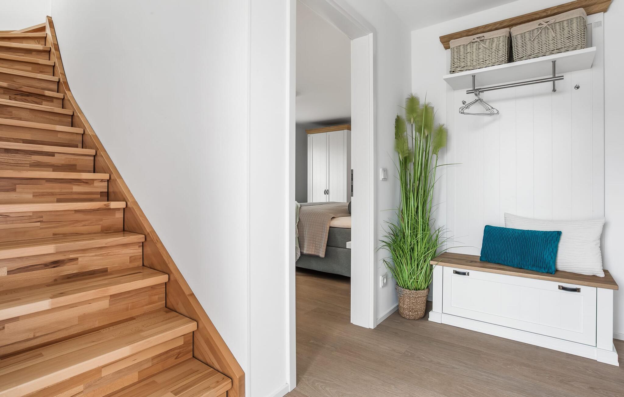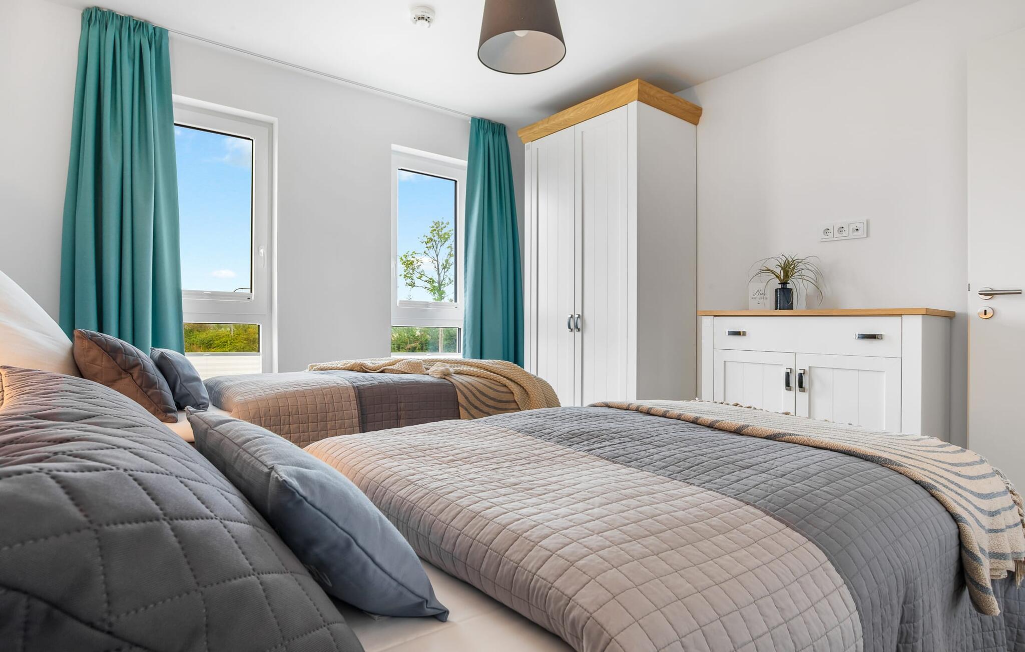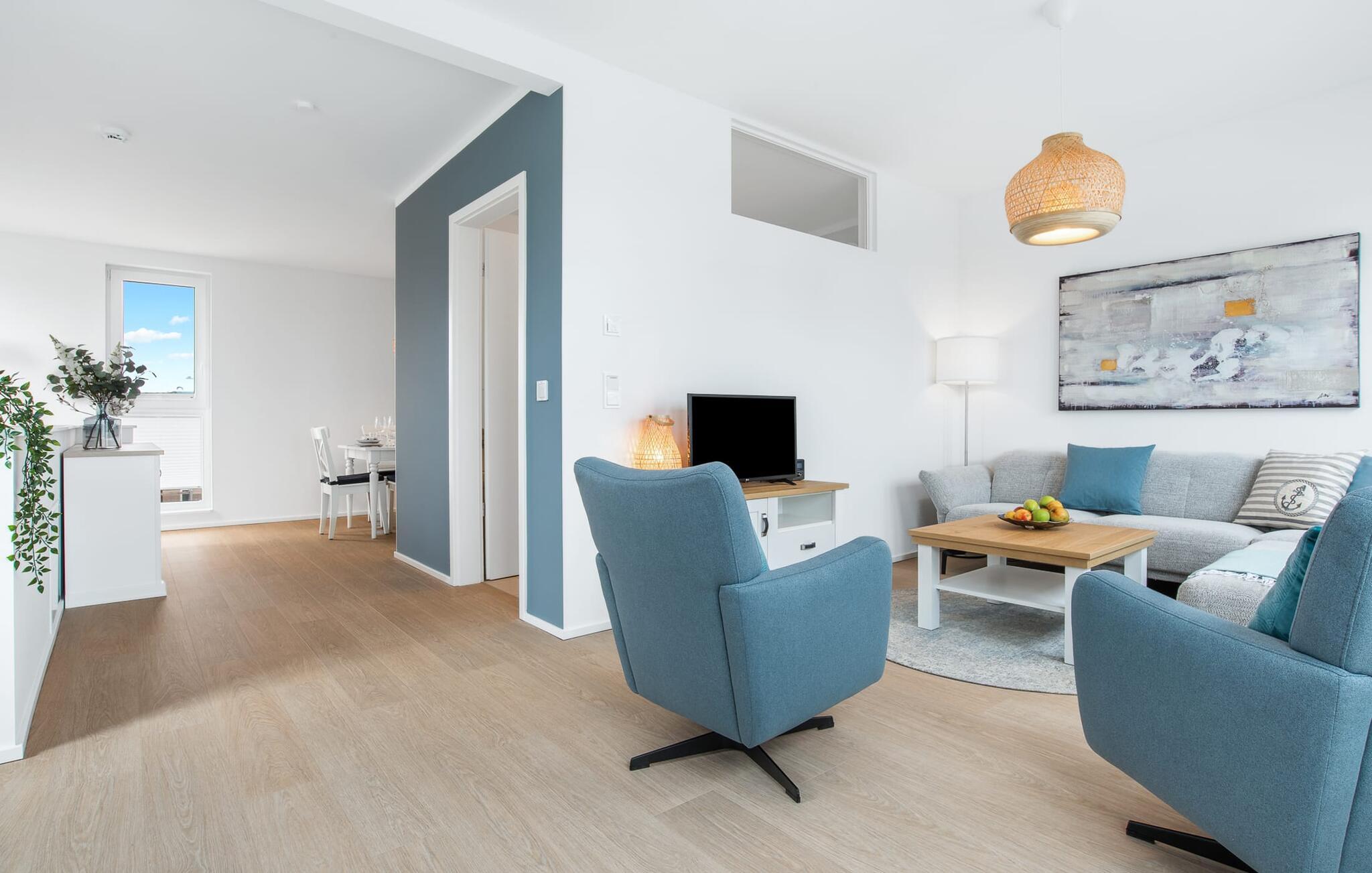 Den rummelige maisonette-ferielejlighed STRANDDECK til 6 personer ligger på første og anden sal og tilbyder direkte udsigt over de naturbevarende strandenge og marker. Sandstranden Weidefelder med kiosk, restaurant og strandstole ligger i gåafstand og er et attraktivt rejsemål på alle tider af året. Minigolfbanen med maritimt tema ligger også i umiddelbar nærhed og glæder både store og små. Når I træder ind i ferielejligheden på første sal, begynder nedbremsningen fra allerførste øjeblik. I er direkte i lejlighedens afslapningsområde. Lejlighedens tre soveværelser er placeret på denne etage. Uanset hvilket soveværelse I vælger, kan I være sikker på en afslappende søvn. Et soveværelse er udstyret med en dobbeltseng og et fjernsyn. De to andre soveværelser har hver to enkeltsenge til afslappende nætter på ferie. På denne etage er der også et veludstyret badeværelse med bruser i gulvniveau og infrarød sauna. En oase af velvære, der sikrer ren afslapning i hver sæson. En gang på anden sal lever STRANDDECK op til sit navn. Indrettet til høj standard i landstedsstil med maritime elementer, bydes I velkommen af en vinduesfront fra gulv til loft med tilstødende terrasse og udsigt til de naturbeskyttede strandenge. At komme ind og straks føle sig hjemme er én ting. At slappe af i den hyggelige opholdsstue, nyde naturens fred og ro ud af vinduet eller se tv er ren afslapning og afslapning! Hverdagen bliver mere og mere fjern... Skulle vejret nogensinde blive nordisk, vil pejsen med sin brølende ild give yderligere hygge. Det integrerede køkken er perfekt udstyret, og det er sjovt at lave mad sammen. Så nyd de færdige lækkerier på terrassen, som også er udstyret til høj standard, eller start en hyggelig grillaften... Det er ren ferie. Direkte fra opholdsområdet kommer man ind på den store terrasse med syd-vest orientering. Vender mod bagsiden med udsigt til de naturbevarende strandenge, Østersøen, marker og havet, er hyggelige timer garanteret. Et andet komplet badeværelse med bruser og badekar afrunder ideelt set hele pakken til en afslappende ferie. Foran ferielejligheden finder I jeres egen parkeringsplads. Vores favoritsted: Afslut en vidunderlig dag på terrassen med en klar udsigt over naturreservatet mod Østersøen. Bemærk venligst: OstseeResort Olpenitz er meget populært, og der bygges fortsat i parken. Ikke desto mindre kan I se frem til en 5-stjernet standard og et førsteklasses ophold. Byggeaktiviteterne kommer ikke til at forstyrre jer på ferien, og derfor gives der ikke yderligere afslag i prisen.