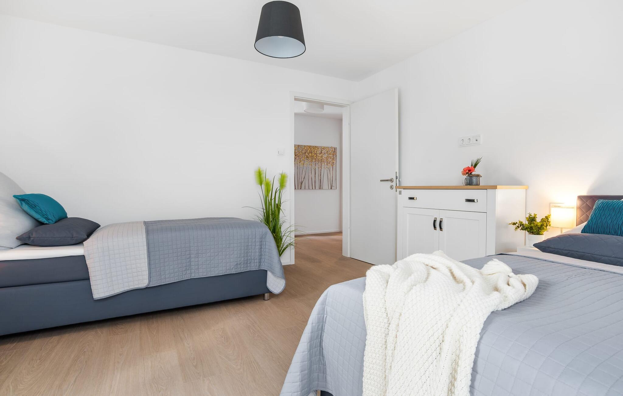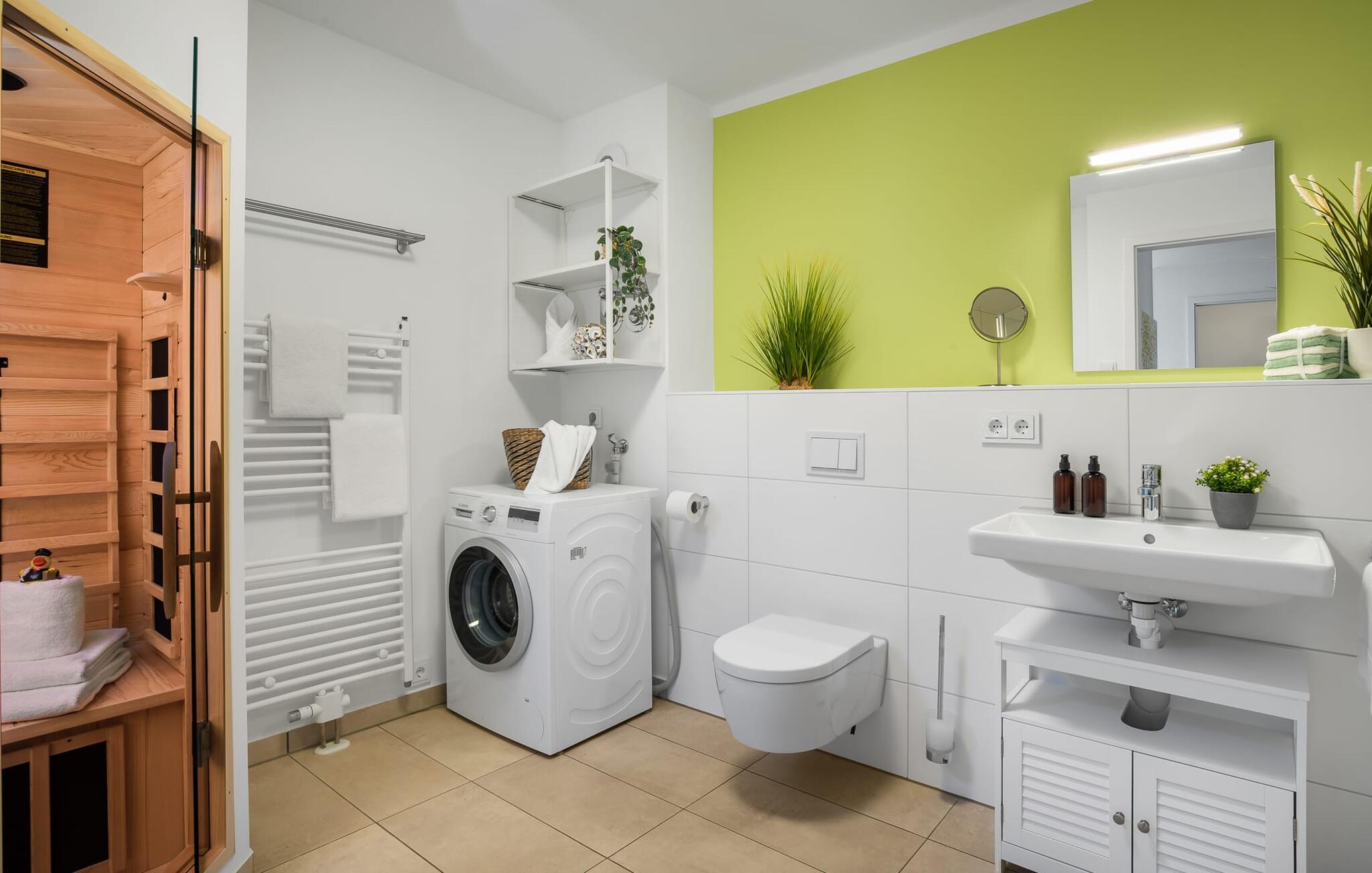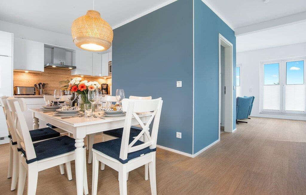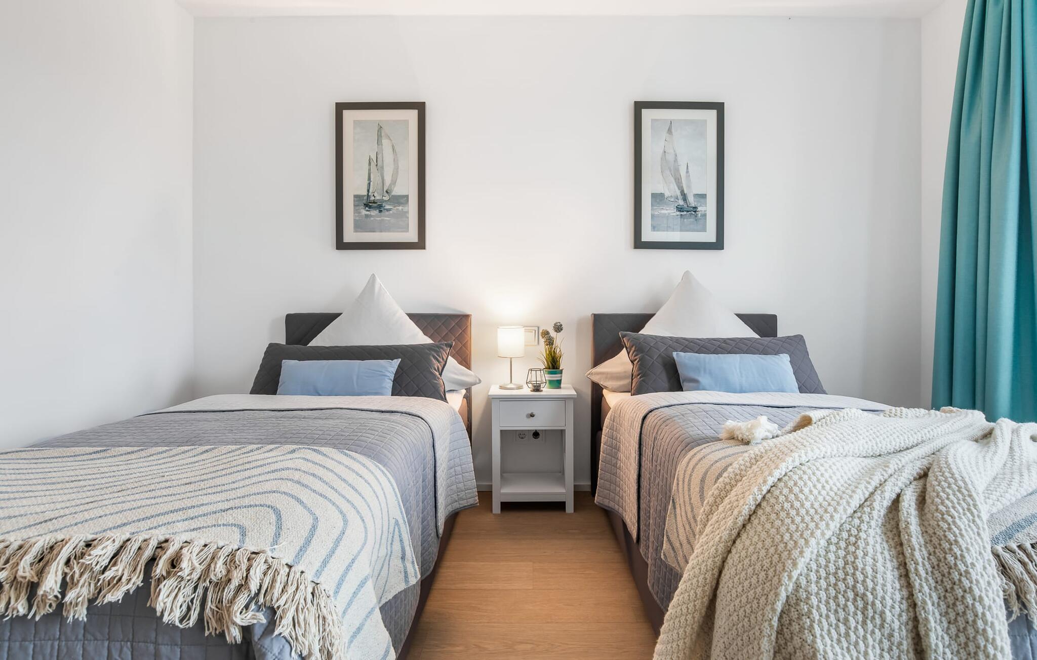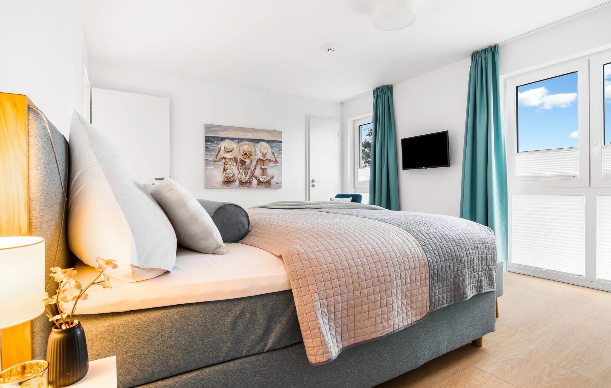 Den rummelige maisonette-ferielejlighed STRANDDECK til 6 personer ligger på første og anden sal og tilbyder direkte udsigt over de naturbevarende strandenge og marker. Sandstranden Weidefelder med kiosk, restaurant og strandstole ligger i gåafstand og er et attraktivt rejsemål på alle tider af året. Minigolfbanen med maritimt tema ligger også i umiddelbar nærhed og glæder både store og små. Når I træder ind i ferielejligheden på første sal, begynder nedbremsningen fra allerførste øjeblik. I er direkte i lejlighedens afslapningsområde. Lejlighedens tre soveværelser er placeret på denne etage. Uanset hvilket soveværelse I vælger, kan I være sikker på en afslappende søvn. Et soveværelse er udstyret med en dobbeltseng og et fjernsyn. De to andre soveværelser har hver to enkeltsenge til afslappende nætter på ferie. På denne etage er der også et veludstyret badeværelse med bruser i gulvniveau og infrarød sauna. En oase af velvære, der sikrer ren afslapning i hver sæson. En gang på anden sal lever STRANDDECK op til sit navn. Indrettet til høj standard i landstedsstil med maritime elementer, bydes I velkommen af en vinduesfront fra gulv til loft med tilstødende terrasse og udsigt til de naturbeskyttede strandenge. At komme ind og straks føle sig hjemme er én ting. At slappe af i den hyggelige opholdsstue, nyde naturens fred og ro ud af vinduet eller se tv er ren afslapning og afslapning! Hverdagen bliver mere og mere fjern... Skulle vejret nogensinde blive nordisk, vil pejsen med sin brølende ild give yderligere hygge. Det integrerede køkken er perfekt udstyret, og det er sjovt at lave mad sammen. Så nyd de færdige lækkerier på terrassen, som også er udstyret til høj standard, eller start en hyggelig grillaften... Det er ren ferie. Direkte fra opholdsområdet kommer man ind på den store terrasse med syd-vest orientering. Vender mod bagsiden med udsigt til de naturbevarende strandenge, Østersøen, marker og havet, er hyggelige timer garanteret. Et andet komplet badeværelse med bruser og badekar afrunder ideelt set hele pakken til en afslappende ferie. Foran ferielejligheden finder I jeres egen parkeringsplads. Vores favoritsted: Afslut en vidunderlig dag på terrassen med en klar udsigt over naturreservatet mod Østersøen. Bemærk venligst: OstseeResort Olpenitz er meget populært, og der bygges fortsat i parken. Ikke desto mindre kan I se frem til en 5-stjernet standard og et førsteklasses ophold. Byggeaktiviteterne kommer ikke til at forstyrre jer på ferien, og derfor gives der ikke yderligere afslag i prisen.