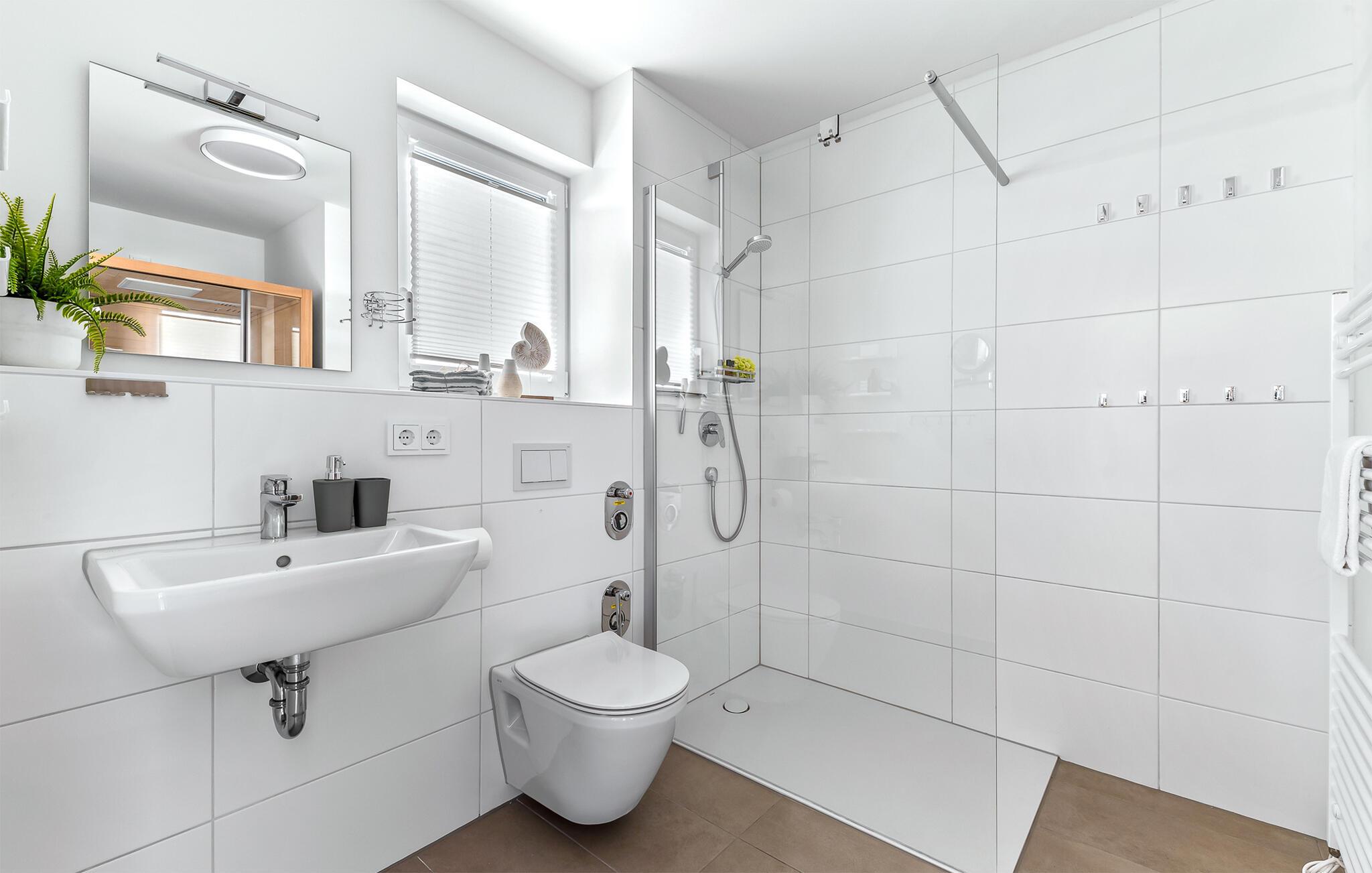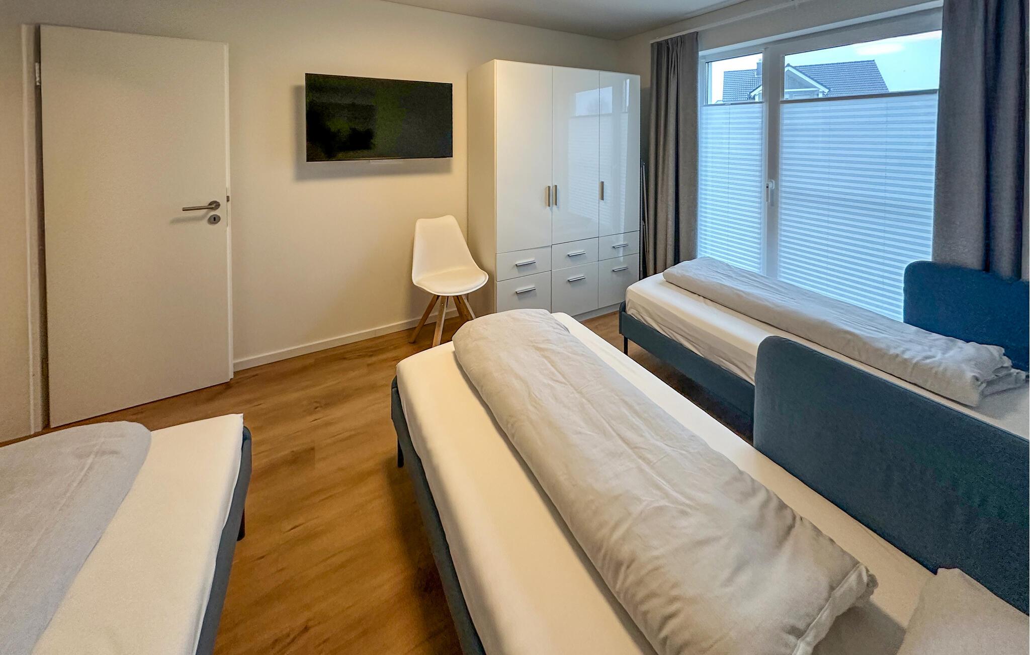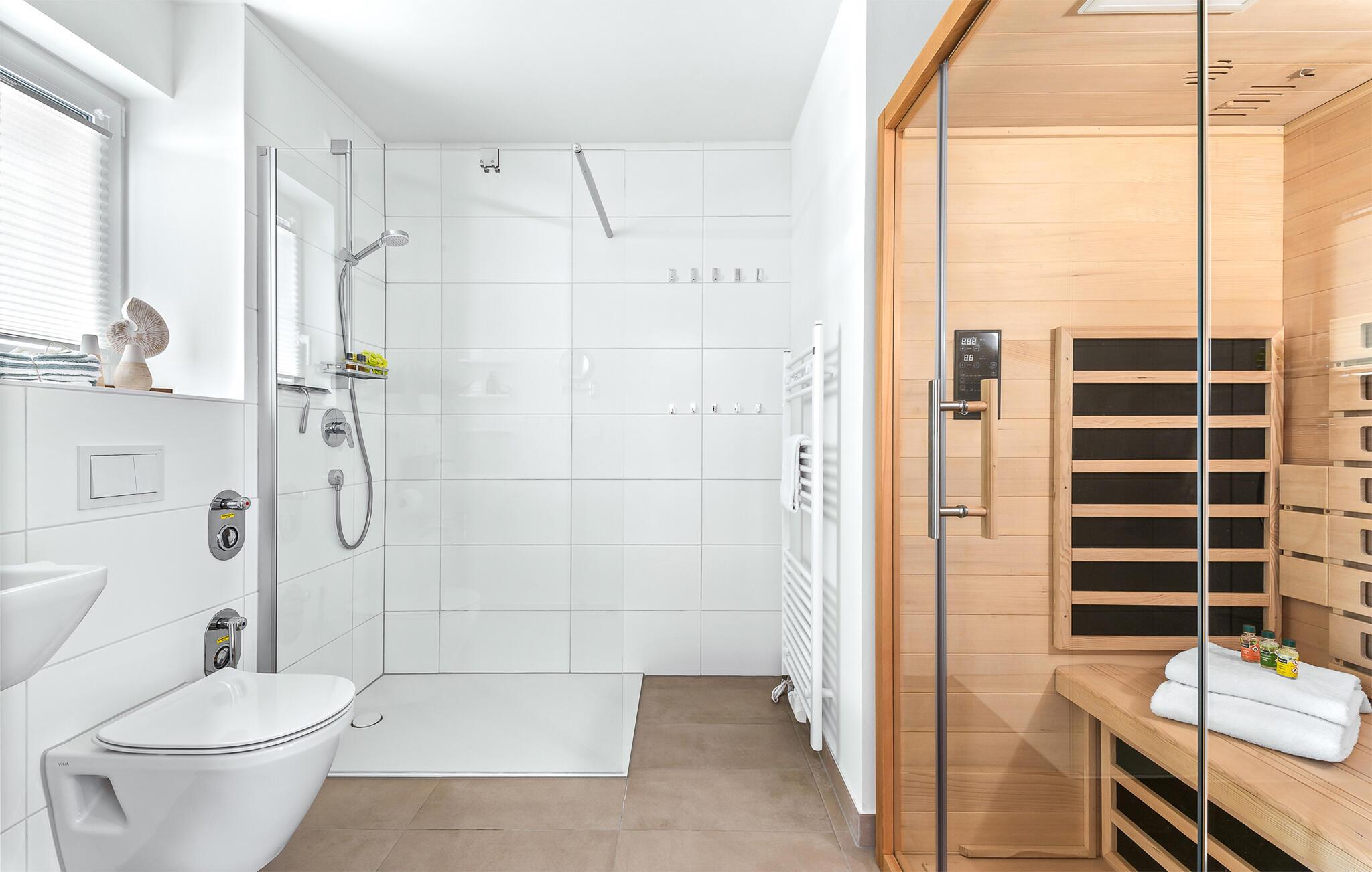 De to soveværelser er stilfuldt og komfortabelt indrettede og tilbyder jer en afslappende søvn i komfortable senge. Det første soveværelse er udstyret med en stor dobbeltseng (180x200cm) og et fjernsyn og det andet soveværelse har tre enkeltsenge og også et tv. I det luksuriøse badeværelse kan I forfriske jer i brusebadet på gulvniveau eller slappe af i den infrarøde kabine og mærke den behagelige varme på jeres hud.