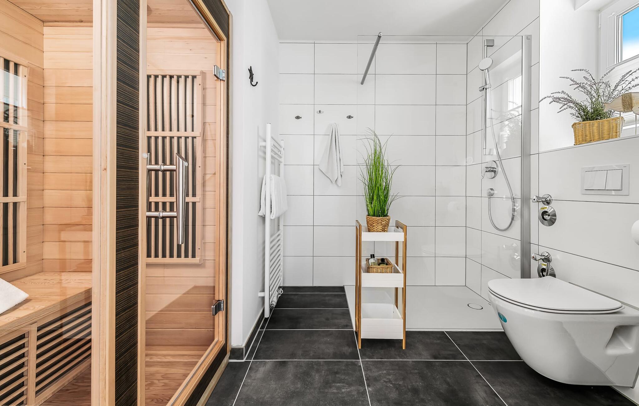 Efter en lang gåtur på stranden er badeværelset i BEACH SHELL en absolut oase af velvære! Badeværelset har brusebad i gulvniveau og infrarød sauna. Ren afslapning!