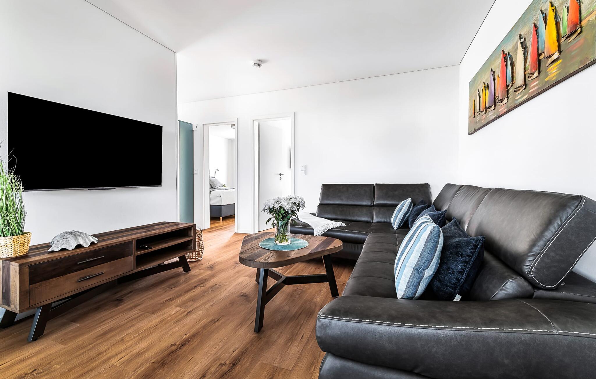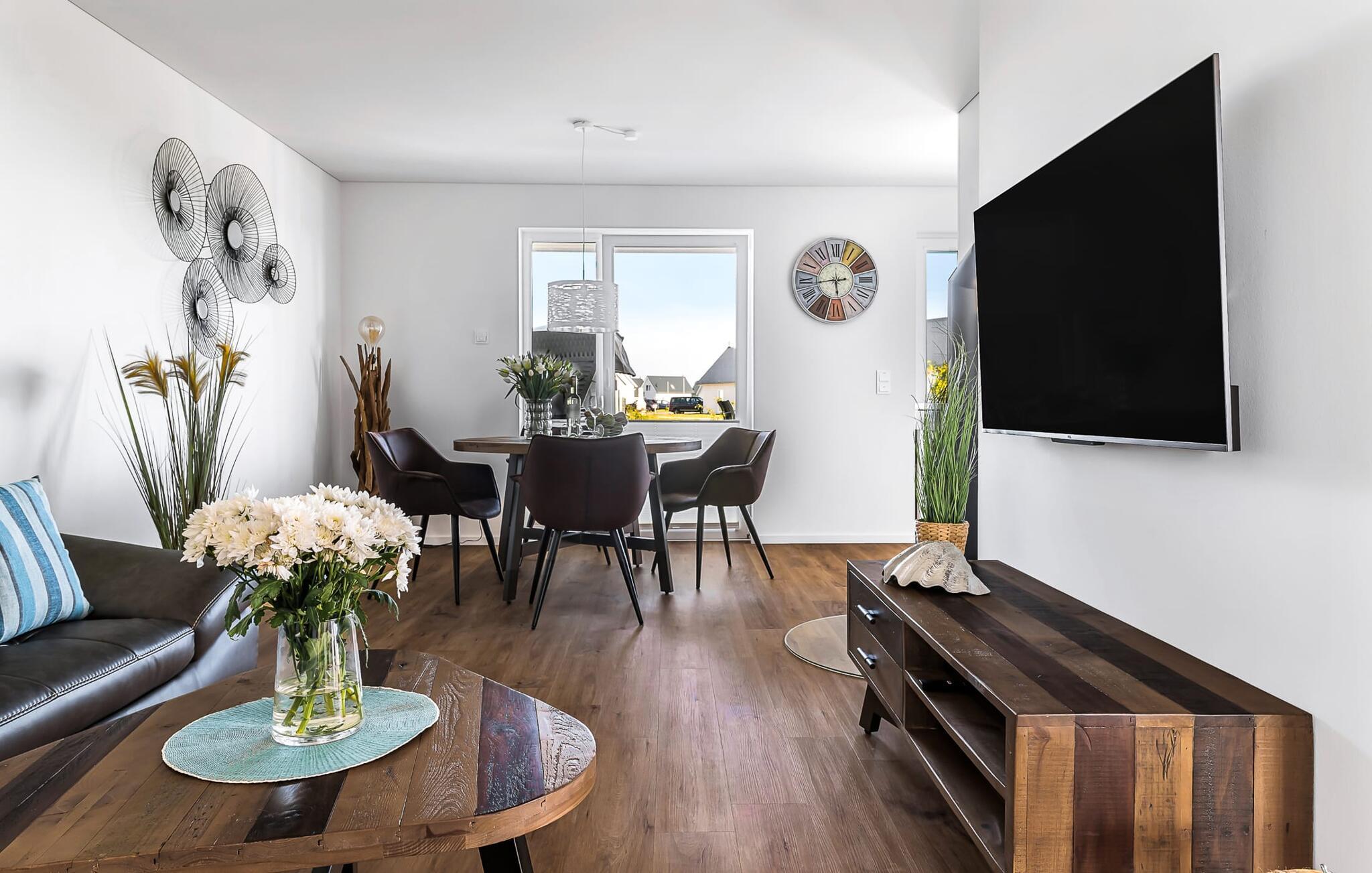 Det bliver romantisk foran pejsen i den hyggelige sofa. WiFi og Smart TV med Telekom Home Entertainment-program sørger også for indendørs underholdning.