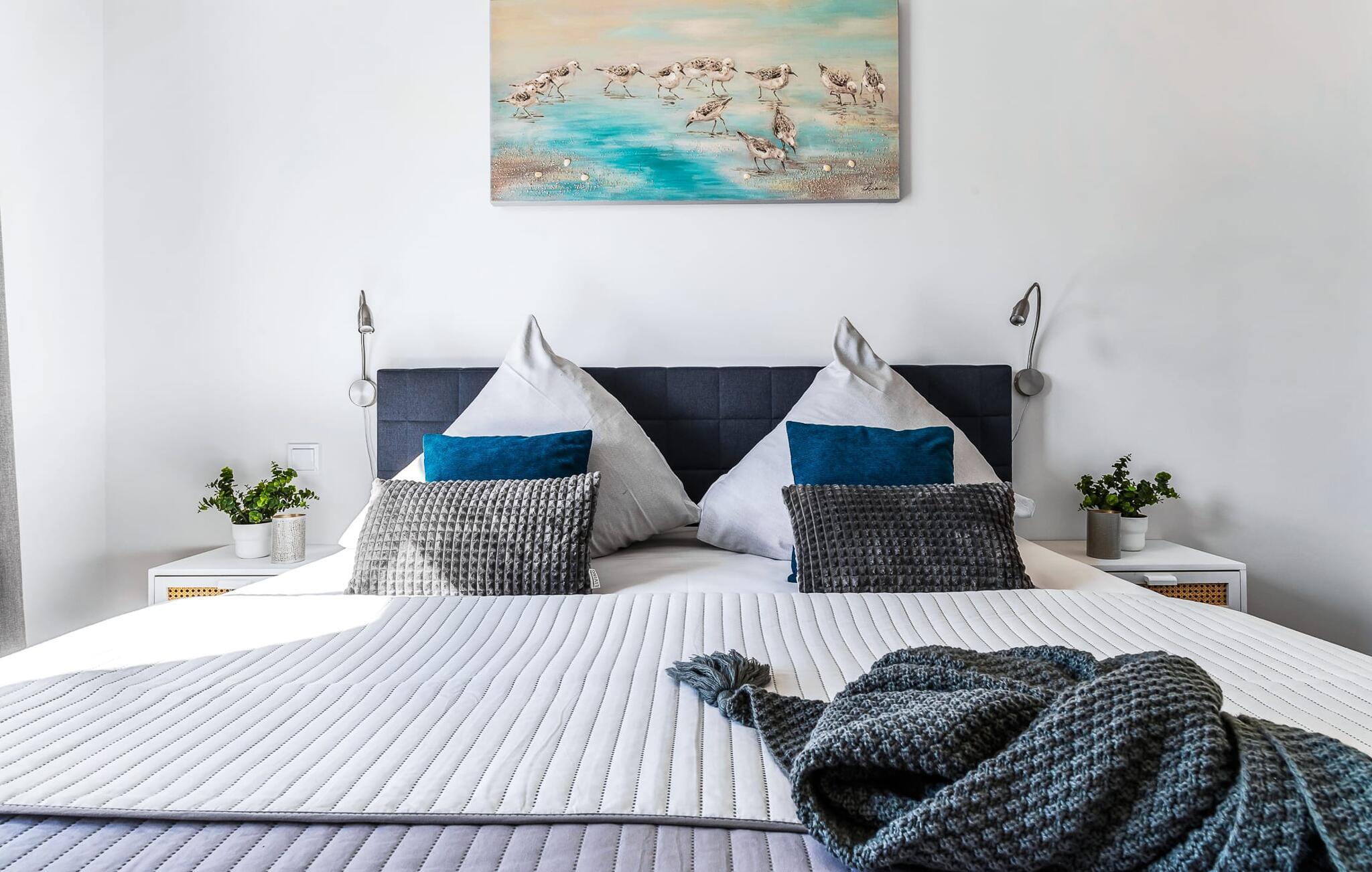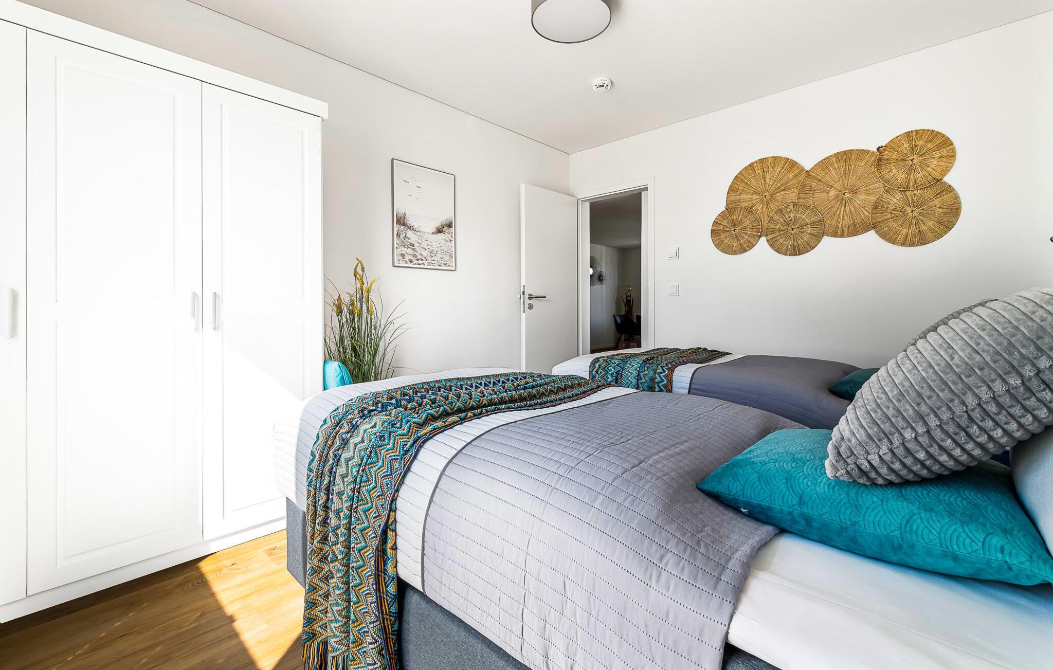 Det store soveværelse er udstyret med en stor boksmadrasser og et fjernsyn. Her er garanteret afslappende timer! Det andet soveværelse tilbyder jer ekstra soveplads med to enkeltsenge med springmadrasser.
