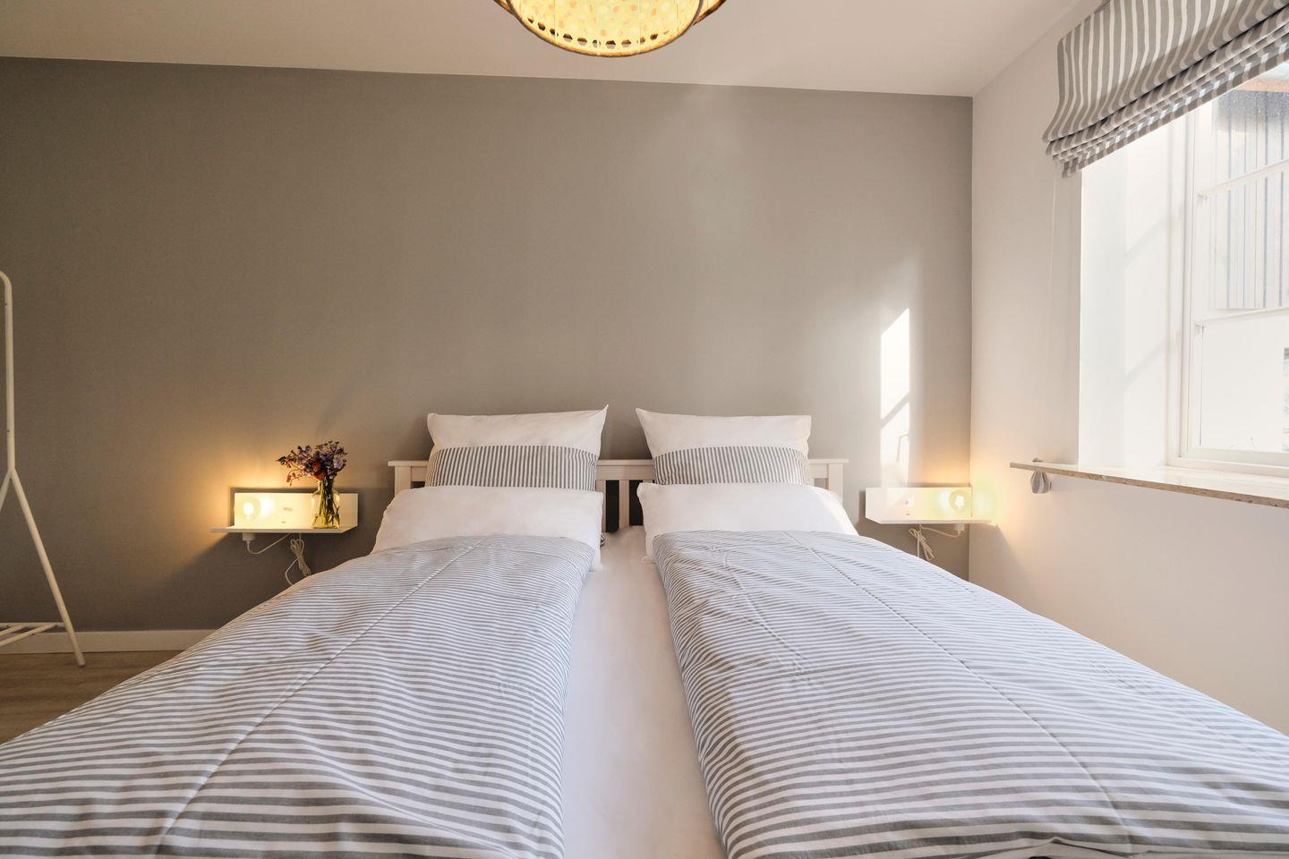 Die 5 -Zimmer-Wohnung ist mit zwei Doppelbetten, zwei Einzelbetten und einem Etagenbett ausgestattet. Sie kann mit bis zu 8 Personen bewohnt werden, Nutzung von WLAN ist kostenfrei möglich. Die moderne und voll ausgestattete Einbauküche ist ideal für Selbstversorger. Die Wohnung verfügt über ein neues Duschbad mit WC.