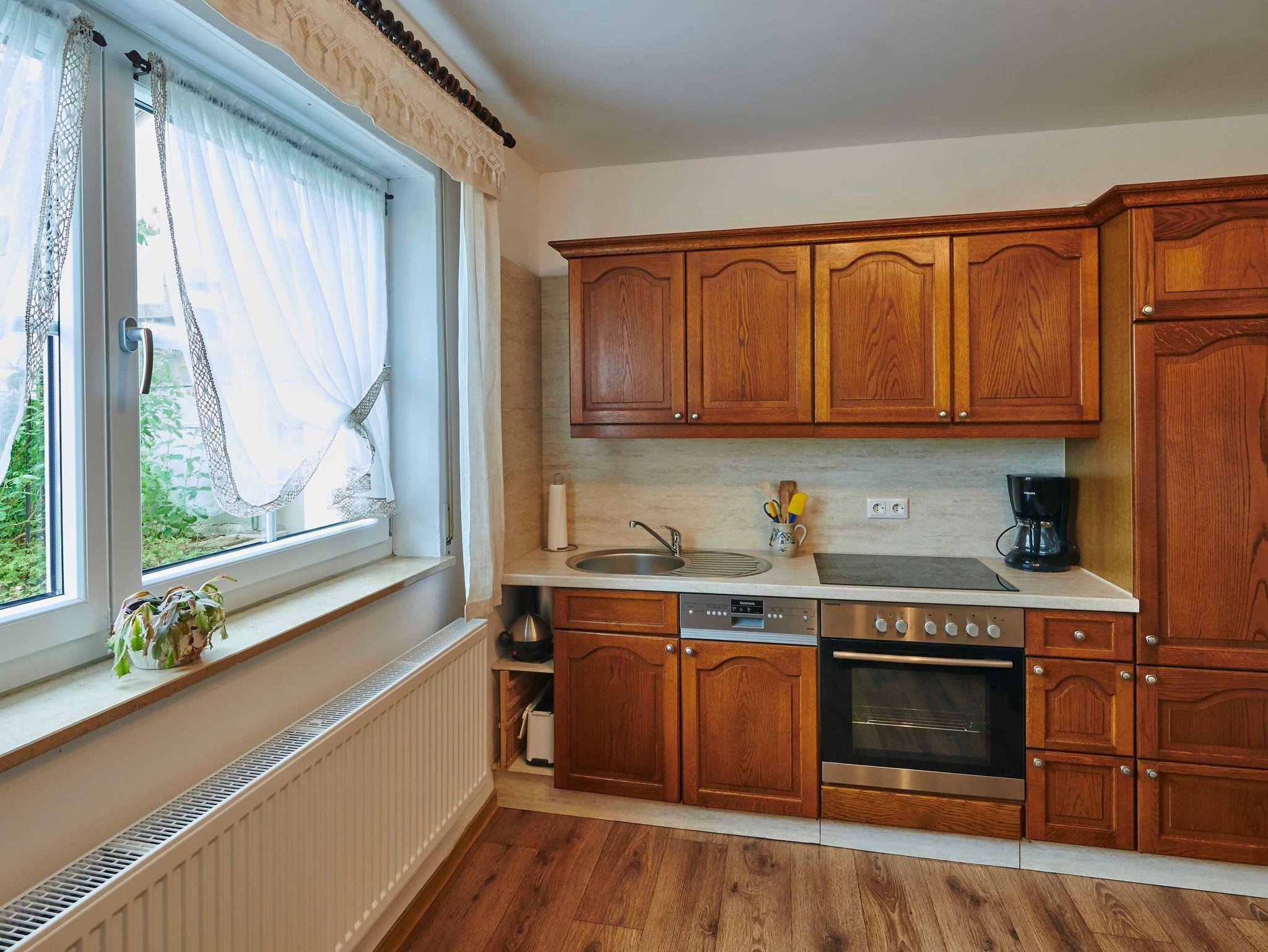 Toaster, Eierkocher, Kaffeemaschine, Wasserkocher, Standmixer, Handrührgerät, Stabmixer, Brotschneidemaschine, Gewürze, Eierkocher, Geschirrtücher, Radio/CD-Spieler, an der Heizung befindet sich ein kleiner Wäscheständer zum trocknen der Geschirrtücher. Bügeleisen,
