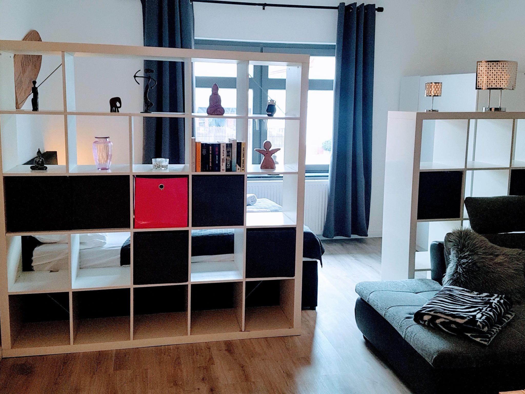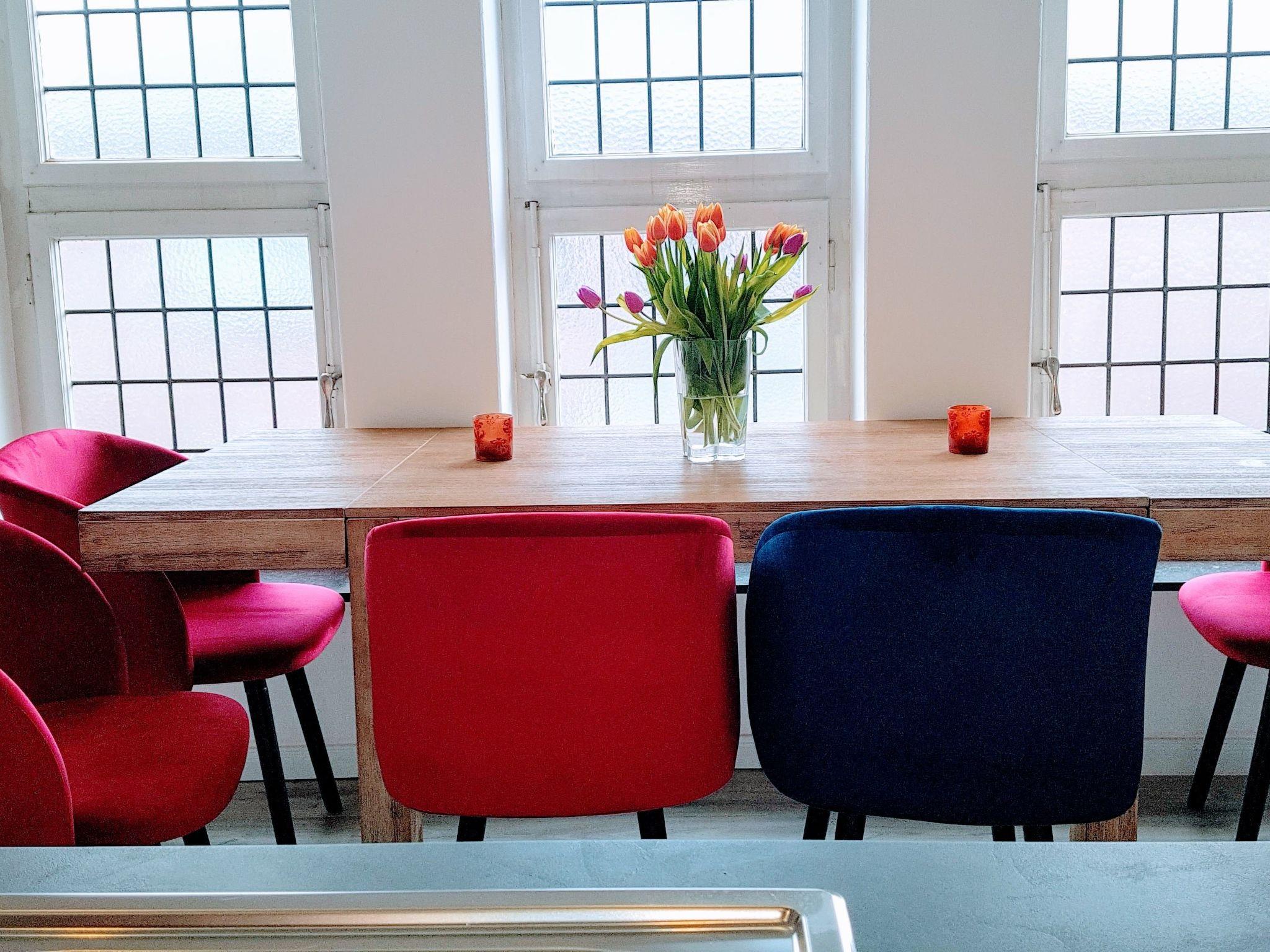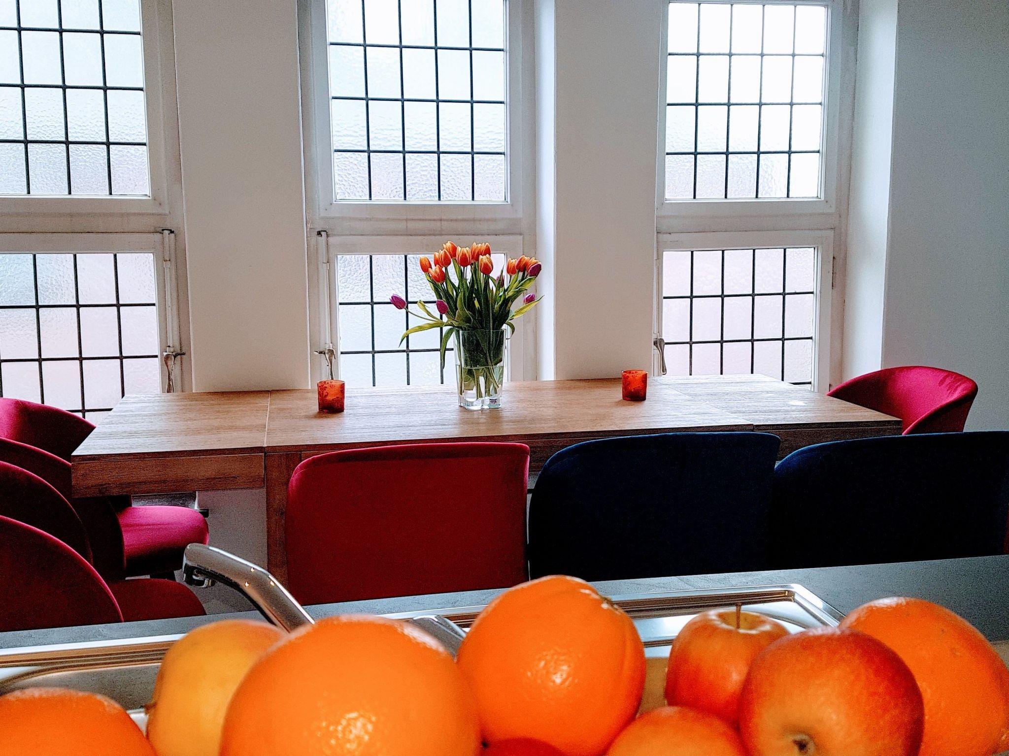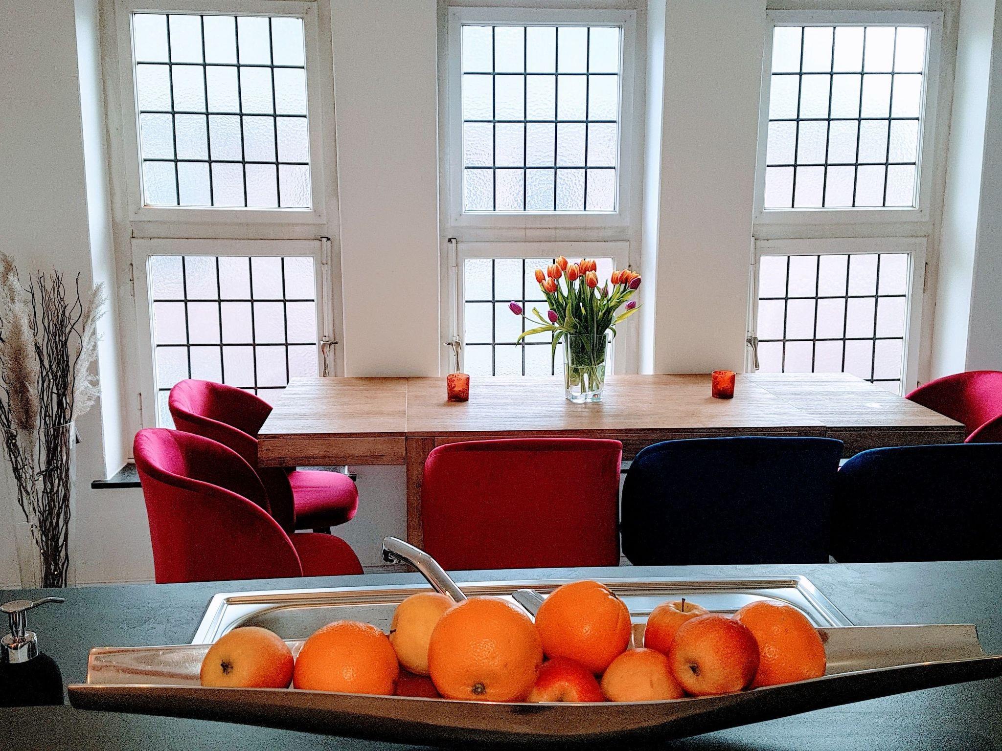3 rooms, open kitchen with seating area, fully equipped with 3 large double beds etc. for a suitable stay of groups, families or for business meetings.The accommodationThe flat on the 1st floor is 90sqm and has a separate entrance.On the own floor there are 2 bedrooms, 1 living room (with separate sleeping area), open kitchen, living-dining area, balcony, hallway and a HWRThe access to the 1st floor is via a separate staircase.The flat has everything you need for a longer stay.