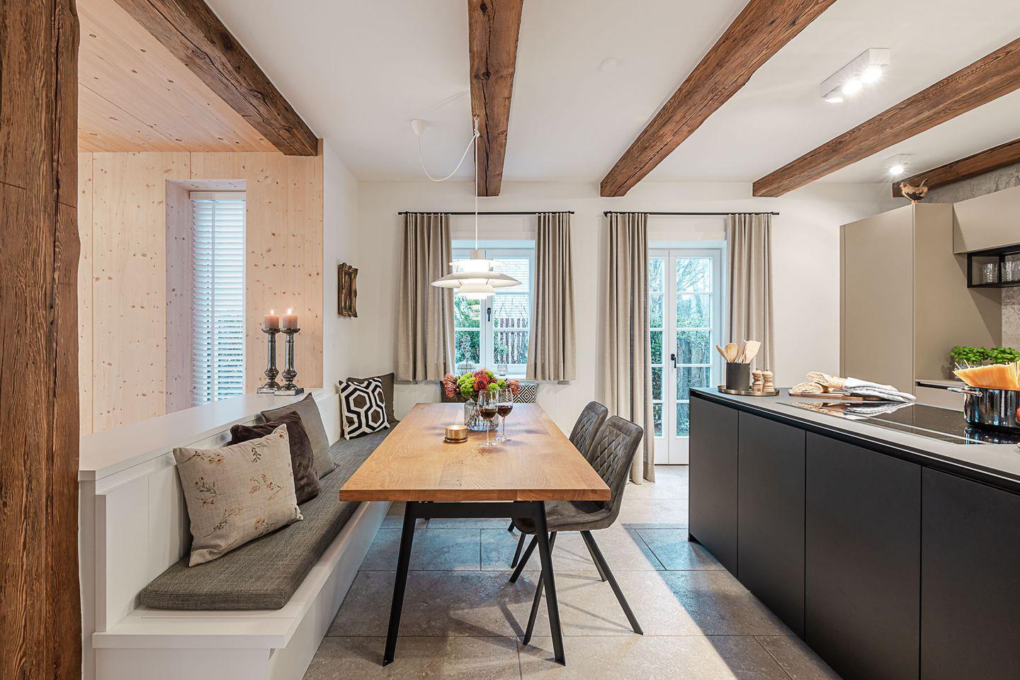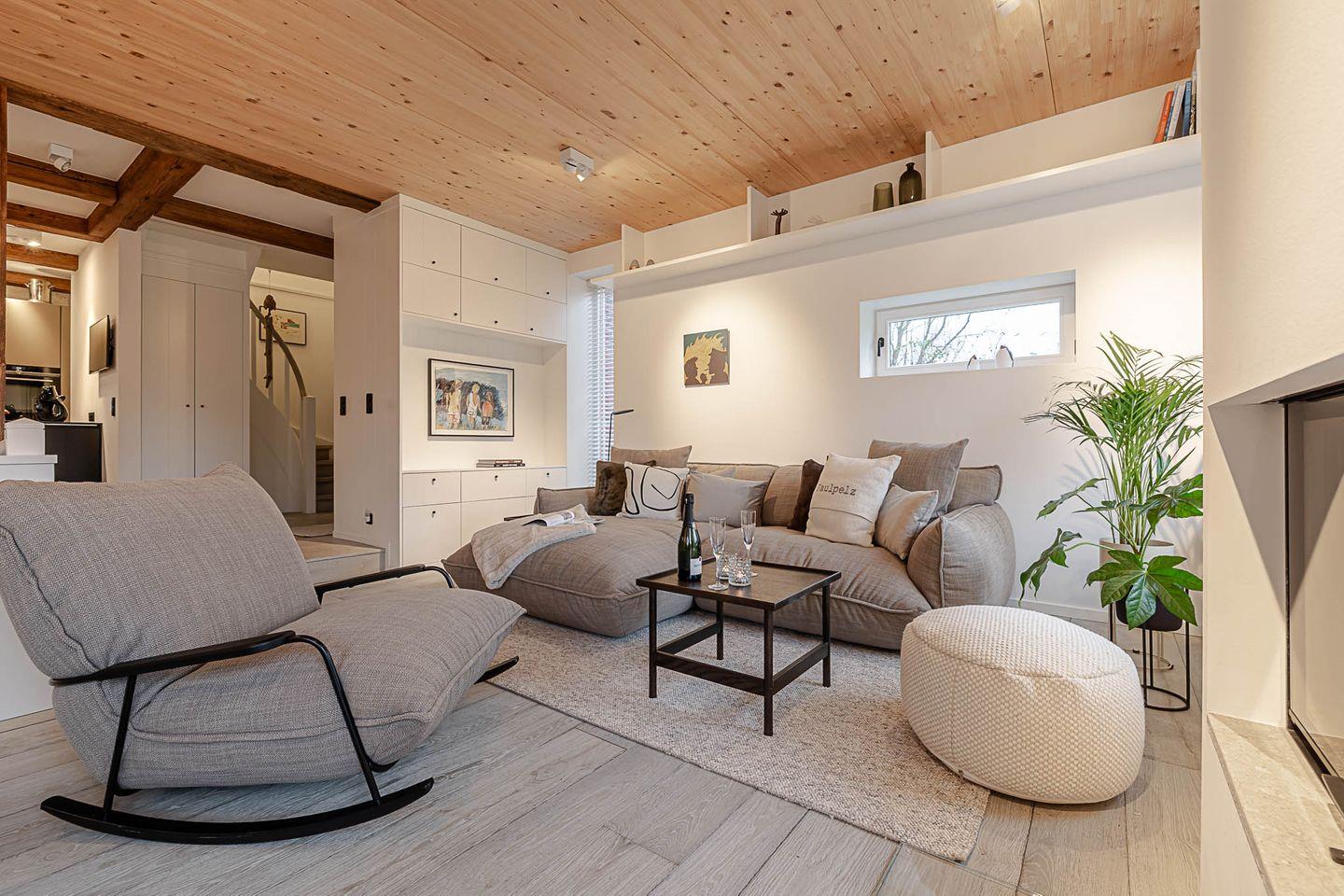 Im Erdgeschoss erwartet Sie ein lichtdurchfluteter Wohn-Essbereich, der mit einem stilvollen Holzkamin ausgestattet ist – perfekt für gemütliche Stunden, in denen die Zeit stillzustehen scheint. Hier können Sie entspannen und die wohlige Wärme genießen, während Sie den Tag ausklingen lassen. Die offene, hochmoderne Küche ist ein wahres Paradies für jeden Hobbykoch, ausgestattet mit besten Siemens-Geräten, darunter ein Backofen mit integrierter Mikrowelle, Induktionskochfeld, Geschirrspüler und ein Kühlschrank mit Gefrierfach – alles, was das Herz begehrt.