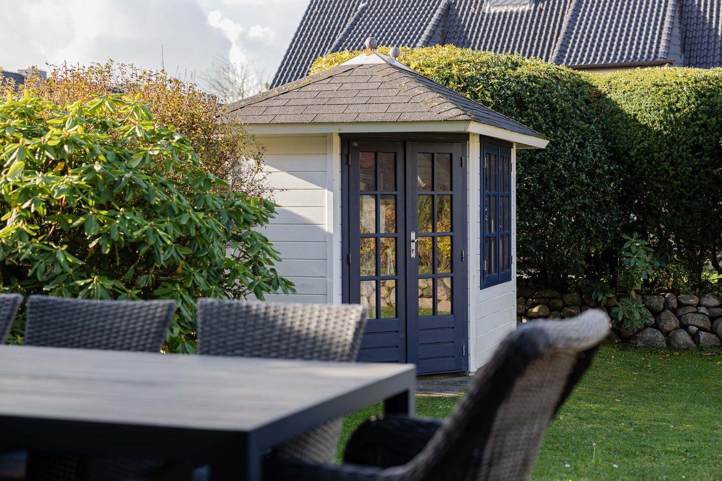 Draußen rundet der liebevoll angelegte Garten das Gesamtbild ab: eine sonnige Terrasse, ein eigener Strandkorb und viel Grün. Bitte beachten Sie, dass das Gartenhaus privat ist und nicht zur Nutzung zur Verfügung steht. Fahrräder können bequem im Garten abgestellt werden, und ein Privatparkplatz befindet sich direkt am Haus.