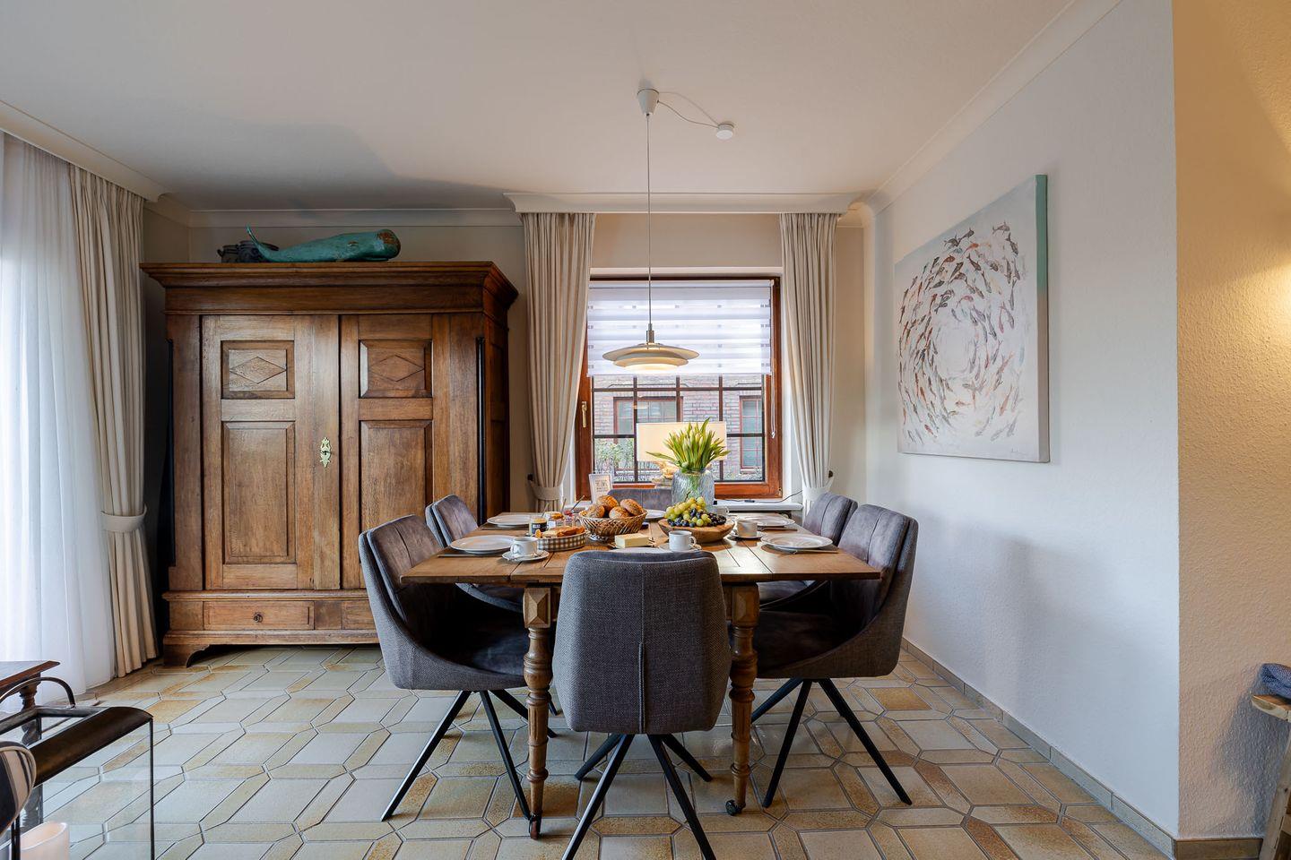 Schon im Erdgeschoss zeigt sich, warum dieses Haus den Namen „Friesenherz“ trägt. Der helle Wohn- und Küchenbereich öffnet sich direkt zur Terrasse und dem großzügigen Garten – ein grüner Rückzugsort, der im Sommer zum lebendigen Zentrum des Hauses wird. Frühstück zwischen Rosen, lange Nachmittage im eigenen Strandkorb, Grillabende mit Familie und Freunden oder ein Glas Wein in der Abendsonne: Dieser Außenbereich ist gemacht für Erinnerungen.