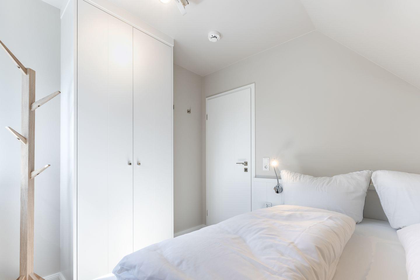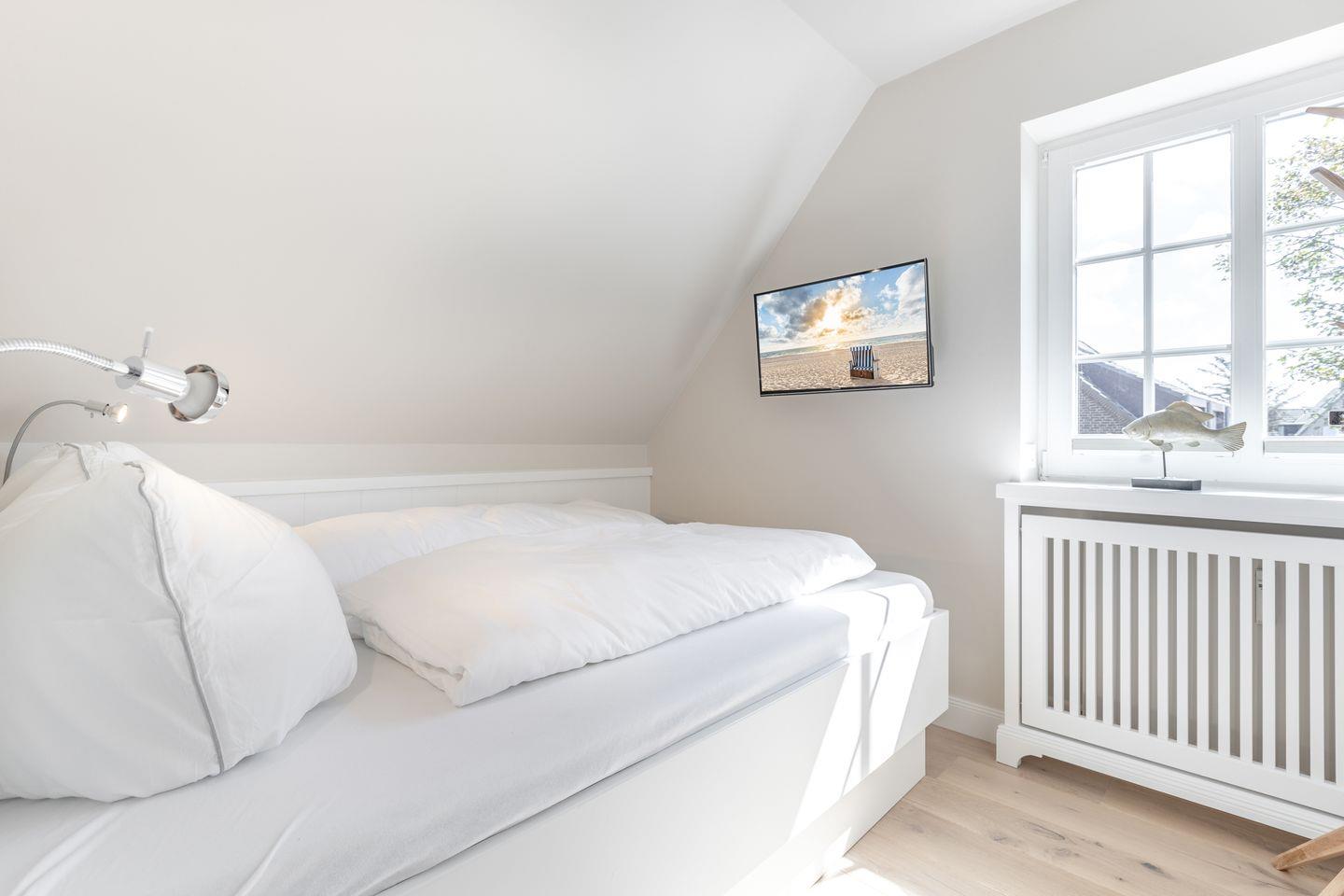 Helle Töne, feine Stoffe und stimmungsvolle Beleuchtung verleihen dem Raum wohltuende Ruhe. Ein Smart-TV und passgenaue Einbauten sorgen für zusätzlichen Komfort, während das große Dachfenster viel Licht und eine freundliche Atmosphäre spendet.