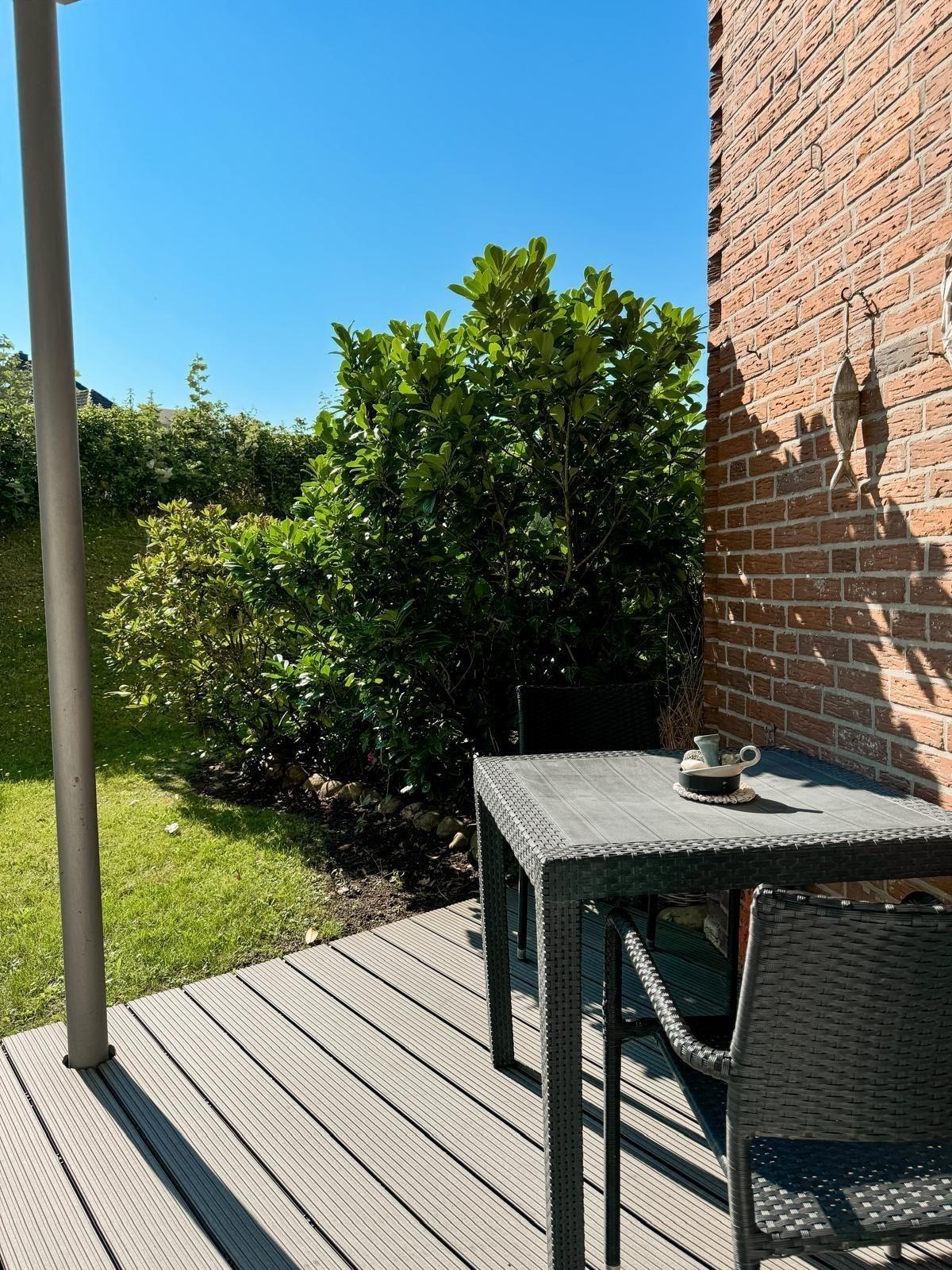 Freuen Sie sich auf eine private Terrasse mit eigenem Garten, eine Oase der Erholung.