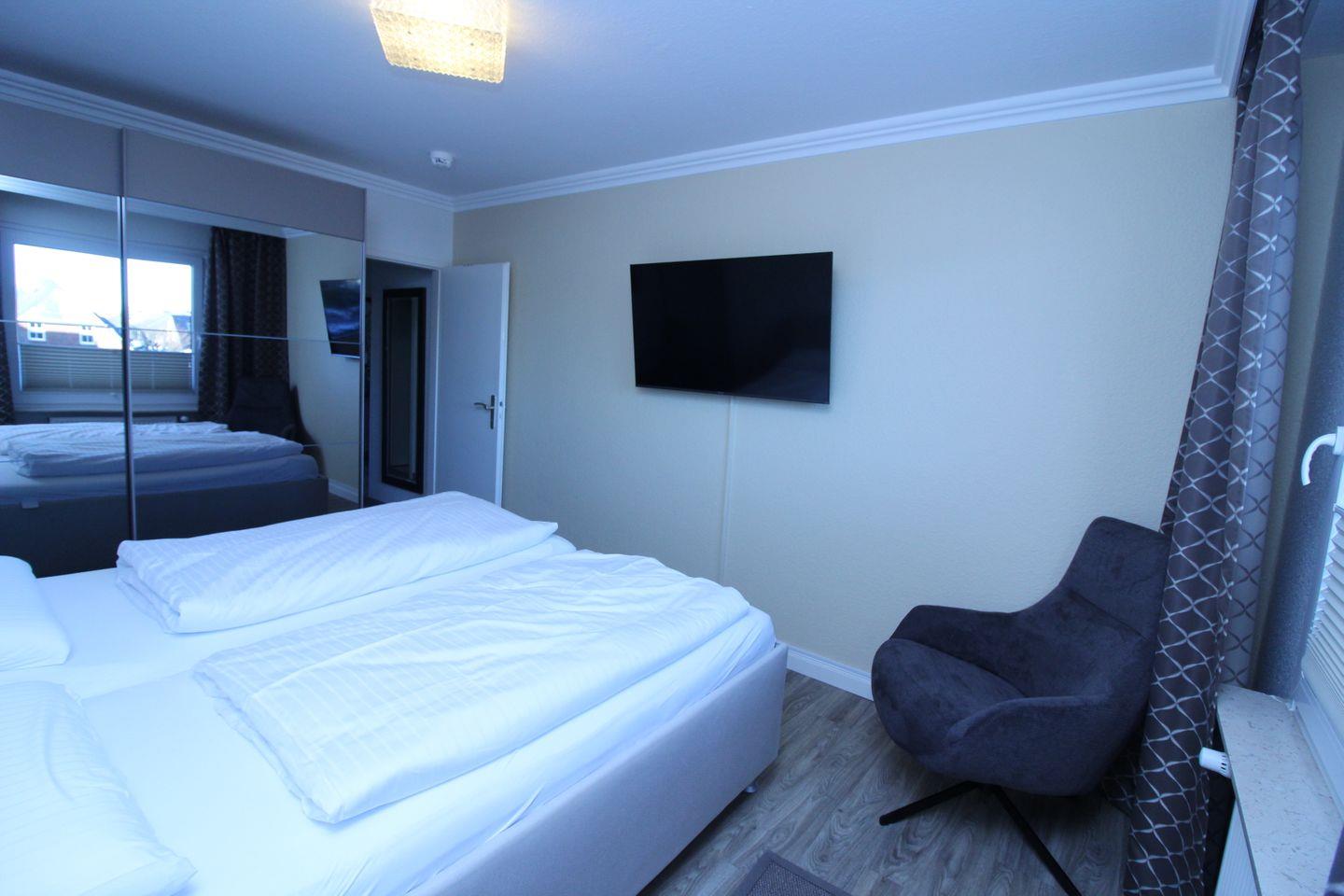 • Schlafzimmer: Komfortables Boxspringbett mit zusätzlicher TV-Anlage
